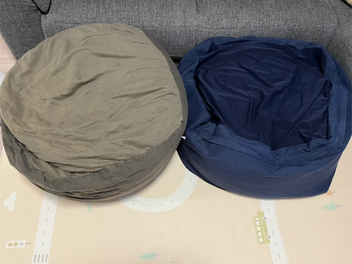 無印良品 ビーズクッション2個セットです 購入価格 本体価格 9,900円 カバー 3,990円 ・色:ネイビー、カーキ ・状態:使用感あり、シミあり 購入は3〜4年ほどですが、使用期間は数ヶ月かと思います。 へたってますがまだまだ全然使用できます。 カバーは洗って本体も日干し済みです。 中古品であることご了承ください