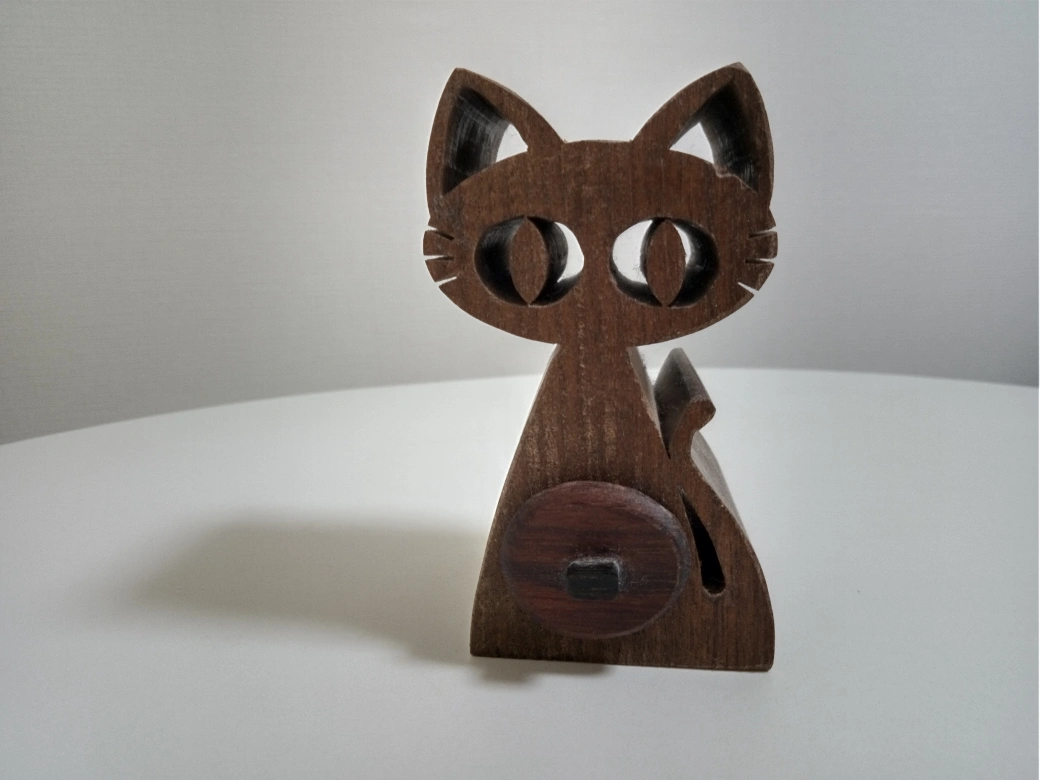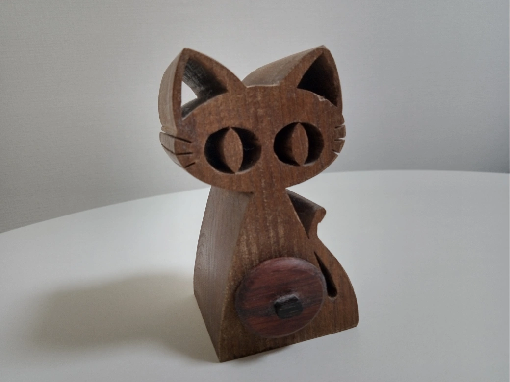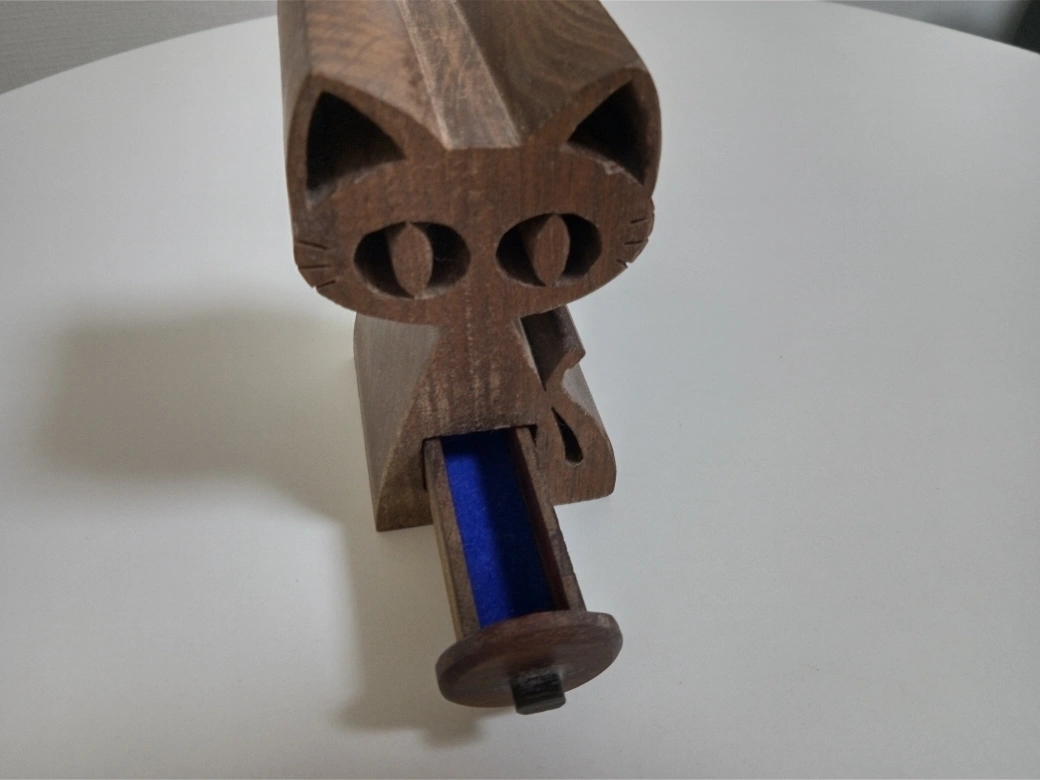 木彫りの猫の小物入れです。 ・色:茶色 ・素材:木 ・猫のデザイン ・引き出し式の小物入れ付き ・使用感少なめ 5 ( 幅 ) × 9.5 ( 一番高い所の高さ ) × 5 ( 奥行き ) 引き出し 1.5 ( 幅 ) × 5 (奥行き )センチ 世田 谷のボロ市で購入。 オマケで木彫りのキーホルダーを付けて貰ったのが嬉しかったです。 引き出しが小さくて可愛い。 何を入れていいのか悩み、 大吉のおみくじなどを入れてました。 中古品であることご了承ください。
