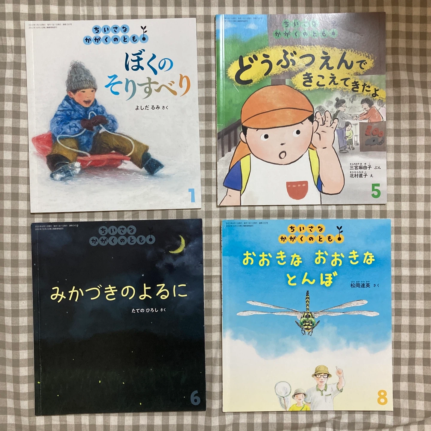 「ちいさなかがくのとも」絵本4冊セットです ・ぼくのそりすべり(2023年1月発行) ・どうぶつえんで きこえてきたよ(2022年5月発行) ・みかづきのよるに(2022年6月発行) ・おおきな おおきな とんぼ(2021年8月発行) 薄い本なので若干の使用感はありますが、中は綺麗で、目立った傷や汚れはありません 中古品であることご了承ください