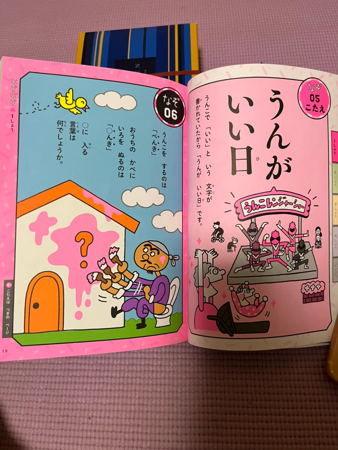 小学1年生向け なぞなぞ絵本 オールカラーで、ページ全面に絵があり、漢字にはふりがなあり。飽きずに読めると思います。 うまく写真に撮れず申し訳ありませんが、表紙に折り目が1本あります。 中身はきれいです。 受け渡し場所、ご相談ください。