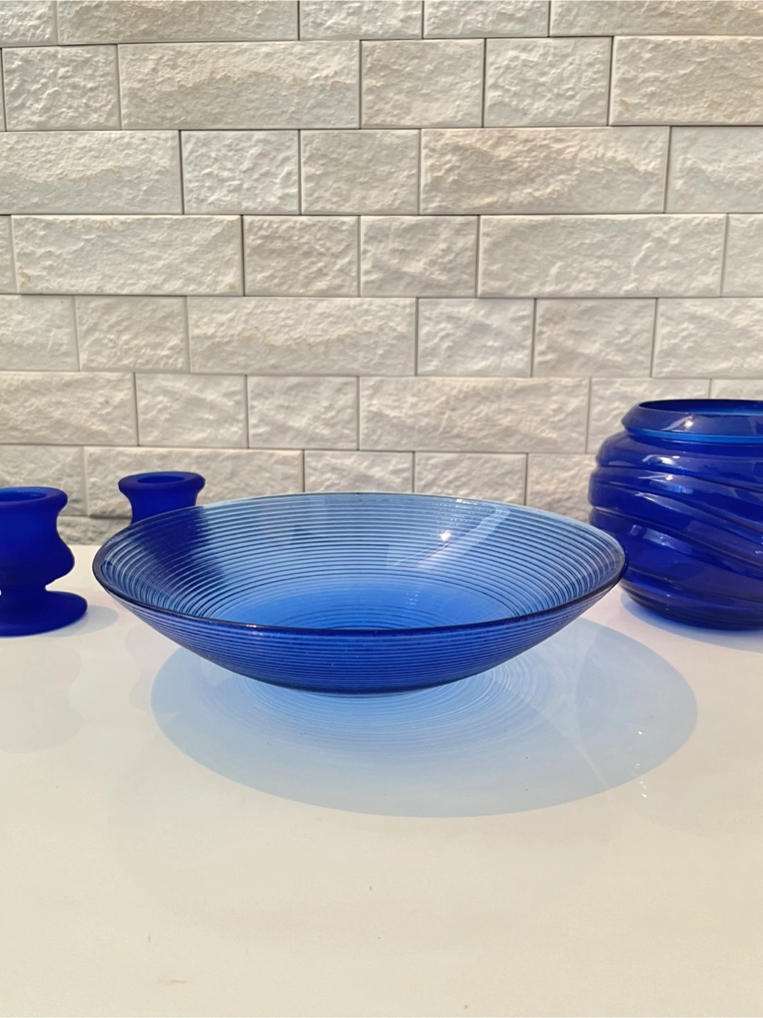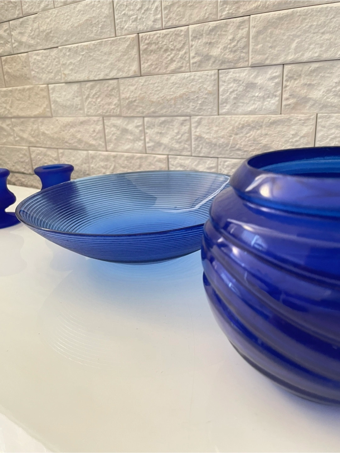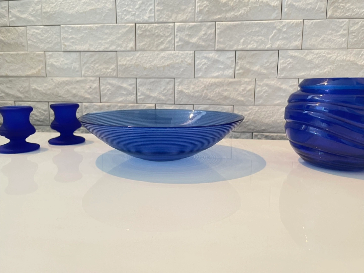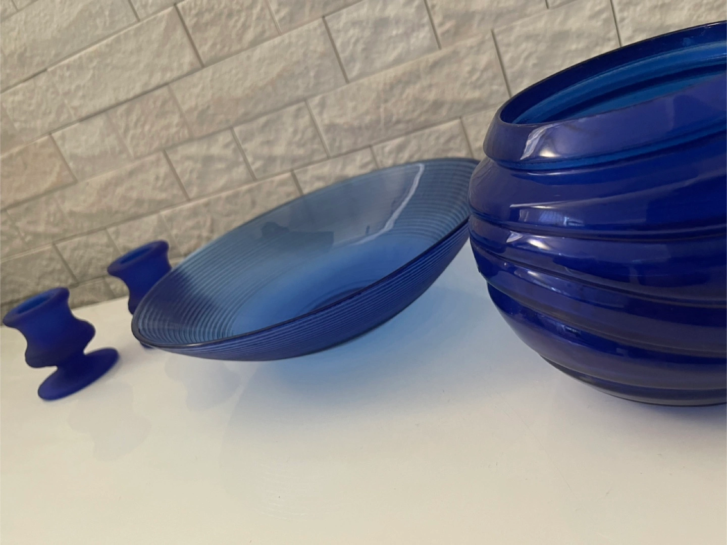 スタイリッシュなコバルトブルー ガラス製 硝子 サラダボウル・キャンドル・キャニスター 3個セット キャンドルとキャニスターは米国にて20年前にデザインショップにて購入したもので大事に保管してありました。 サラダボウルもデザイン関係の知人にお譲りしていただいたもので、スタイリッシュ、お洒落ゆえに我が家の生活では使う機会がなく、飾り棚に飾っておりました。 中々出回らない色とものになると思いますので、お高めに設定させていただいております。 素敵なコバルトブルーの大鉢セット サラダボウル、フルーツボウルなどもちろんのこと、植栽や金魚鉢などにもいかがでしょうか。 破損しないよう梱包に配慮して送らせていただきます。未使用ですが、三つとも気づかない程度に本当に小さなひっかきキズのようなものがあります。またキャンドルは裏面にシールの剥がれ、キャニスターは椀の縁が少し剥がれている程度で、 ボウルは仕様にてほんの少し気泡がみられますが、こちらもよく見なければわからない程度です。ご理解のうえご検討く ださい。 #サラダボウル #お椀 #ガラスボウル #フルーツボウル #食器 【お渡し場所】ファミリーマート大田千鳥3丁目店前 【取引日時】金曜、日曜を除いた平日昼間〜夕方まで 監視カメラがある場所なので夜でもかまいません。 上記の条件に合わせてくださる方を優先させていただきます。(早いもの勝ちではありませんのでご了承ください)