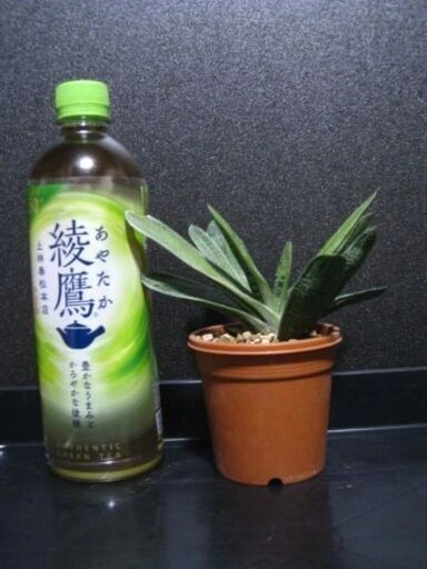 多肉植物 ガステリア リトルワーティー 南アフリカ原産の多肉植物で、葉に細かいドット状の斑が入り、肉厚でザラザラした感触が特徴です。耐陰性があり丈夫で、初心者でも育てやすい品種で、室内でも管理できます。 大きさの参考に横に600mlのペットボトルを置いています(付属ではありません)