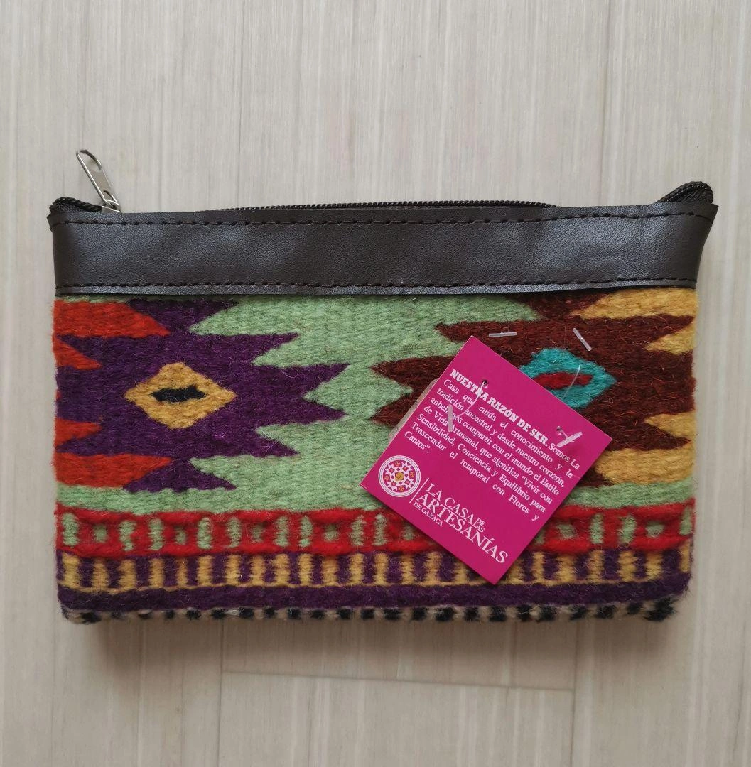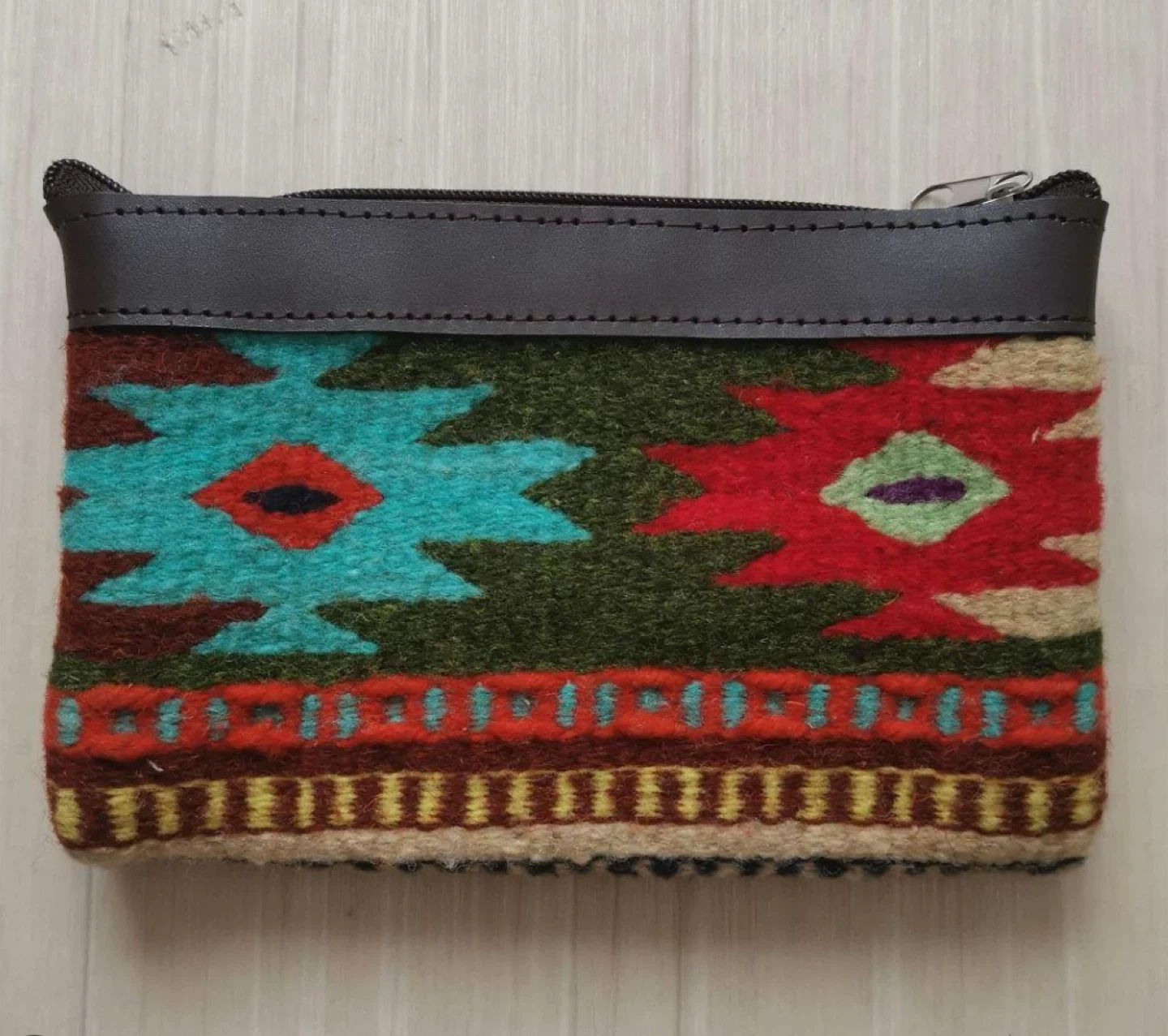ひとつひとつ天然素材で羊毛を染めて、手織りで仕上げた”タペテ”で作られた、ハンドメイドの温かみがあるポーチです。 表と裏で色柄が違って2種類の表情が楽しめます。 -デザイン:メキシコ南部のオアハカ州の先住民であるサポテコ族の伝統的な柄のタペテと上部に本皮、ファスナー付 - 内側: 四角模様の黒布/ポケット有り - サイズ:タテ12.5cm×ヨコ19cm ご希望の方はお気軽にご連絡ください。