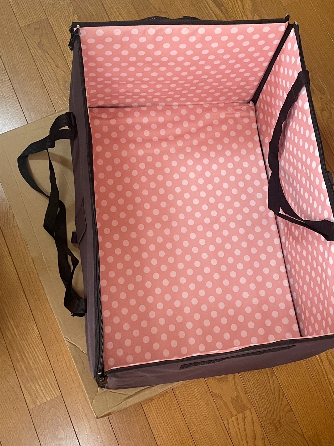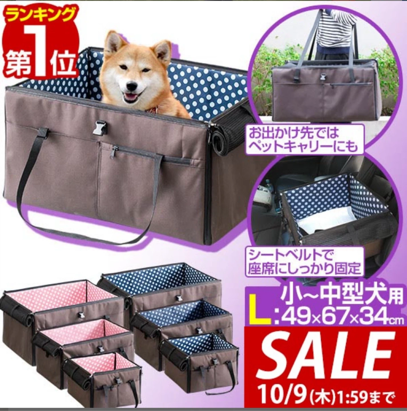 Lサイズのドライブボックスです。 中型犬〜大型犬用(49×67×34cm) 小さく折りたたみができ、メッシュの蓋を閉じればキャリーバッグにもなります。 ・色:焦茶、内側はピンクに白のドット柄 ・状態:新品未使用 我が家ではサイズが合わず、新品未使用です。 若干の砂埃汚れは、元購入先店舗に確認したところ倉庫保管時の際についたものだそうです。 ご不明点があればお気軽にご連絡ください