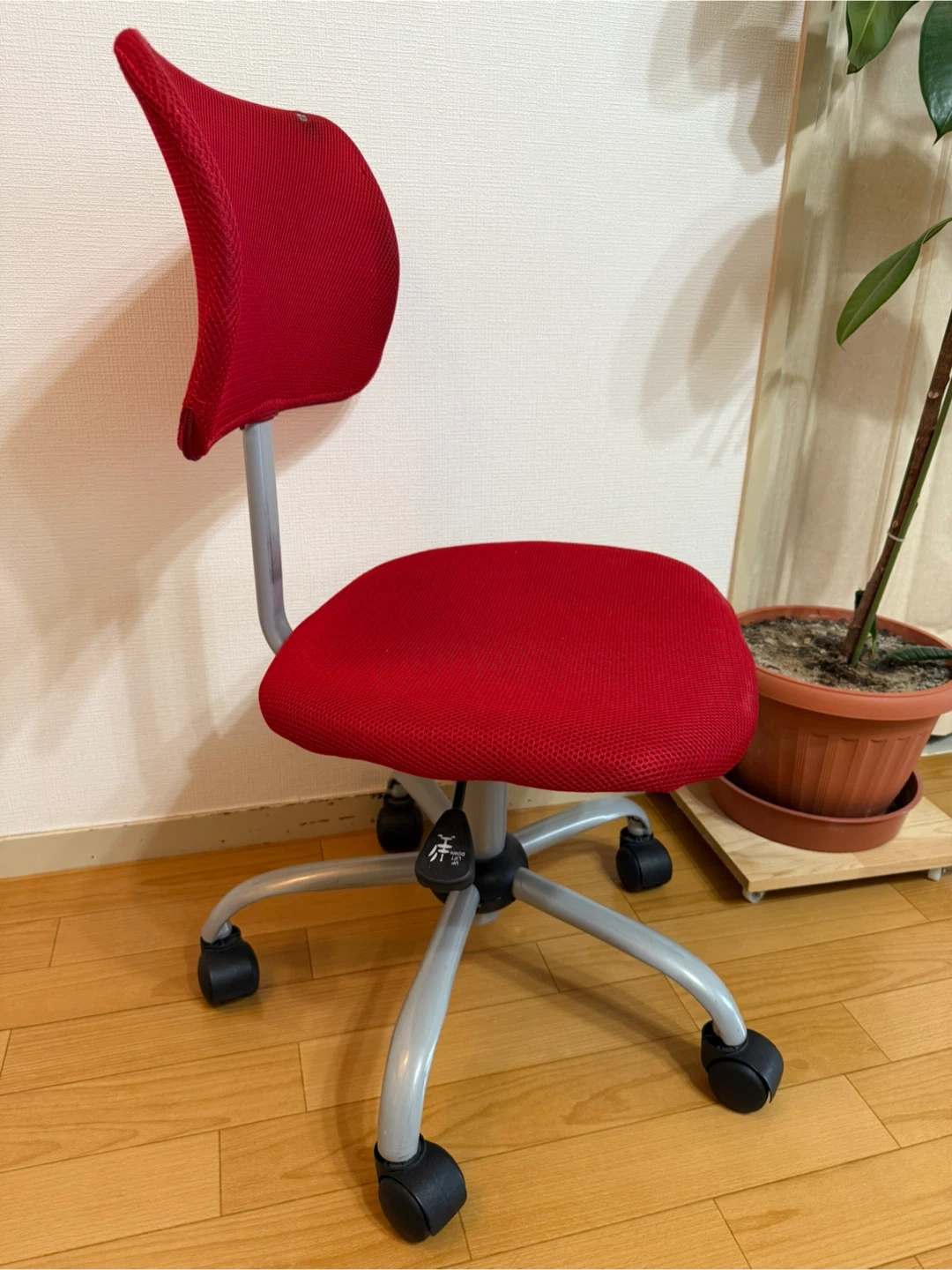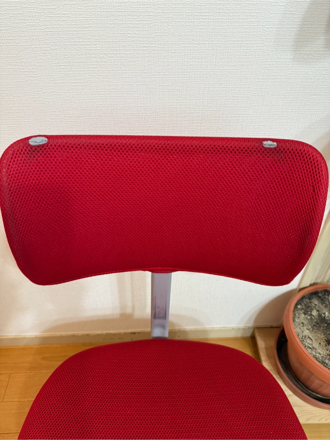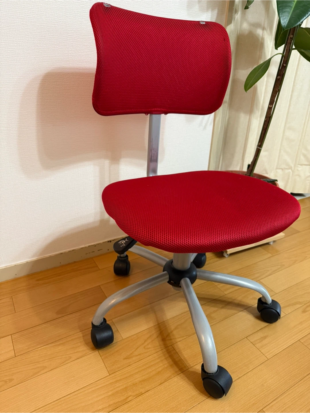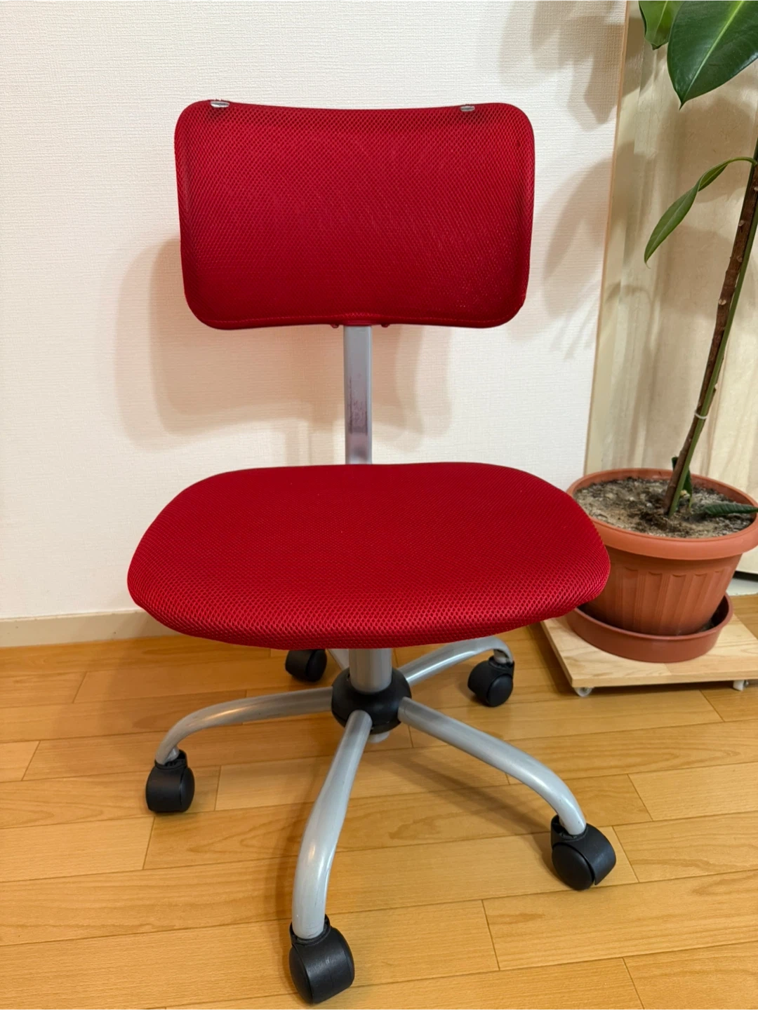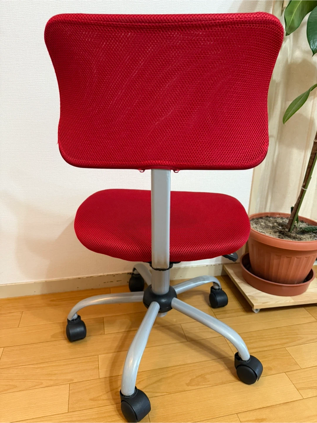 通気性抜群! 赤いメッシュ生地のキャスター付き昇降オフィスチェアです。 ・背とイス生地 : 赤色メッシュ ・鉄部分 : シルバー色 ・キャスター : 黒色 ・イスの高さ(昇降)調整できます。 ・背もたれ前後を変えれます。 ・リクライニングなし。 ・キャスター付き。 ・使用感あります。 ・背もたれ2箇所メッシュに穴がありますが(イスカバーをして使用してました)、イスの使用には全く問題ありません。 背もたれ 幅37、高さ23 イス 幅43、奥行39 キャスター(脚部分)直径52 背もたれから床までイスが 低い位置での高さ76 高い位置での高さ83 イスから床まで 低い位置での高さ37 高い位置での高さ44 ご不明点があればお気軽にご連絡ください。 ⚠️取りに来れる方でお願いします。
