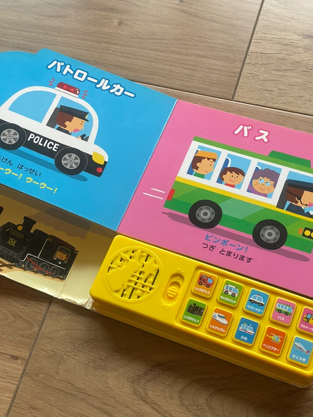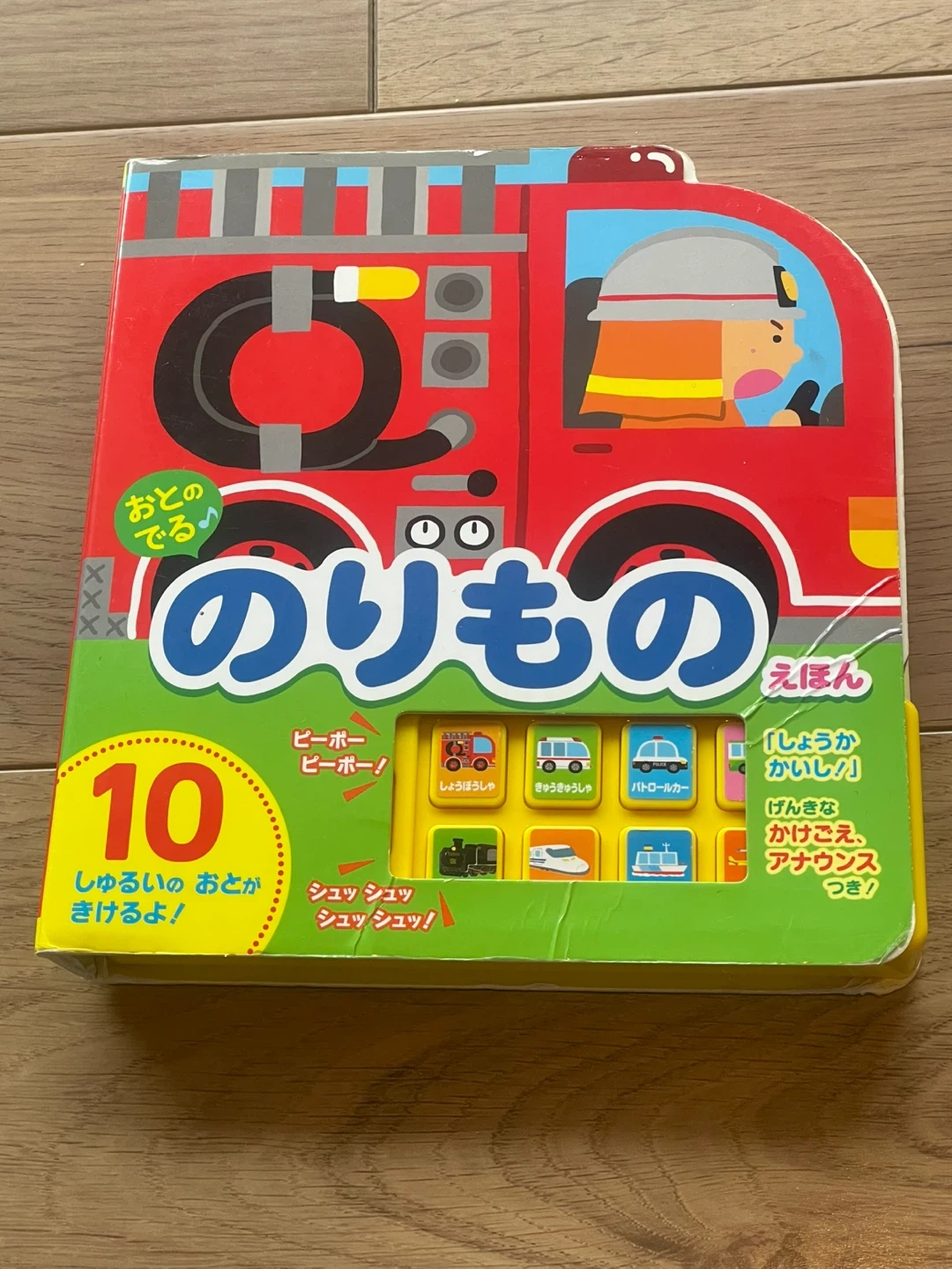 10種類の乗り物の音がする絵本です。 電池式で、全ての音が鳴ることを確認しています。 破れてはいませんが、 一部折れ曲がっているところがあります。 乗り物好きの息子は、気に入ってずっと鳴らして遊んでいました。 ご不明点があればお気軽にご連絡ください
