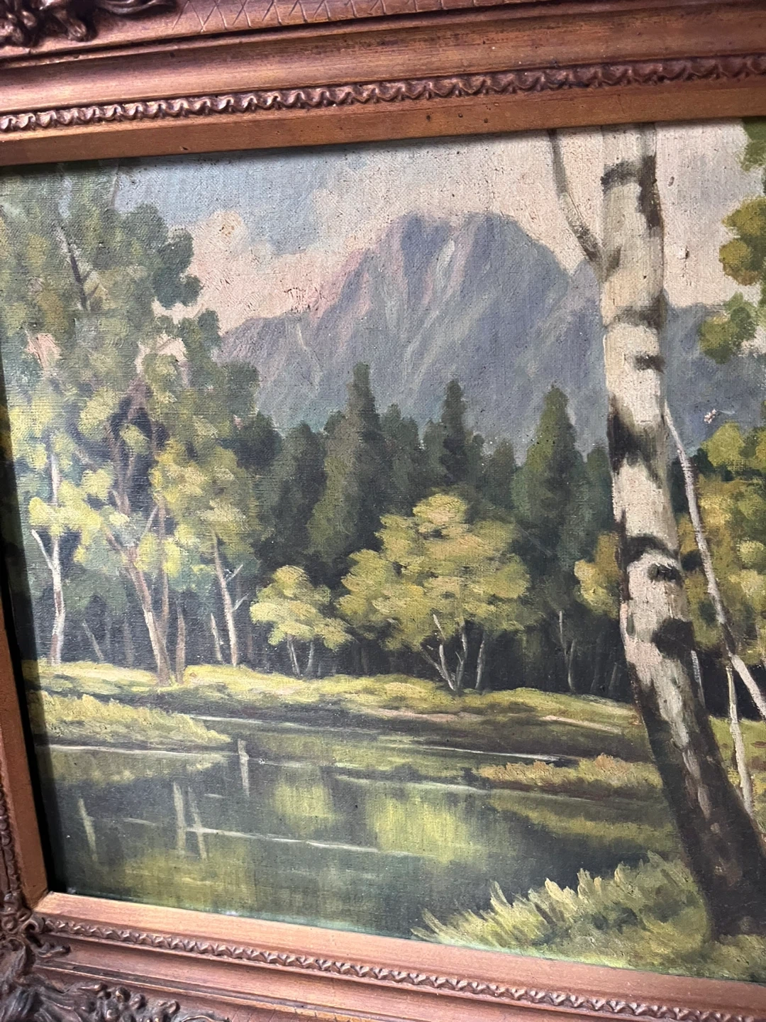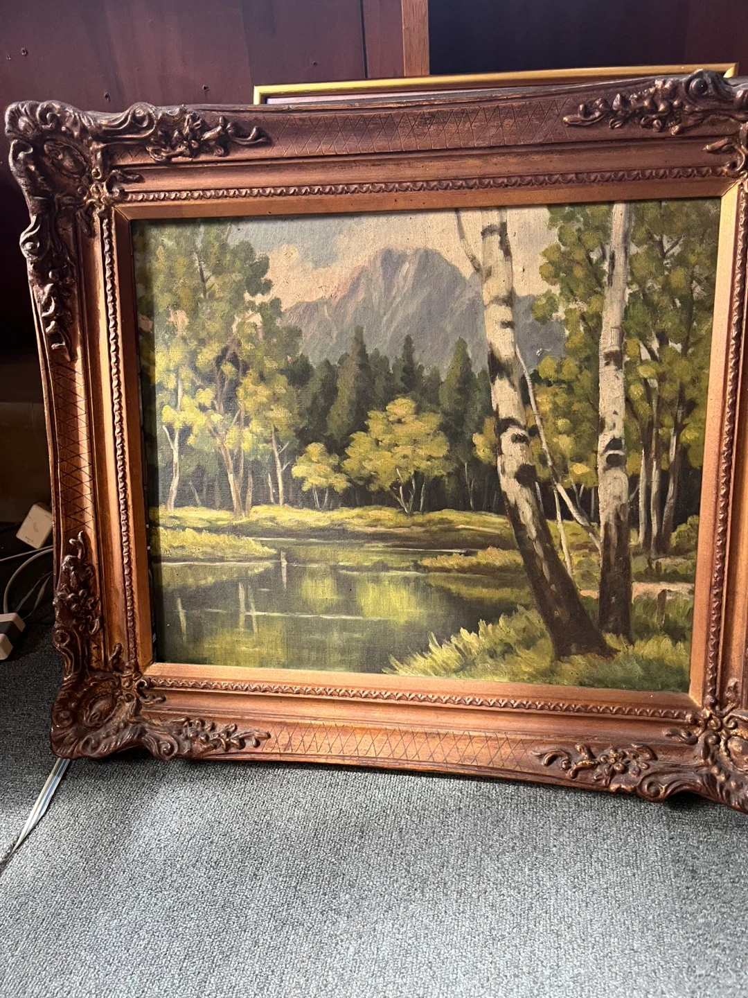 ご覧いただきありがとうございます。  湖、白樺、山々の風景画です、ら 保管品です。 ご了承頂ける方よろしくお願いします。