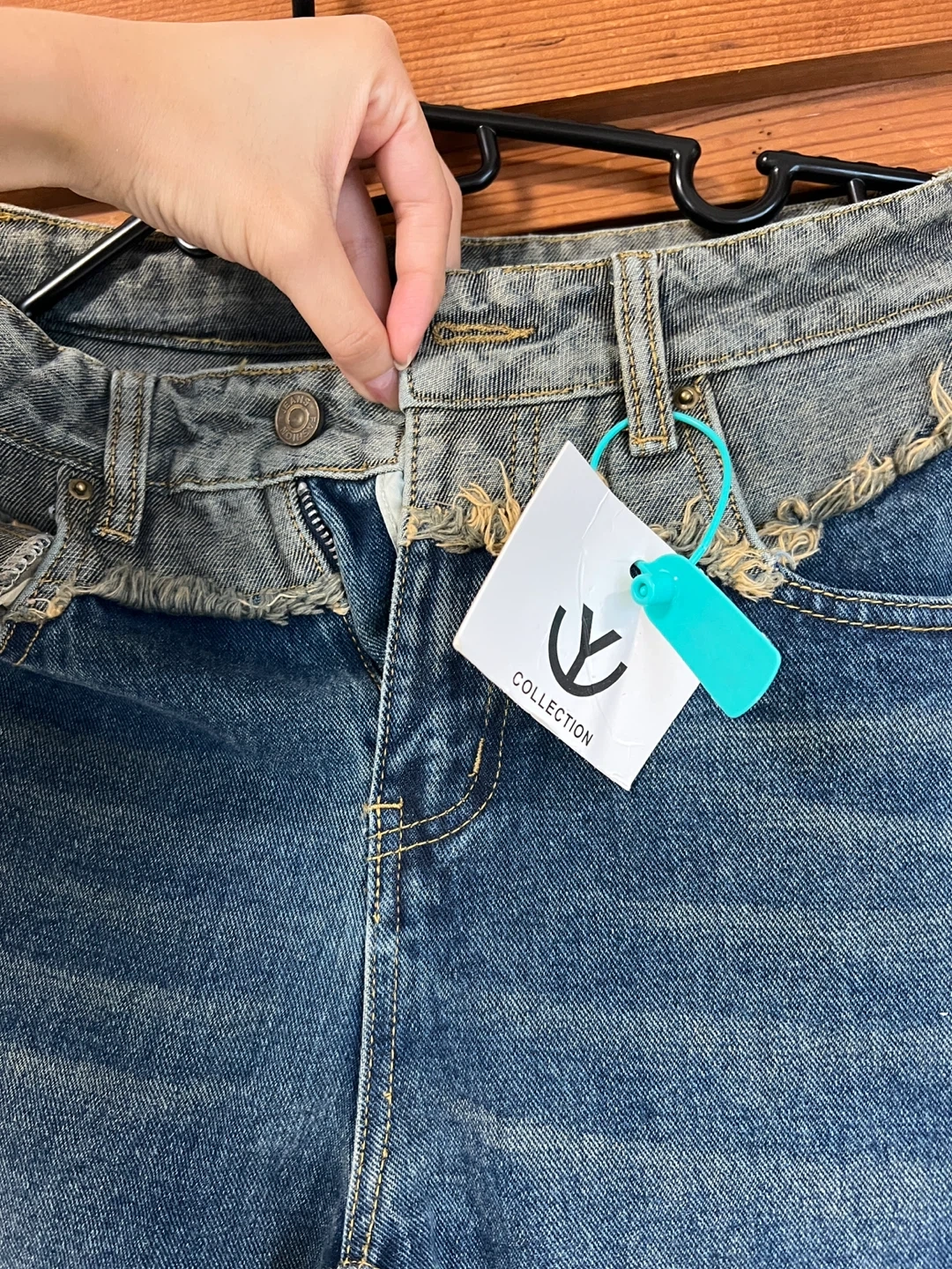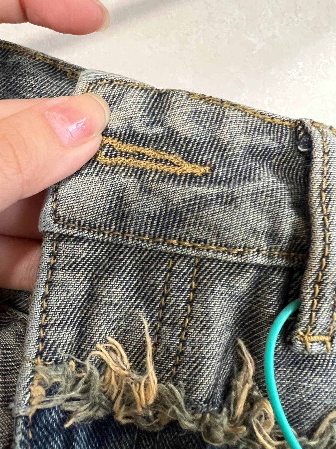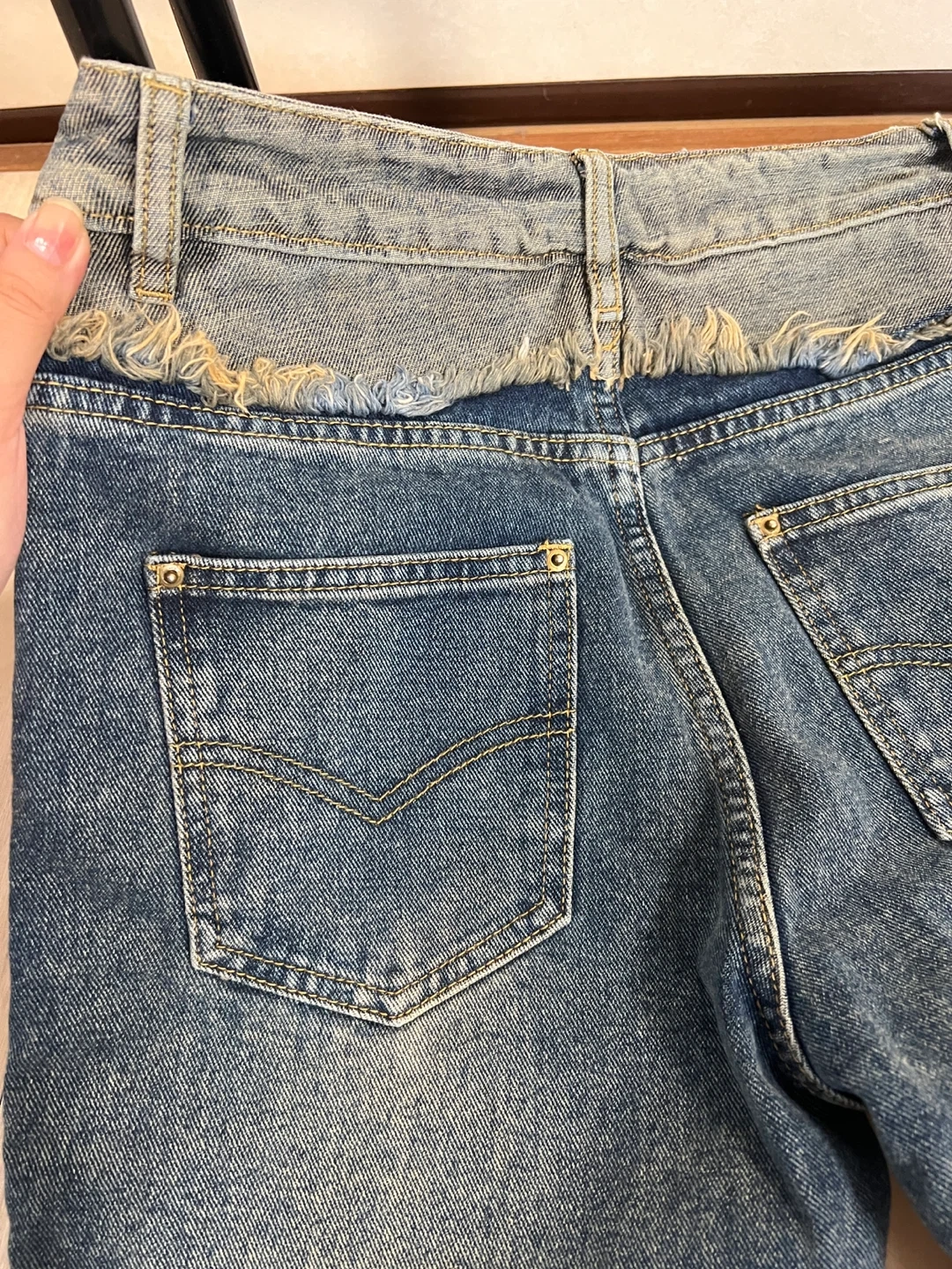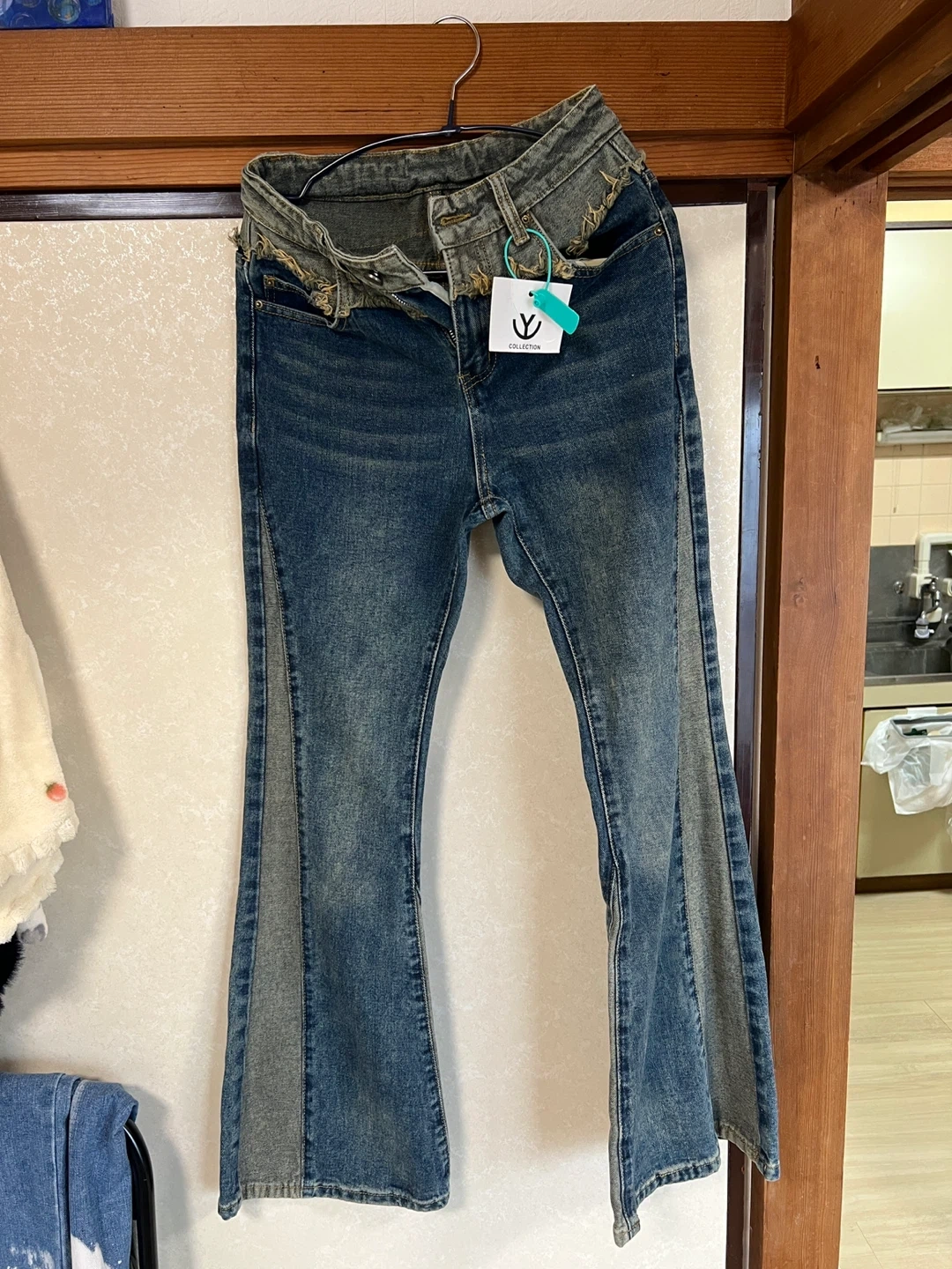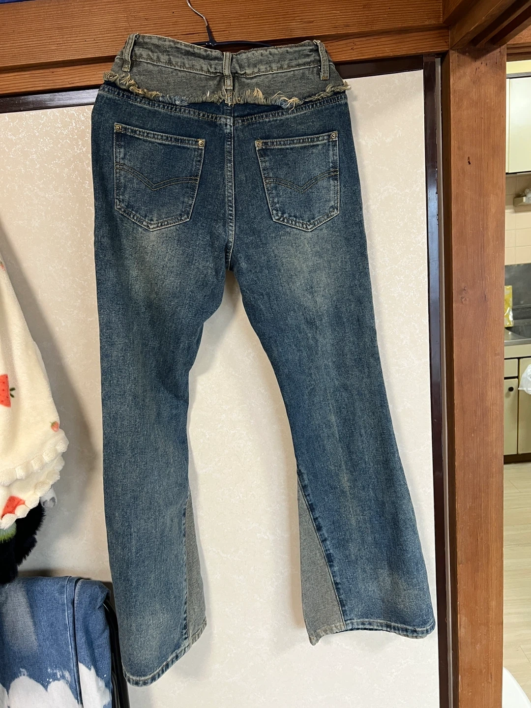 「新品」レディースデニムパンツです。 ・サイズ:155/58 ・素材:牛革を含む ・色:青系 ・年式:2022年製造 ・状態:使用感なし ご注意:未 使用のためズボンのボタン穴は開いていません。購入後、ご自身で切り開いてください。 特徴: このジーンズは、複数の要素が組み合わさったデザイン性の高い一本ですね。 色と生地のディテール (Color and Fabric Details) • 色落ち・ウォッシュ加工: 全体的にヴィンテージ感のある深いインディゴブルーが基調ですが、特にウエスト周りと脚の外側・内側の一部に、ブリーチ(脱色)されたような薄いグレーがかったデニムが使われています。この濃淡のコントラストが非常に目を引きます。 • アシンメトリーなウエスト: ウエストバンドの部分は、濃いデニムと薄いデニムが段差をつけて縫い合わされているように見え、**切りっぱなしのフリンジ加工(ほつれたような加工)**も施されており、ローライズとハイライズが融合したような、独特でパンクな雰囲気があります。 • パッチワーク/切り替えデザイン: 裾にかけてのラインや、ウエスト部分に、色の異なるデニム生地が切り替え(パッチワーク)で大胆に使われています。特に裾に向かって広がるフレア(またはベルボトム)のシルエットが、この切り替えによって強調されています。 シルエットとスタイル (Silhouette and Style) • シルエット: 膝から裾にかけて広がる**フレアカット(またはブーツカット)**で、脚長効果が期待できる、スタイリッシュなシルエットです。 • 全体の印象: 全体としては、Y2Kファッションやリメイク・カスタムアイテムのようなエッジの効いた、個性的なストリートスタイルを感じさせます。