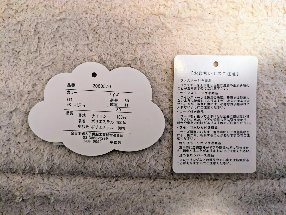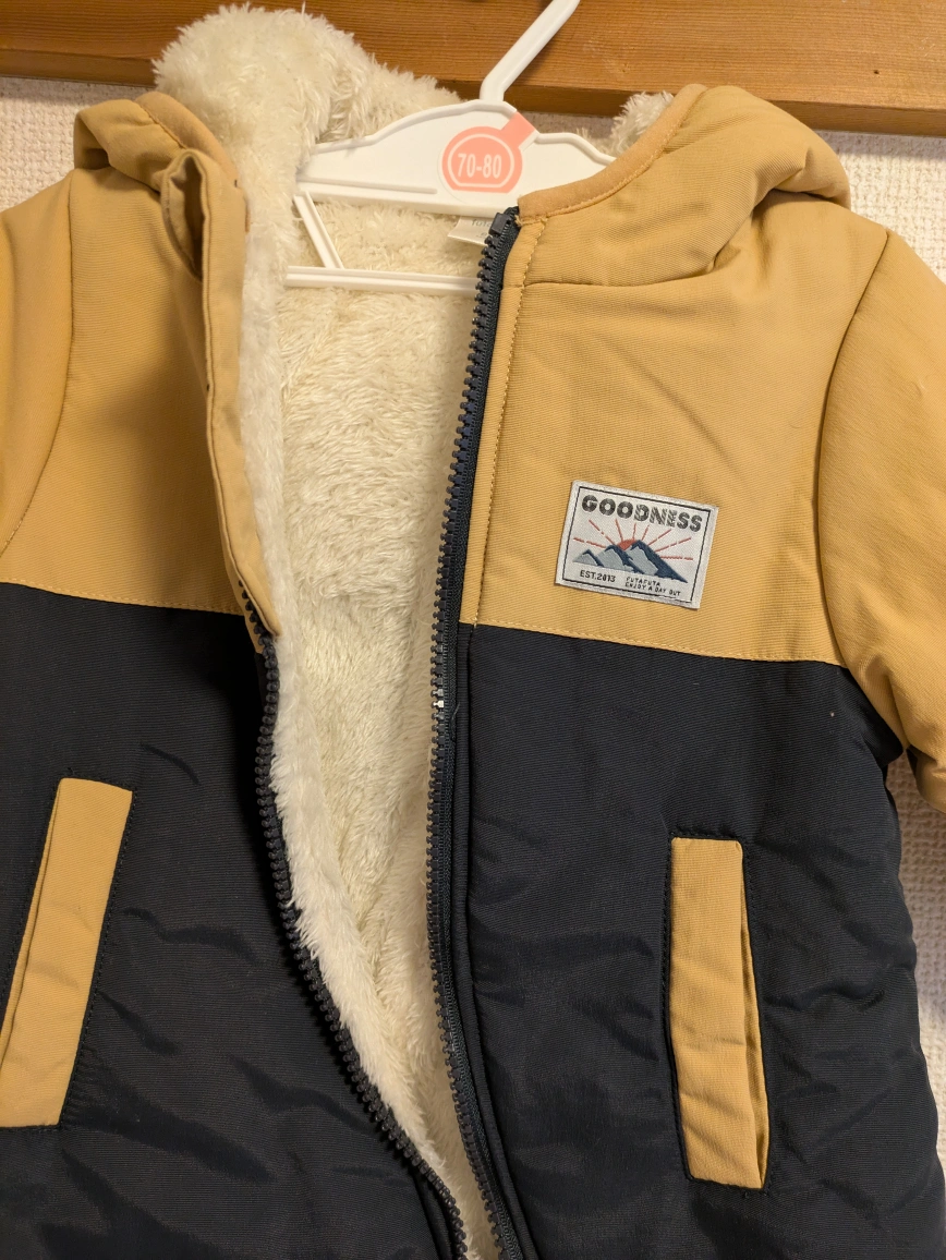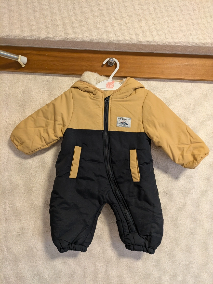 今季最終お値下げです! 他のコートを使用していた為、プレゼントで頂いたこちらの商品は2度(短時間)使用でサイズアウトになりましたので出品致します。 【保温性】 中綿素材を使用しており、寒い季節でも暖かさを保ちます。 【デザイン】 ベージュと黒のツートンカラーで、シンプルながらもおしゃれな印象を与えます。 【使いや すさ】 ジッパー仕様で、着脱が簡単です。ポケット付きで便利です。 - 色: ベージュと黒 - サイズ: 80 - 素材: 中綿 ペット、喫煙者無し家庭 受け渡し場所相談可(プロフ参照) 美品ではありますが、畳んで保管しておりましたので家庭保管にご理解下さい。 元値3,069円