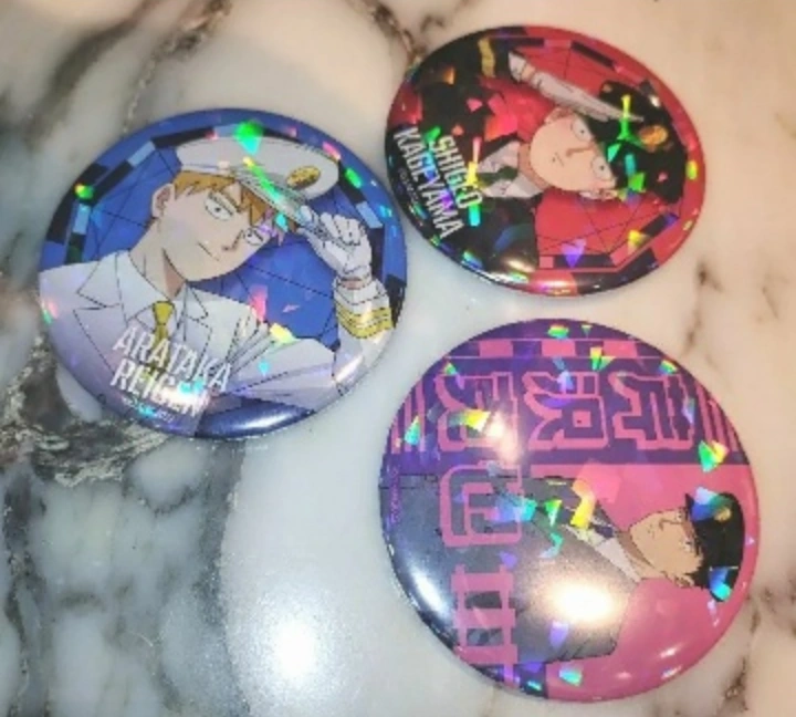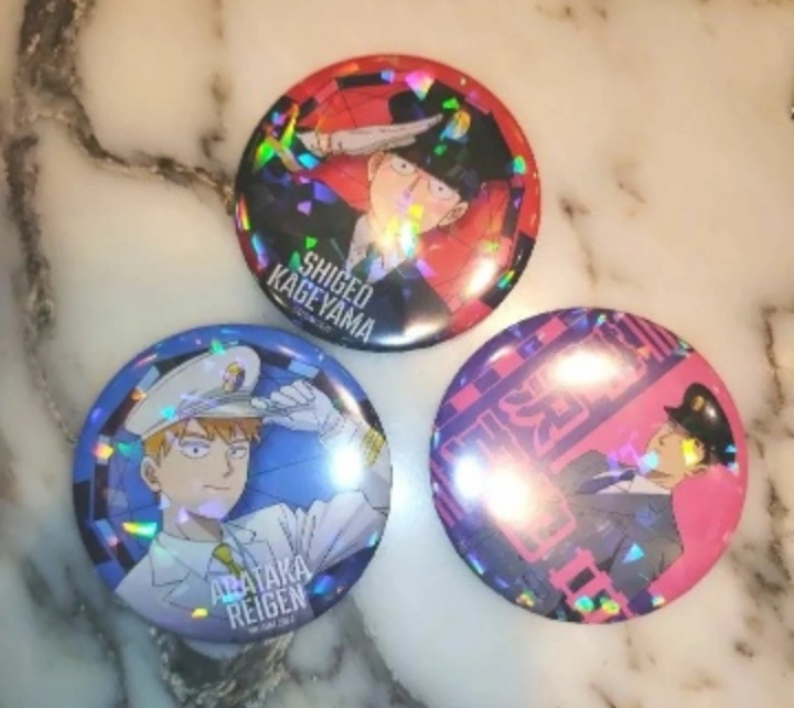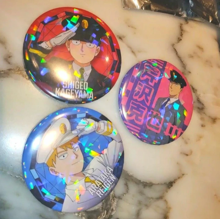 ホログラム缶バッジ(75mm)「モブサイコ100 Ⅲ」02/駅員風ver. コンプリートBOX(全6種)(描き下ろしイラスト) 撮影のために開封 未使用 バラ売りできません。 3個セットでまとめ売り 霊幻新隆 影山茂夫 芹沢