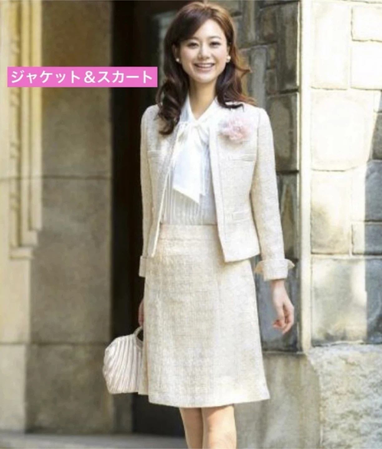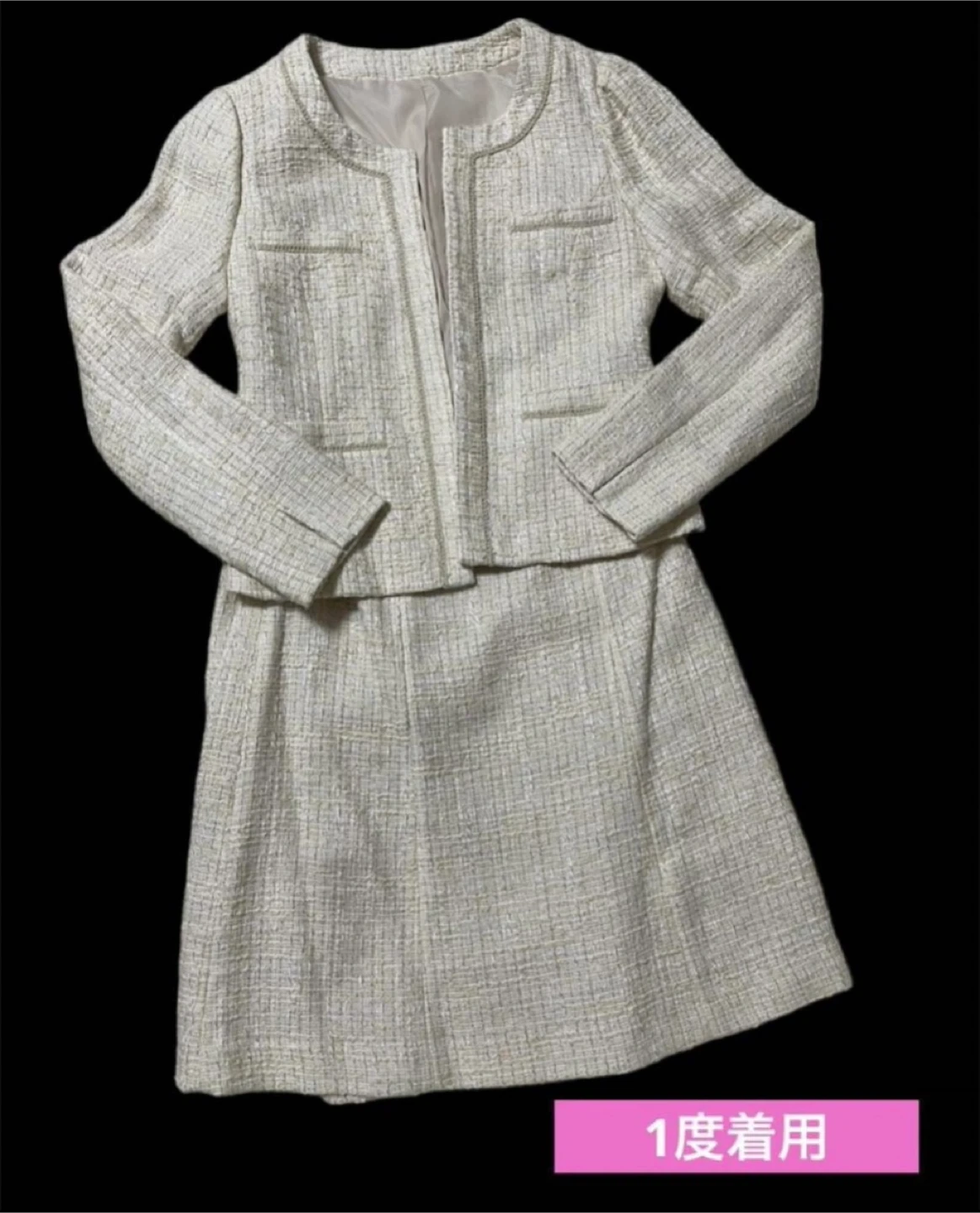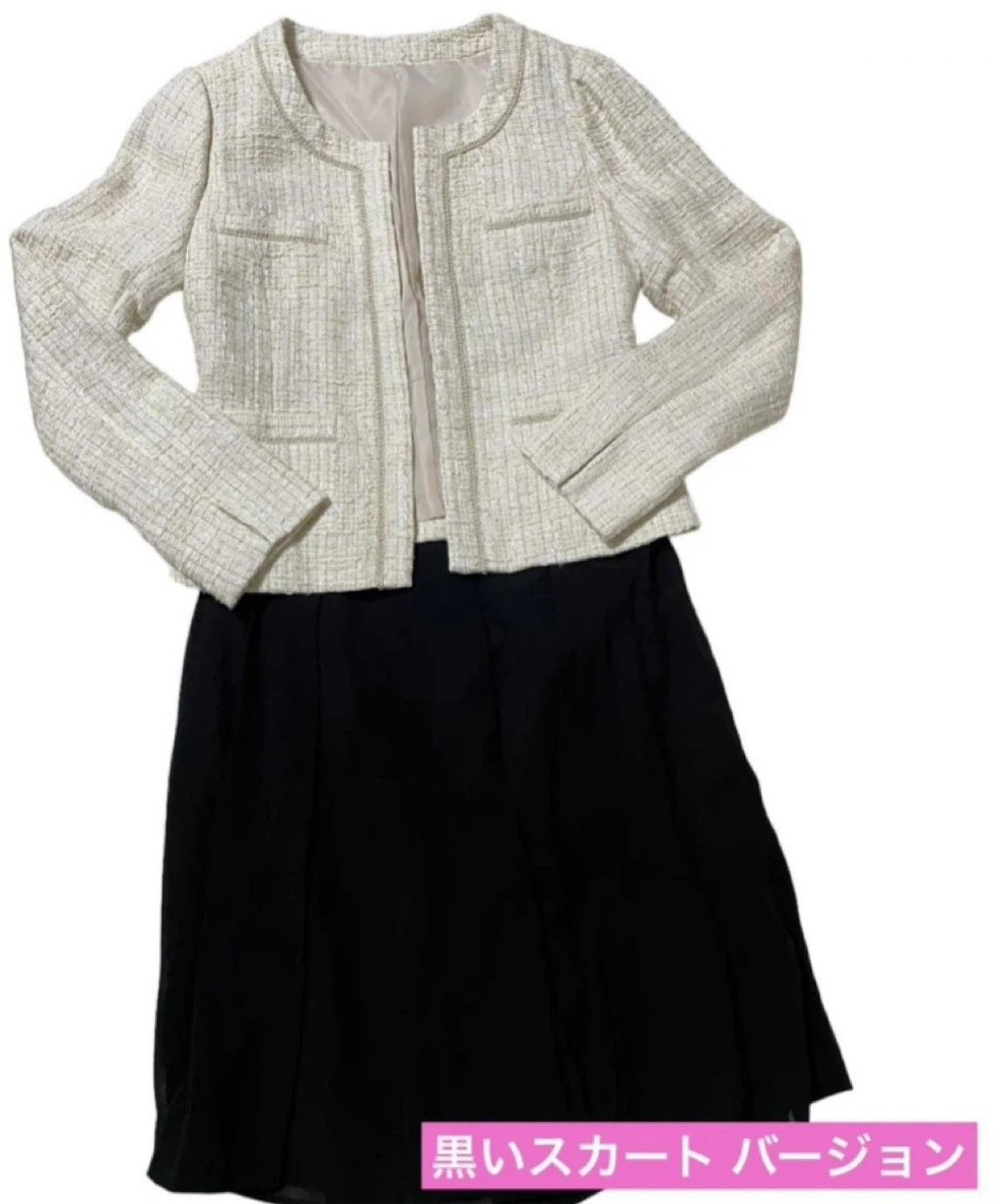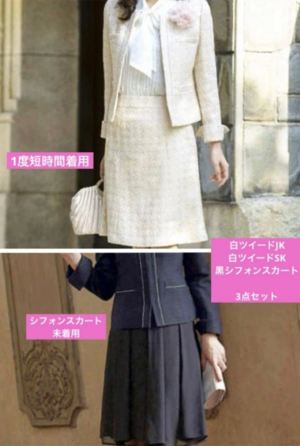 美品 1度着用 白ツイードジャケット 白ツイードスカート 黒シフォンスカート (未着用) 3点セット サイズ 9号(Mサイズ) これからの季節、沢山行事があるかと思います。 スカートが2点ありますので、その時の気分によって変えることができます。。 1時間程度しか着用しておりませんので汚れ等は無いかと思いますが、見落としがありましたらすみません。 ジャケット(ツイード) 着丈50㎝ バスト92㎝ ウェスト78㎝ 肩幅37㎝ 袖丈59㎝ スカート (ツイード) 丈56㎝ ウエスト67㎝ ヒップ92㎝ スカート (シフォン) 丈55㎝ ウエスト67.5㎝ ヒップ96㎝