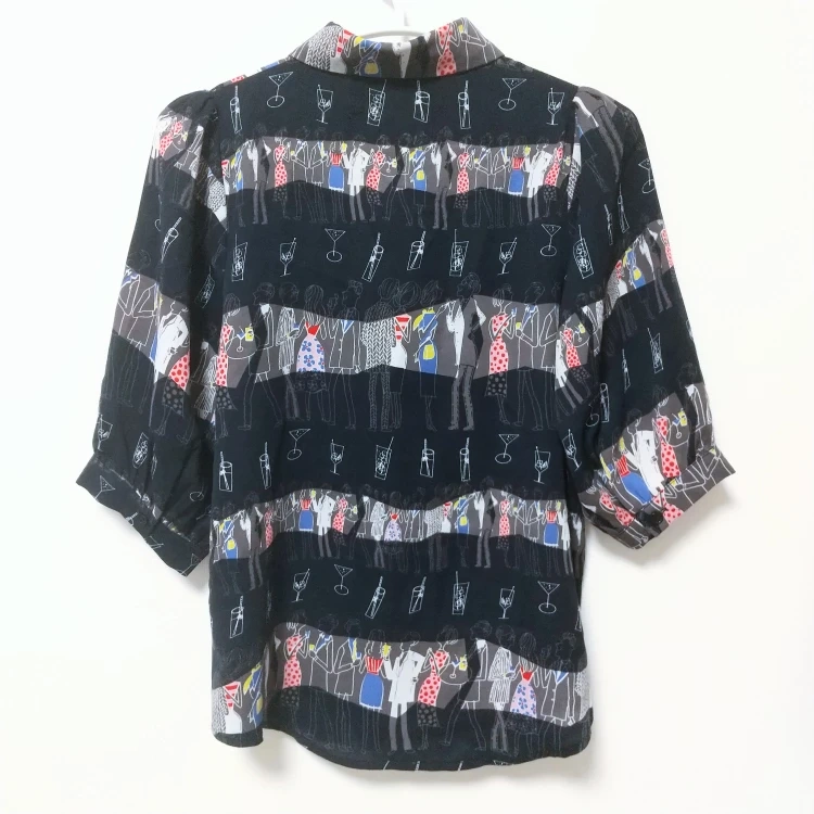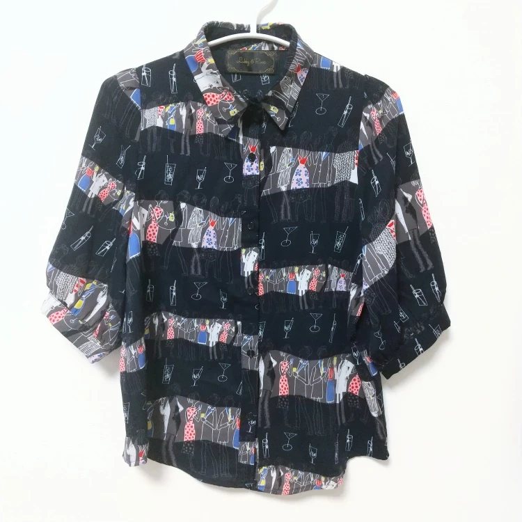 新大久保~池袋or大久保~新宿or氷川台でのお渡しです(^-^) 【商品状態】数回着用 ※おしゃれ着洗濯済 【参考価格】3190円 【販売価格】約69%OFFの1000円 【サ イ ズ】F フリー 【 色 】黒 ブラック 【デザ イン】バー柄 【素 材】ポリエステル100% 【着 丈】61cm 【身 丈】63cm 【袖 丈】36.5cm 【備 考】オープンシャツ 前ボタン 袖口カフス ボタン1 【ブランド】SpRay スプレイ Libby&Rose リビーアンドローゼ 【製 造 国】中国