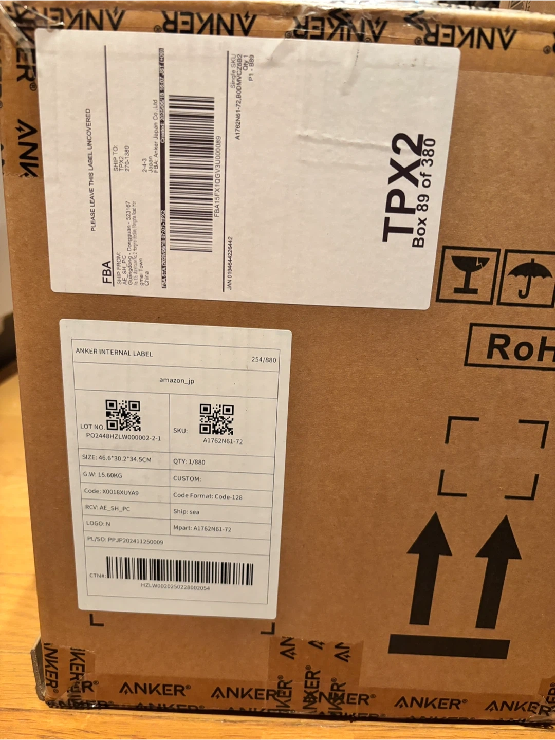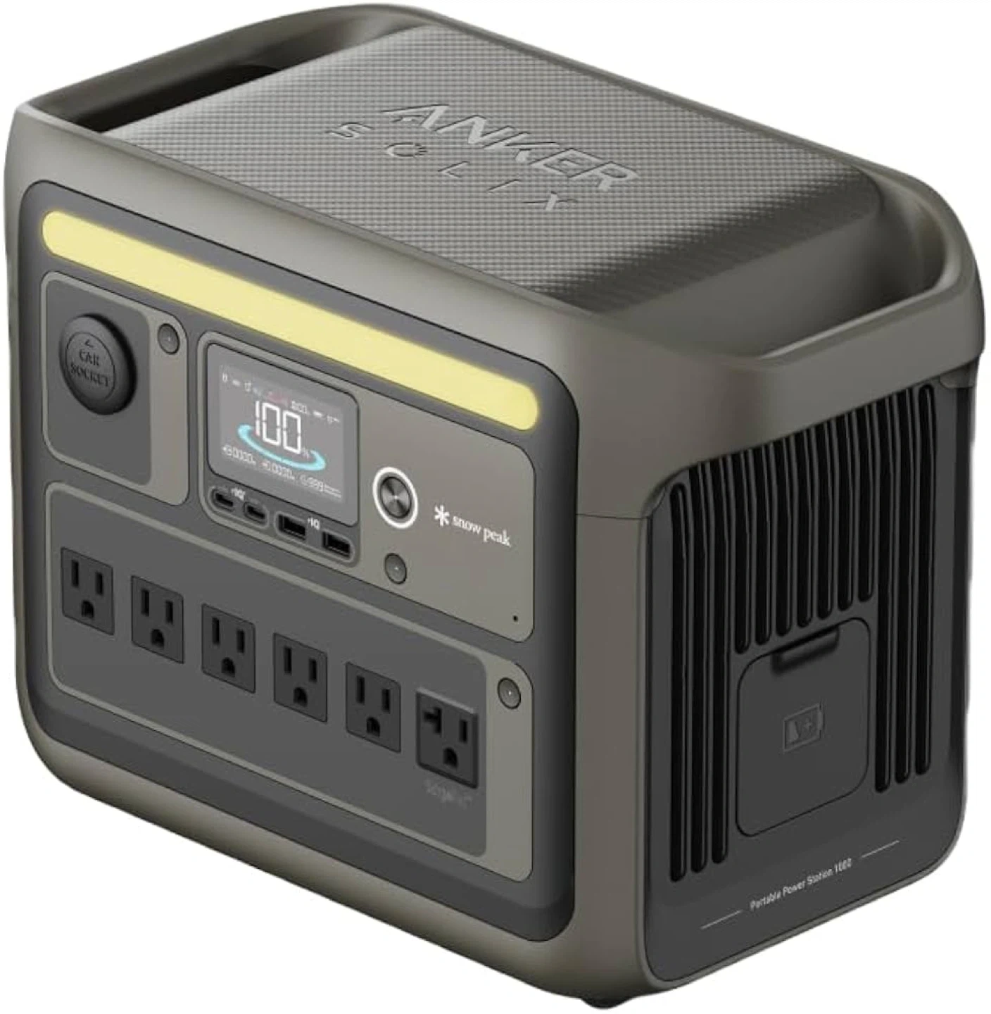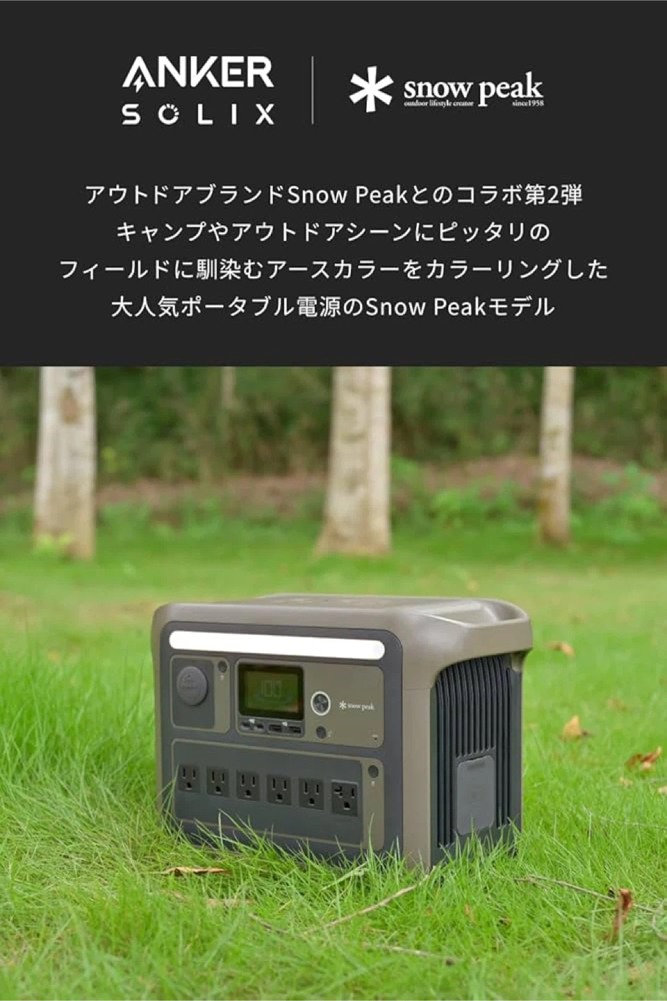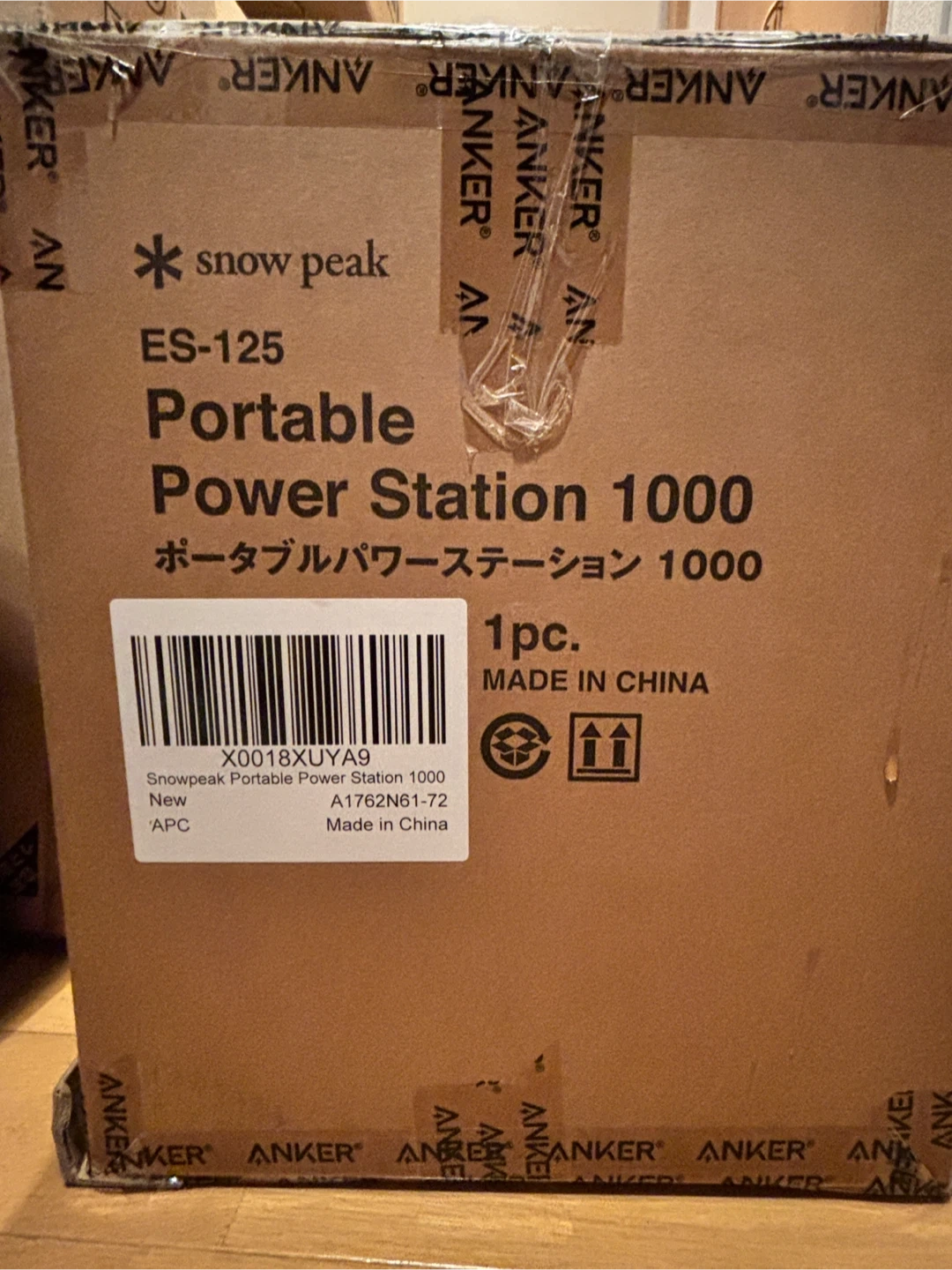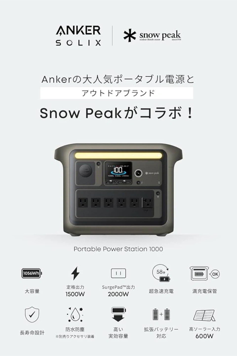 アンカーのポータブル電源です A1762N61-72 Snow Peak サイズ 約37.6 x 20.5 x 26.7cm ( 幅 x 奥行 x 高さ ) 重さ 約12.9kg 出力 AC出力:1500W バッテリー容量 1056Wh 充電時間 最短 約58分 (専用アプリで超急速充電モード設定時) パッケージ内容 Portable Power Station 1000、AC充電ケーブル、シガーソケット充電ケーブル、ソーラー充電ケーブル、安全マニュアル、18ヶ月保証 + 42ヶ月 (Ankerで会員登録後) 、カスタマーサポート