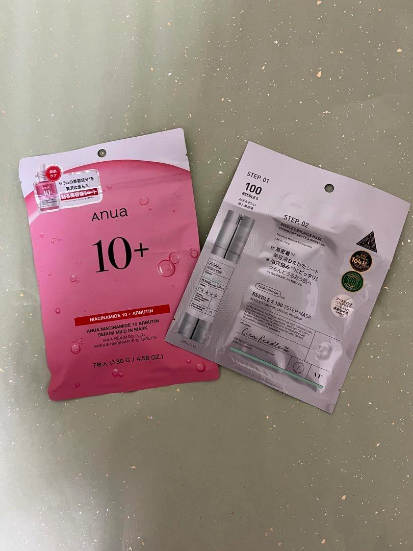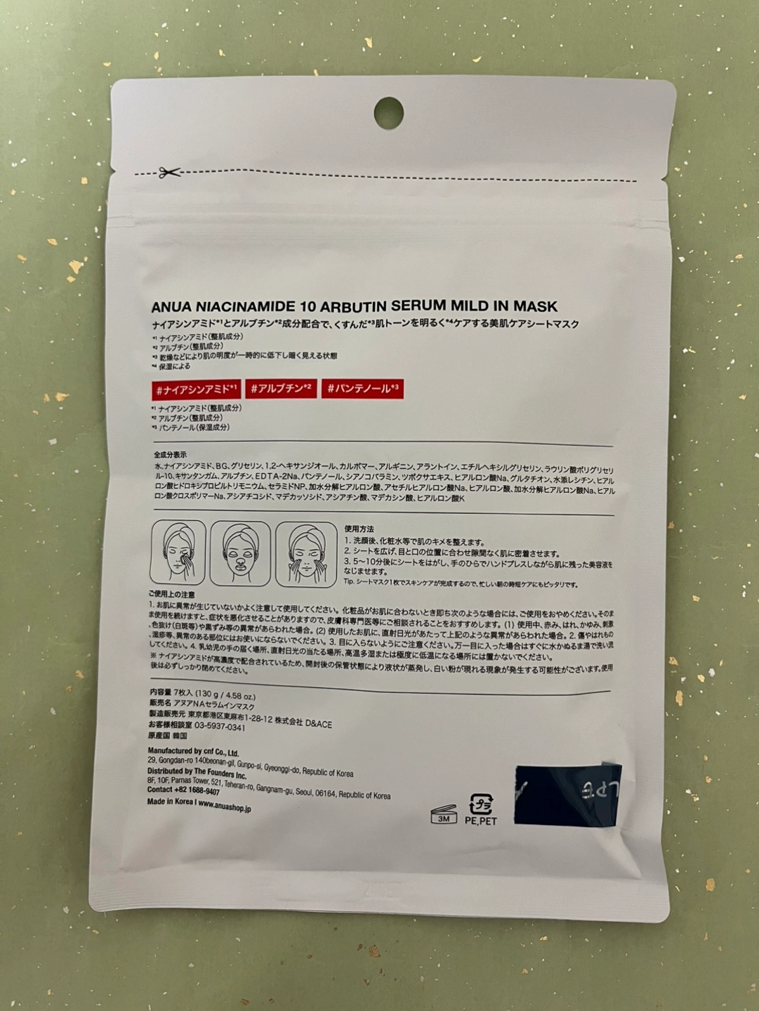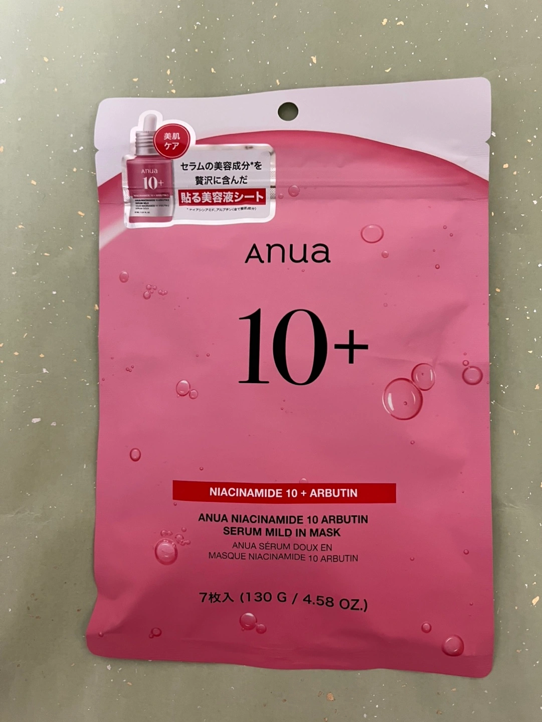 ①ナイアシンアミドとアルブチン配合の美容液マスク、敏感肌にも優しいシートタイプ。 - ブランド: anua - 商品名: 10+ Niacinamide 10 + Arbutin Serum Mild In Mask - 内容量: 7枚入り (130g / 4.58oz) - 特徴: ナイアシンアミドとアルブチン配合の美容液マスク - 使用方法: シートマスクタイプ - その他: 敏感肌用 ②リードルS100 2ステップマスク 1枚 #ANUA #セラムインマスク #リードル