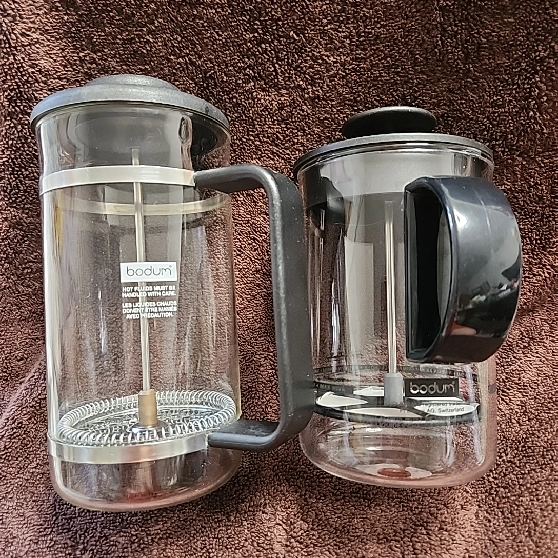 bodum ボダム セット フレンチプレス ミルクフローサー 中古 特に気になる難はありませんが 使用感はあります 気になる方はご遠慮ください これからの季節は 水出しコーヒー(コールドブリュー)等を 楽しめます! 以下サイズは大体です フレンチプレス (コ ーヒー) 容量:1000㎖ 奥行11cm 幅18cm 高さ22cm 本体:耐熱ガラス(耐熱温度差120度) フィルター:ステンレススチール鋼 備考 食器洗浄機、乾燥機使用可 ミルクフローサー (泡立て) 容量:250ml 奥行:10cm 幅:17cm 高さ:18cm ボタム ラテオ ミルクフローサー 原材料 本体:耐熱ガラス(耐熱温度差120℃) リッド・フィルター:ポリプロピレン(耐熱温度100℃) ロッド:ステンレススチール