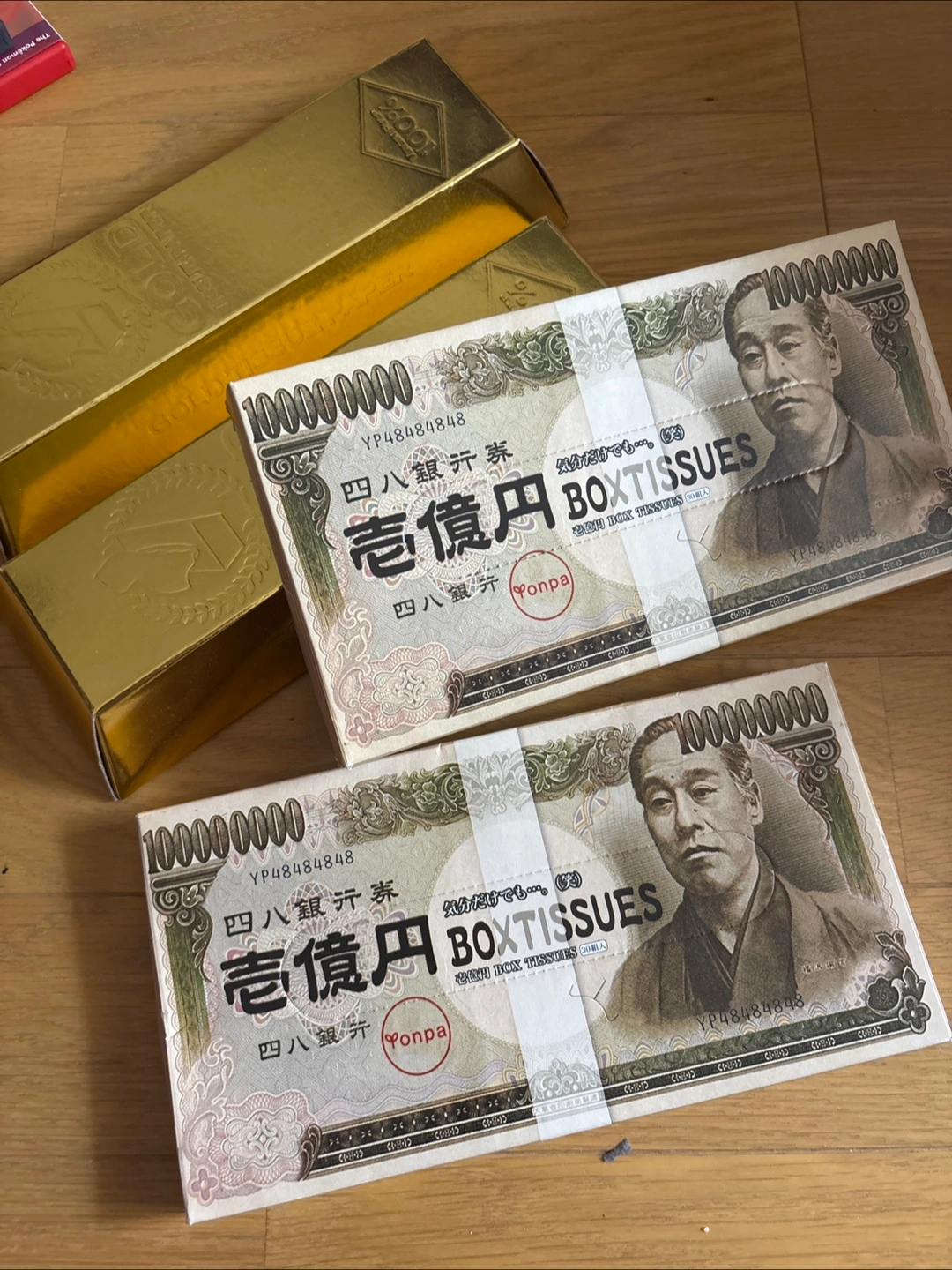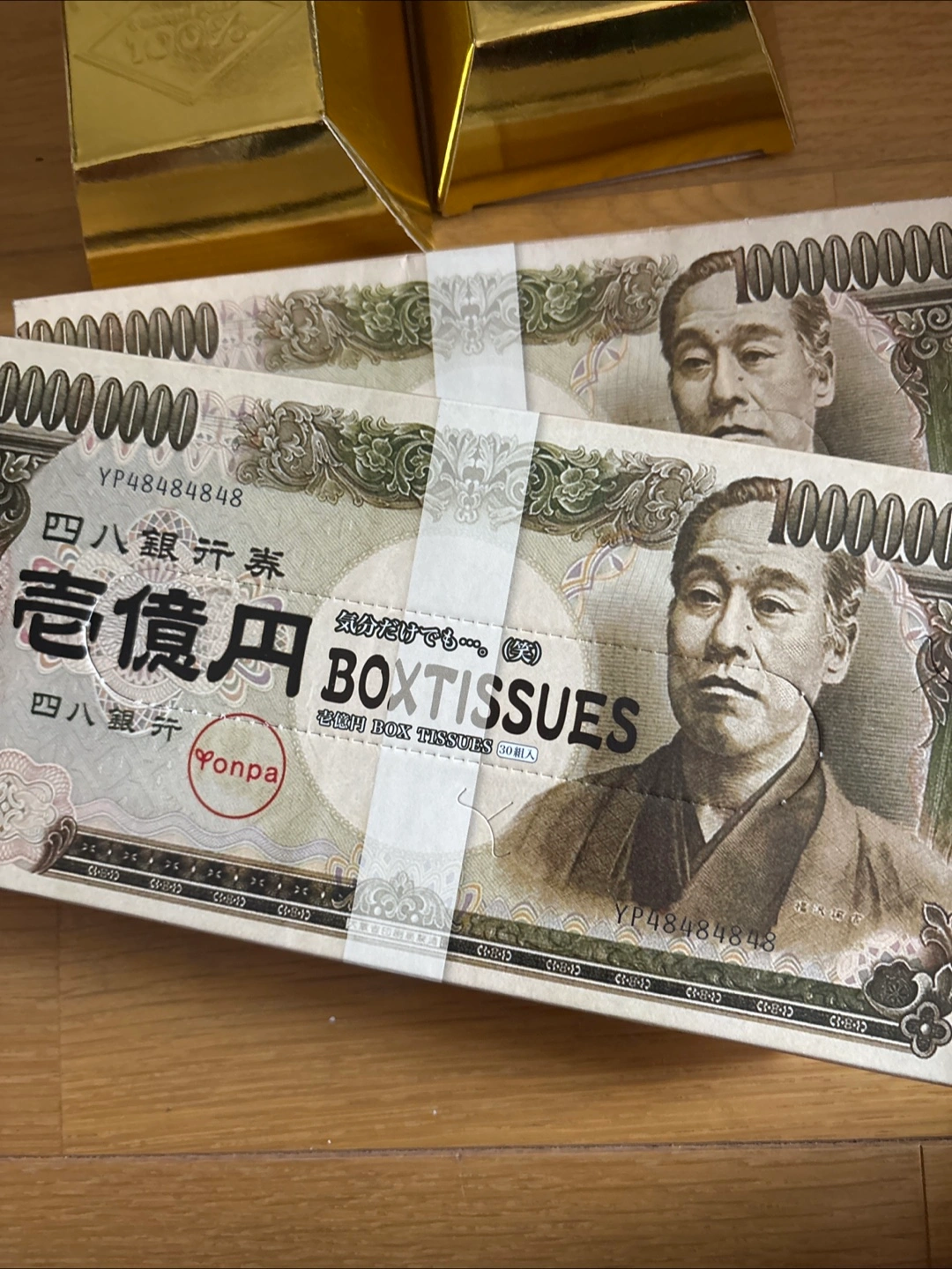 すべて見る・BOXTISSUES 壱億円ボックスティッシュ ・GOLD TISSUE PAPER ・ティッシュ30個入り 一箱500円のゴールドティッシュです。 景気づけにいかがですか?
