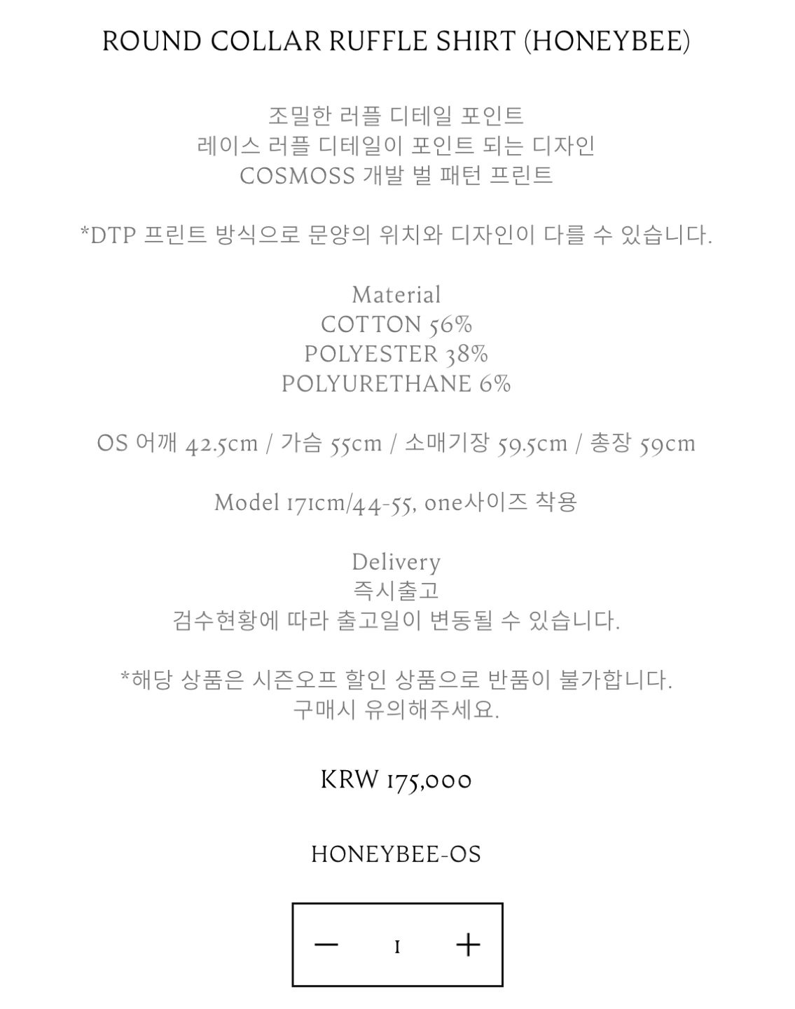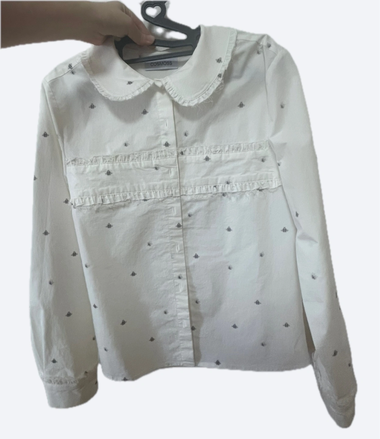 韓国ブランド Cossmoss のハチミツシャツです。 パリッとした素材感で、シルエットがとてもきれいです。 • 定価:175,000KRW(約18,500円) • 肩幅:42.5cm • 身幅:55cm • 袖丈:59.5cm • 着丈:59cm 袖部分にコーヒーのシミがあります。あまり目立ちませんが、ご参考ください。 また、袖にわずかな汚れがありますが、洗濯すれば落ちますのでご了承ください。