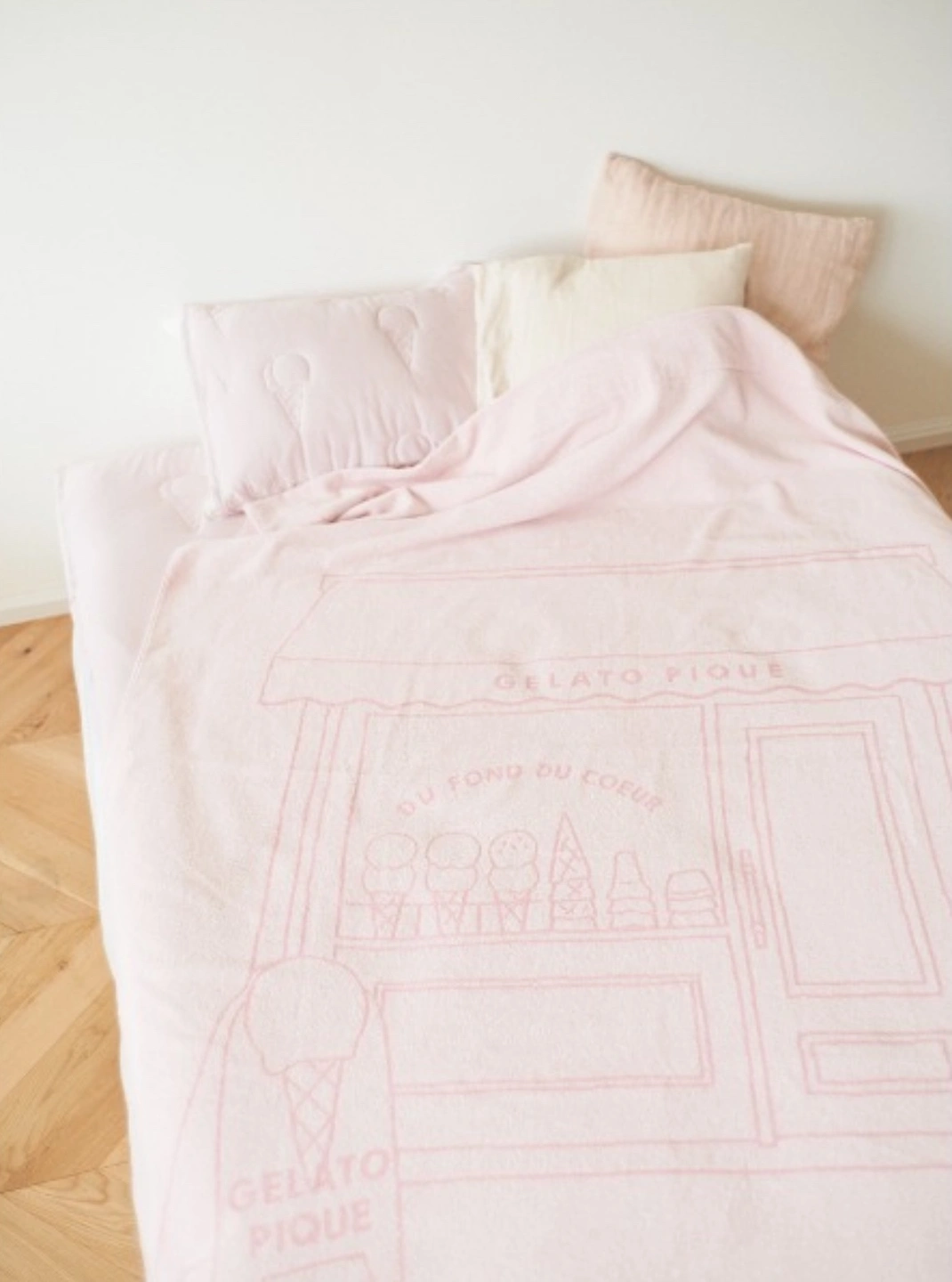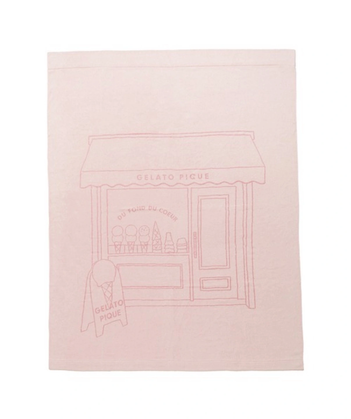 gelato pique 【Sleep】アイスショップ柄 タオルケット お色・ピンク size・FREE 縦:190/横:140 【アイスクリームショップを描いたタオルケット】 【Fabric】 コットン混の柔らかなパイル素材を使用しています。 【Design/Styling】 アイスクリームショップを大胆に描いた、gelato piqueらしい遊び心たっぷりのタオルケット。夏のベッドタイムに心地いい、さらりとした柔らかなパイル素材を使用しました。色はピンクとミントの2色をご用意。アイスモチーフのバスポンチョや、アイスロゴキルトの寝具シリーズと組み合わせることでキュートなアイスショップが完成します。