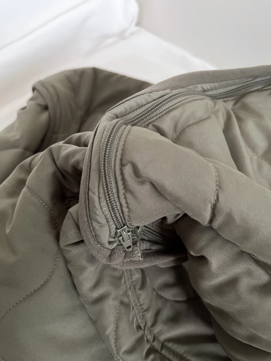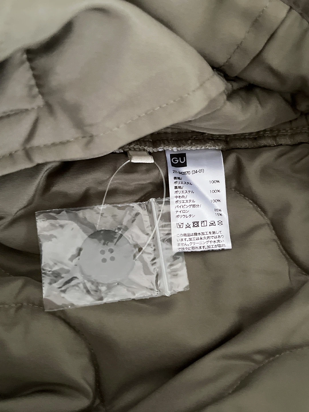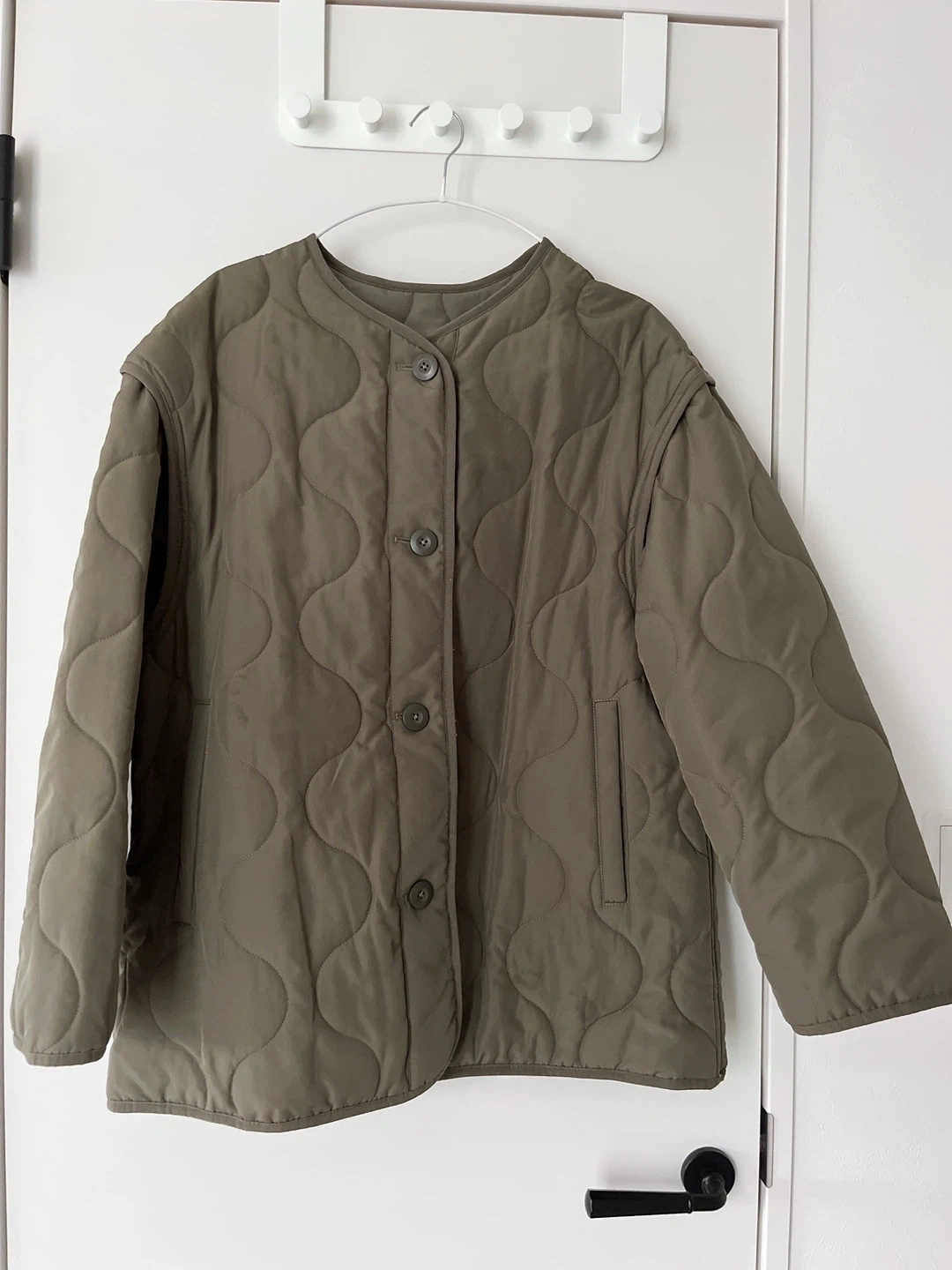 GUのキルティングジャケットです。 【情報】 ブランド:ジーユー 色:カーキ 素材:ポリエステル100% 型番:311-342670(24-01) 【状態】 使用感少なめ、全体的にきれい 【付属品】 予備ボタン 中古品であることご了承ください 肩の部分がジッパーで取れるようになっているので、ベストとしても使えます。 写真で見るより実物はシンプルで可愛くて何に合わせても良い感じなので使い勝手は良いと思いますo(^-^)o