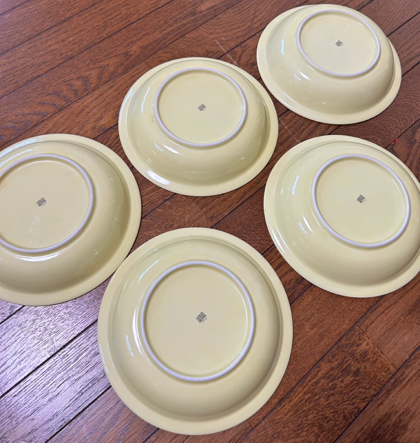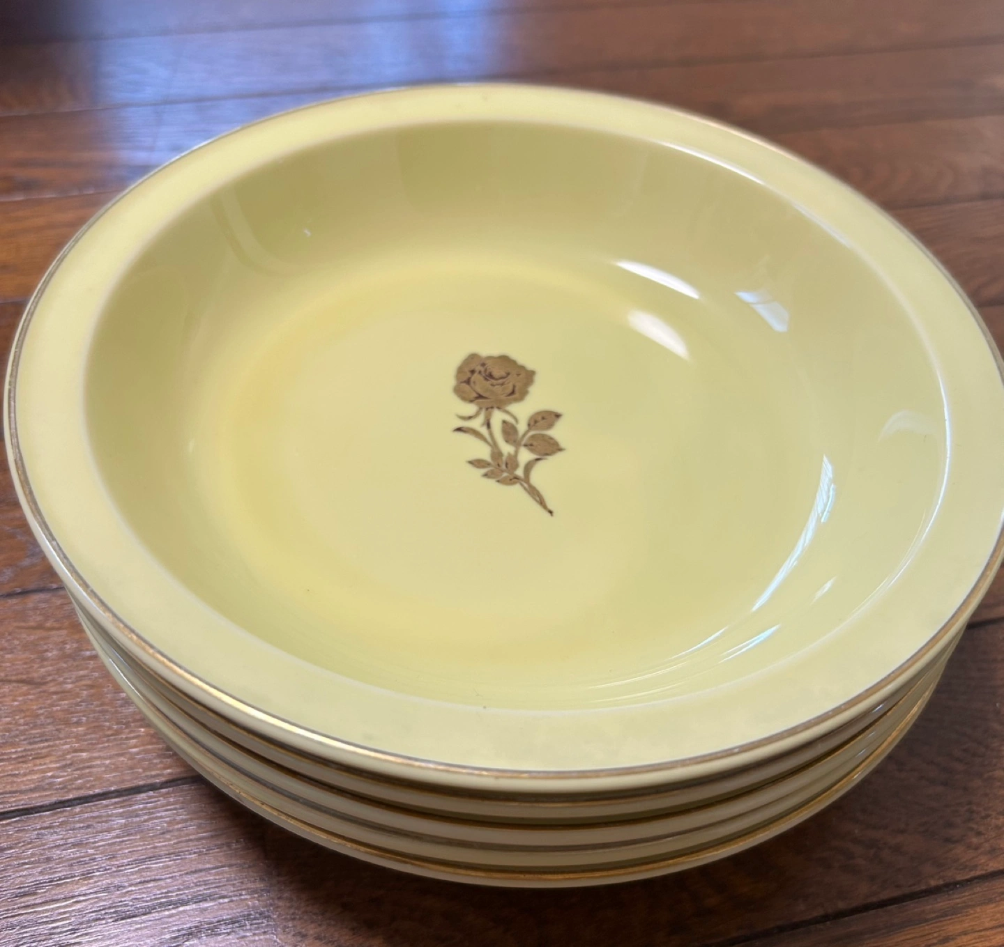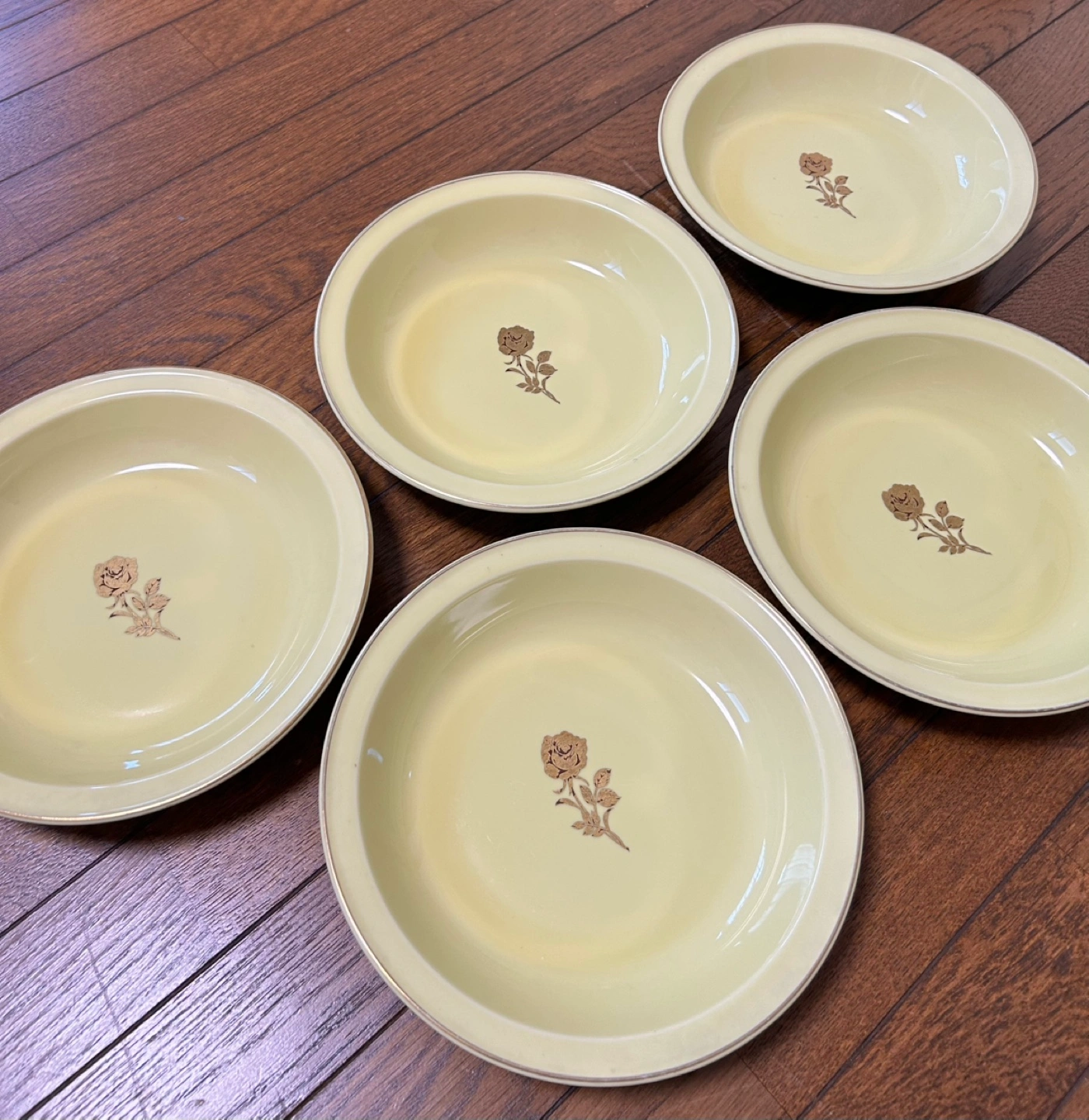 ご覧いただきありがとうございます😊 ◆HOYA china ◆日本製 ◆カレー皿、スープ皿 ◆5枚セット ◆used - 数量: 5枚 - 色: クリームイエローに金の縁 - デザイ ン: ローズ🌹 祖母宅整理の為出品します。 使用頻度は少なかったのですが、年数は経ているので、セカンドユーズにご理解のある方ご検討いただければと思います。 昭和レトロなかわいいお皿です。 ご質問などありましたら、お気軽にご連絡ください。どうぞよろしくお願いします^ - ^