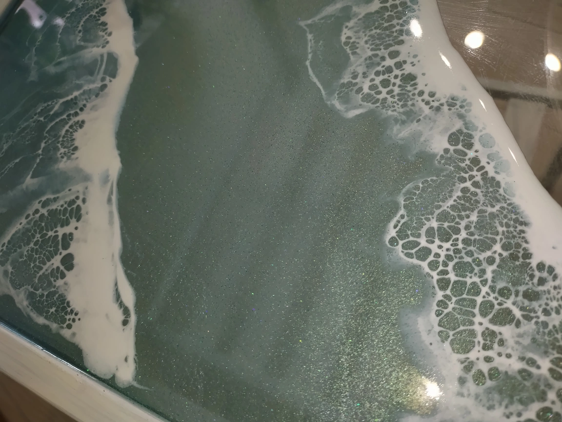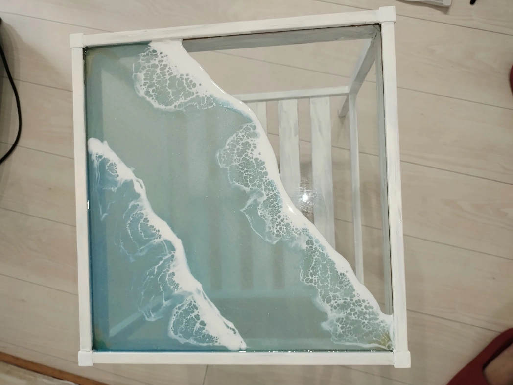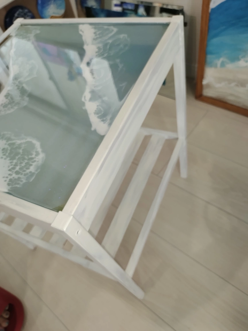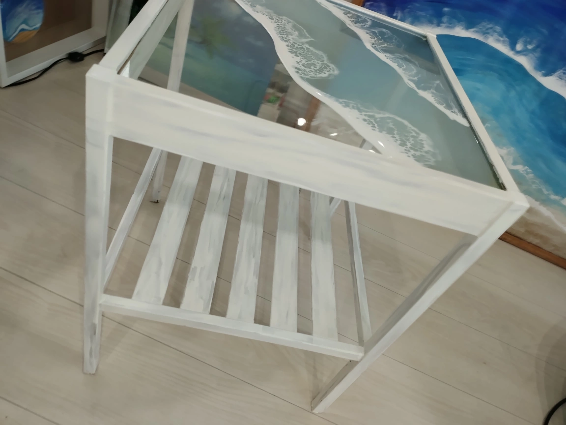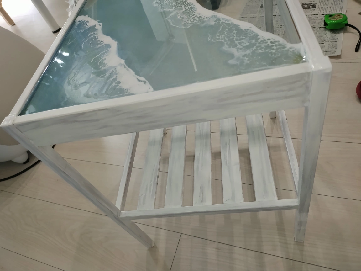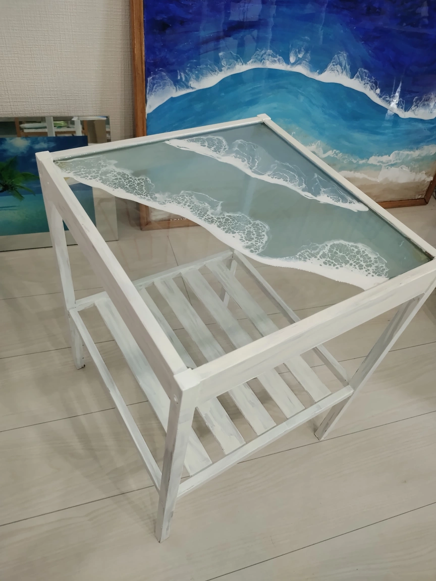IKEAサイドテーブル 白ホワイト 海 波模様 オーシャンレジン作品 収納 デスク インテリアお洒落 ハワイアン