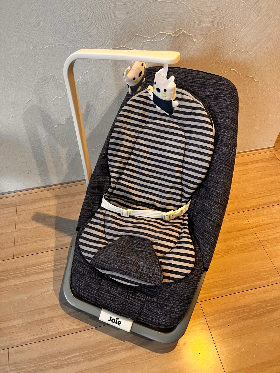 すべて見るジョイーのバウンサーです ・色:グレー、白、ネイビー ・ストライプ柄のクッション付き ・おもちゃ付き ・背面に小さな穴あり ・使用感あり 中古品であることご了承ください