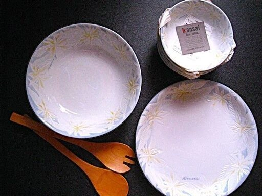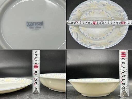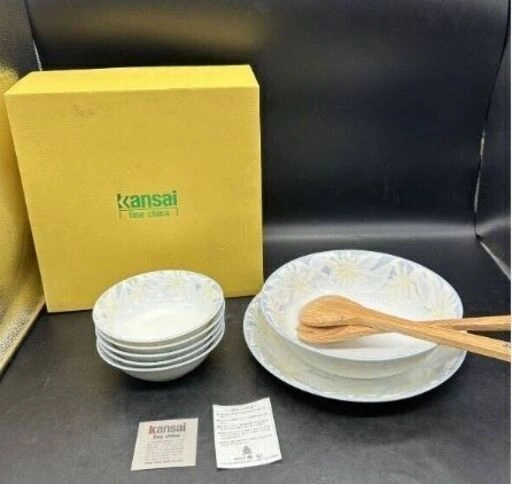 ヤマモト カンサイ ファインチャイナ プレート 未使用で、カバーが掛かったまま保管しておりました。 大1枚 ボウル1枚 小 5枚 木製サーバー フォーク1本 スプーン