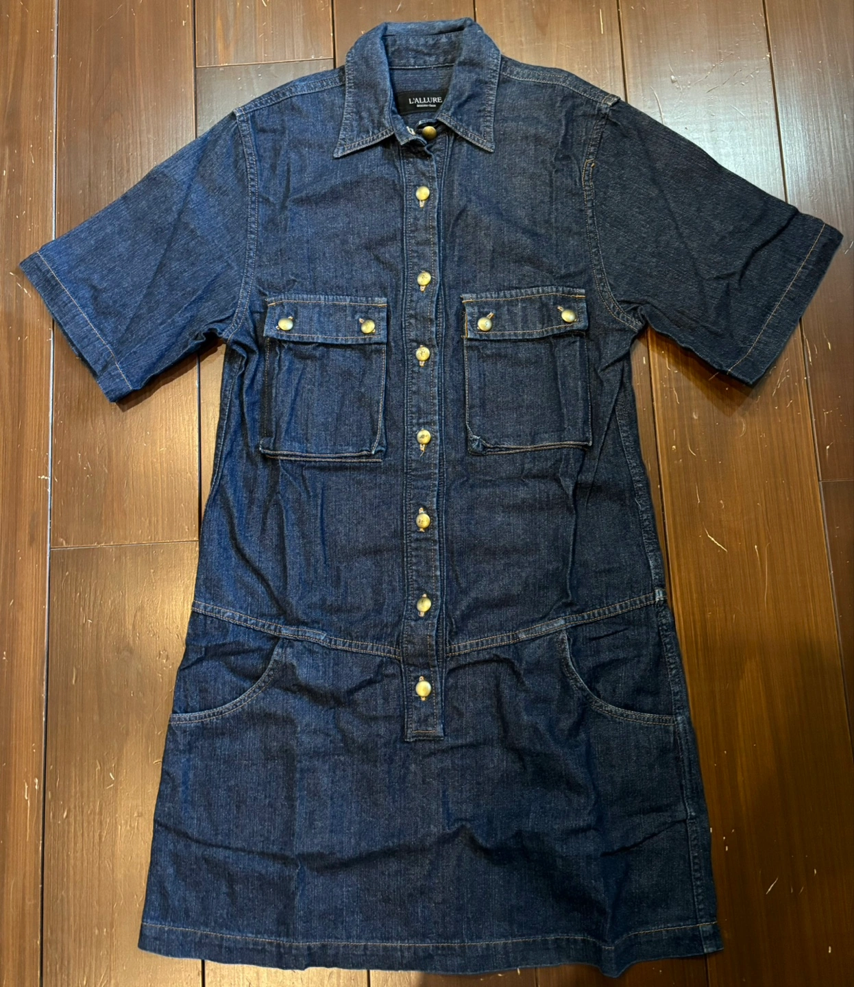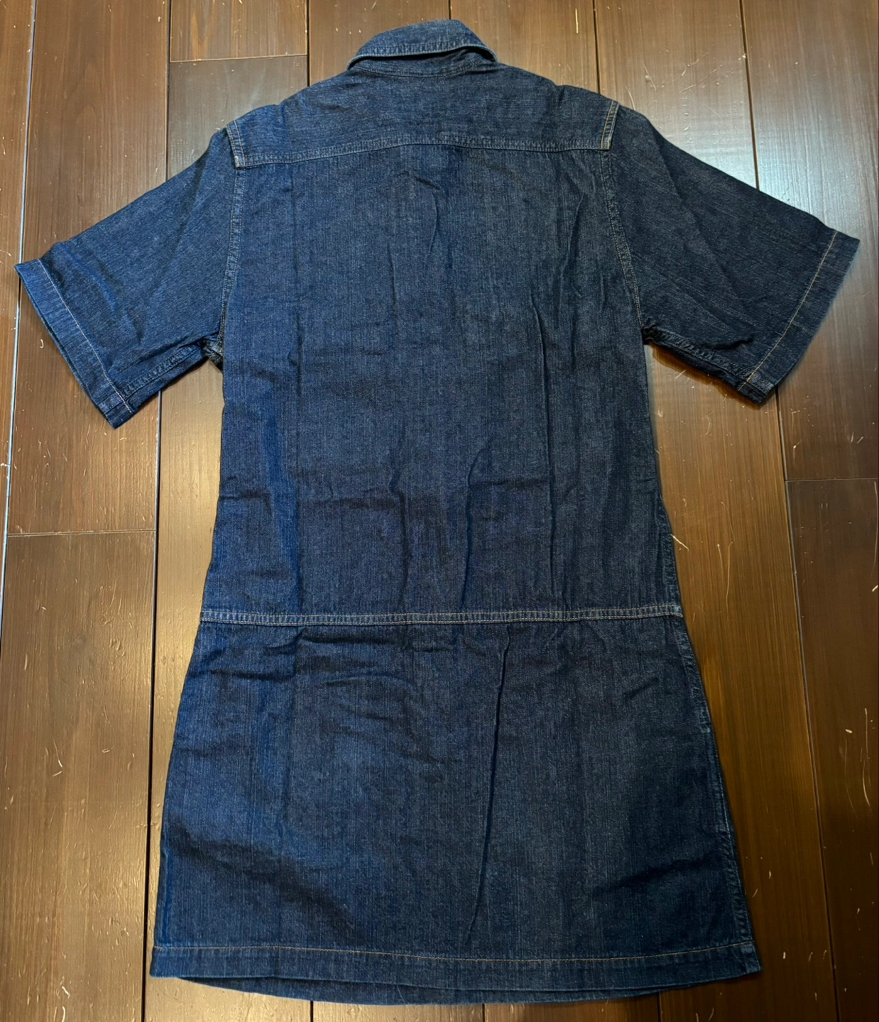 デニム ミニ丈ワンピース 半袖 古着で、目立った汚れほつれは確認出来ませんが、ボタンにスレ跡があります。画像参照ください。 サイズ表記はありませんが、155cm普通体型でちょうどくらいで、少し小さめのMという感じです。 猫を飼っております。猫アレルギーの方はご注意ください。 平置き実寸 肩幅約40cm 袖丈約27.5cm 胸幅約45cm 裾幅約53.5cm 着丈(背部襟上から裾まで)約94cm