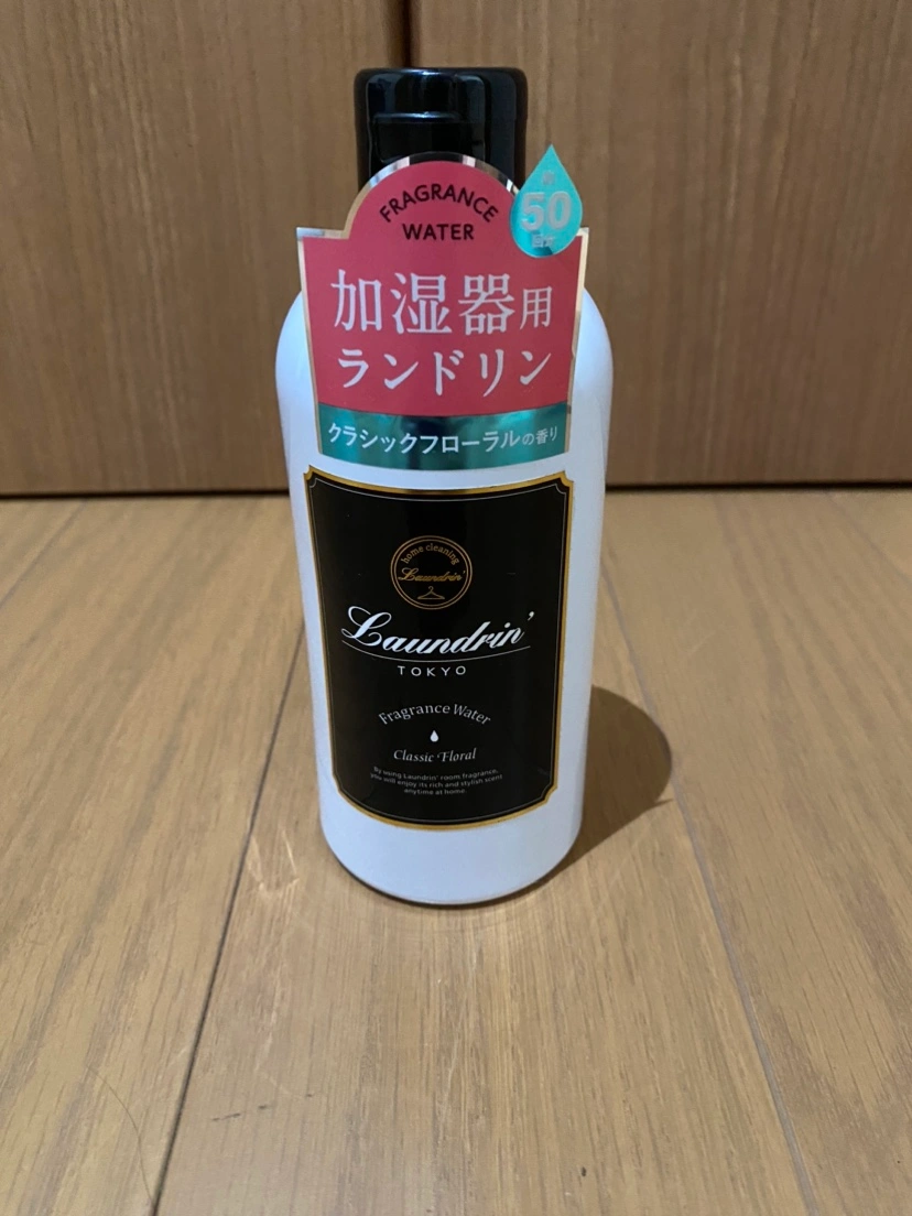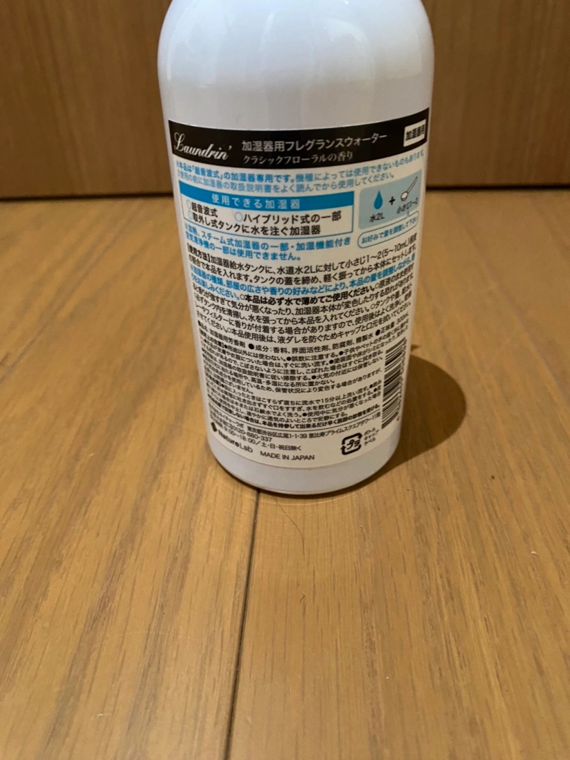 Laundrinランドリン 加湿器用フレグランスウォーター クラシックフローラルの香り300ml 加湿器用のフレグランスウォーター。給水タンクに水道水と一緒に入れるだけ。ふわっと広がる心地よい香りを楽しめます。 うっとりするような優雅な気分をイメージした上品でクラシカルな香り。 個人保管品であることをご理解の上、ご購入をお願い致します。 神経質な方はご遠慮ください。 購入後のクレームやキャンセルはお断りしております。 気になる点がありましたら、お気軽にご質問下さい。 よろしくお願いいたします。 他の場所にも出品していますのでどちらかで売れれば急遽出品を中止させていただくことがありますのでご了承ください。ご購入の際はご確認のほど宜しくお願いいたします。 ●使用可:超音波式/ハイブリット式の一部/取外し式タンクに水を注ぐ加湿器 ●使用不可:加熱、スチーム式加湿器の一部・加湿機能付き空気清浄機の一部 *本品は「超音波式」の加湿器専用です。機種によっては使用できないものもあります。ご使用の前に加湿器の取扱説明書をよく読んでから使用してください。 使用方法 ●加湿器給水タンクに、水道水2Lに対して小さじ1〜2(5〜10mL)程度の割合で本品を入れます。タンクの蓋を締め、軽く振ってから加湿器本体にセットします。*加湿器の種類、部屋の広さや香りの好みなどにより、本品の量を調整しながら、香りをお楽しみください。 ●本品は必ず水で薄めてご使用ください。 ●原液のまま使用すると香りが強すぎて気分が悪くなったり、加湿器本体が変色したりする恐れがあります。 ●必ずタンク内を清掃し、水を張ってから本品を入れてください。 ●タンクや蓋、給水トレーやフィルターに香りが付着する場合がありますので、使用後はよく洗浄し、乾燥させてください。 ●本品使用後は、液ダレを防ぐためキャップと口元を拭いてください。 使用上の注意 ●用途以外には使わない。 ●誤飲に注意する。 ●子供やペットの手の届く所に置かない。 ●本品が皮膚や衣服についた場合は、すぐに洗い流す。 ●塗装面や床がシミになったり、変色したりする恐れがあるので、こぼさないように注意し、こぼれた場合はすぐに拭き取る。 ●使用後は、加湿器の取扱説明書に従い掃除する。 ●火気の付近には保管しない。 ●直射日光に当たる場所や、高温・多湿になる所に置かない。※天然由来成分を使用しているため、保管状況により変色する場合がありますが、品質には問題ございません。 原材料・成分 香料、界面活性剤、防腐剤、精製水