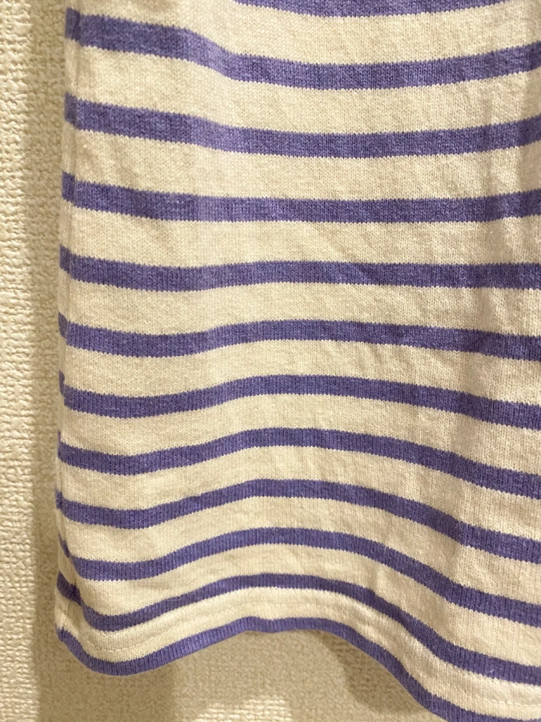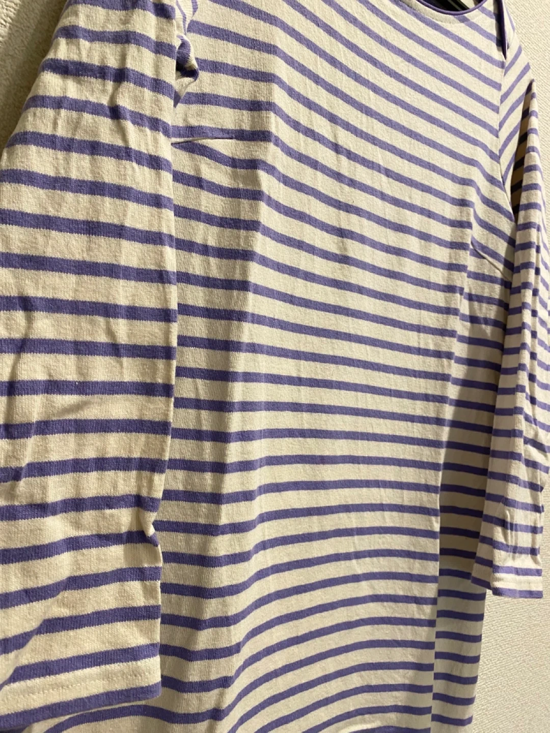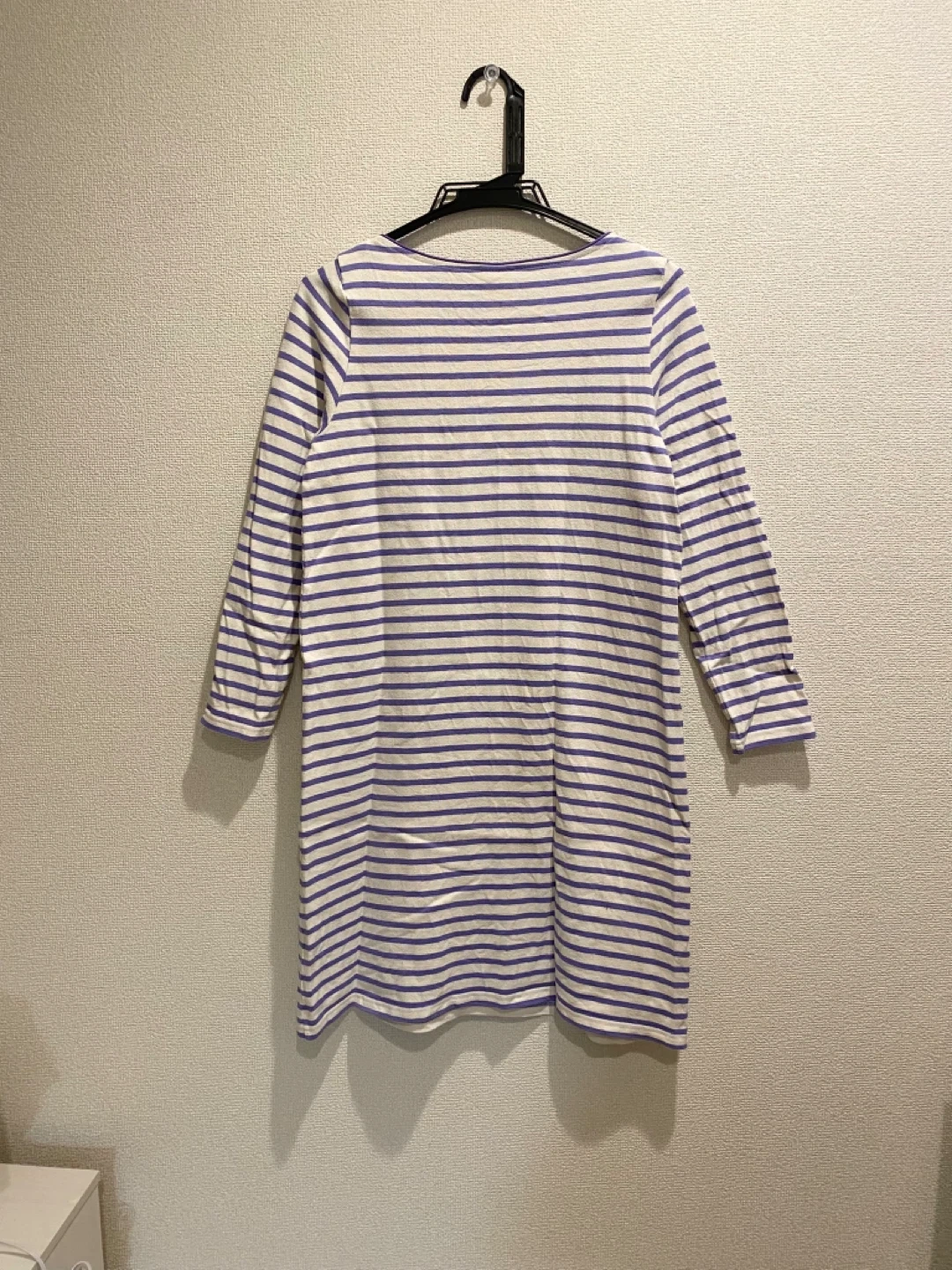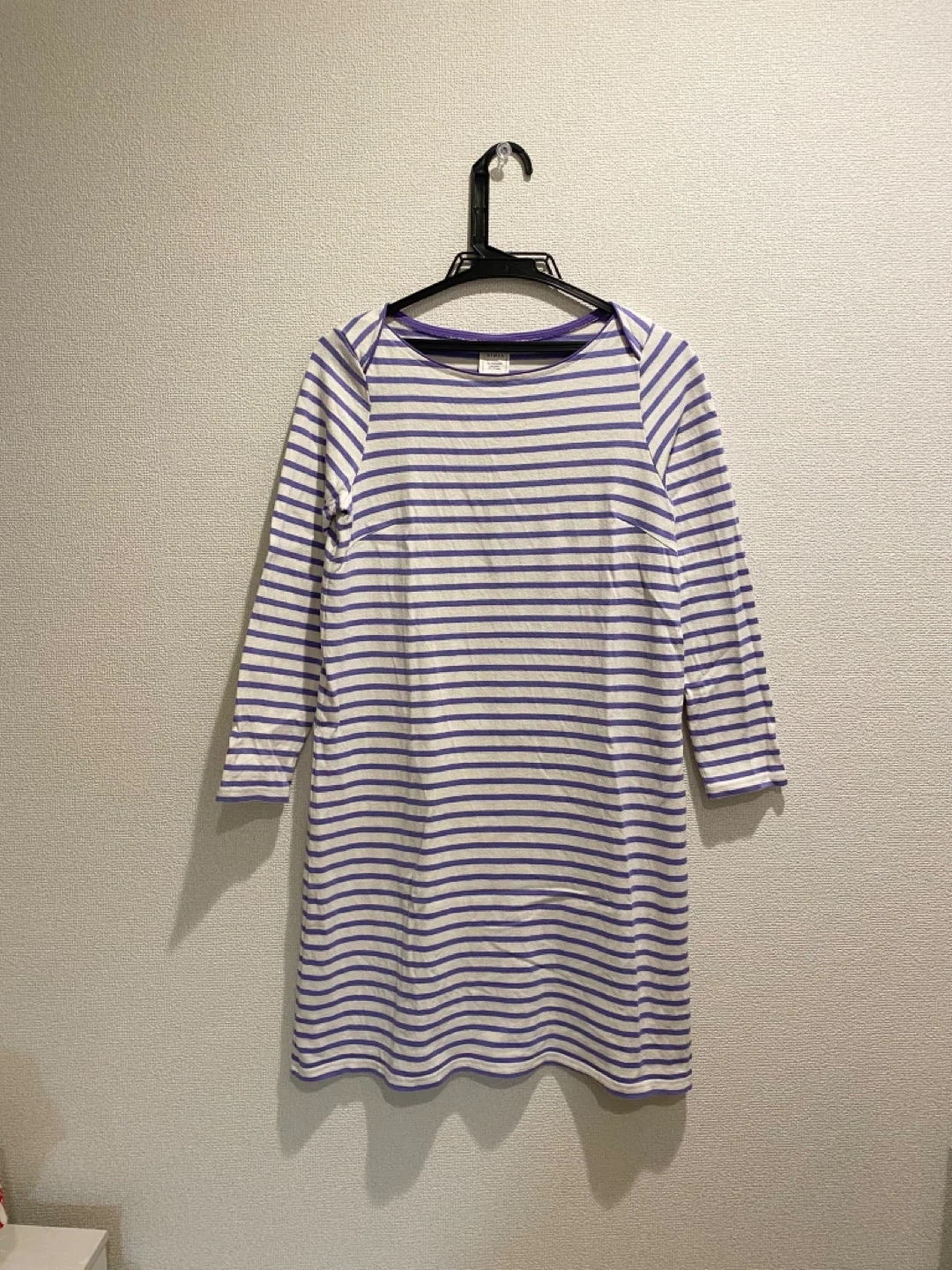 張りのある綿素材、薄いパープルとアイボリーのボーダー柄の膝丈ワンピースです。 購入後、数回部屋着として着用しました。型崩れなどなくシミ汚れも無いようです。 自宅でお洗濯済みです。柔軟剤は使用していません。 肩幅:36cm 身幅:45cm 着丈:86cm 袖丈:55cm 目黒駅でも引き渡し可能です。 柄···ボーダー 季節···春夏 季節···秋冬 汚れ・破れ・臭いなどなし