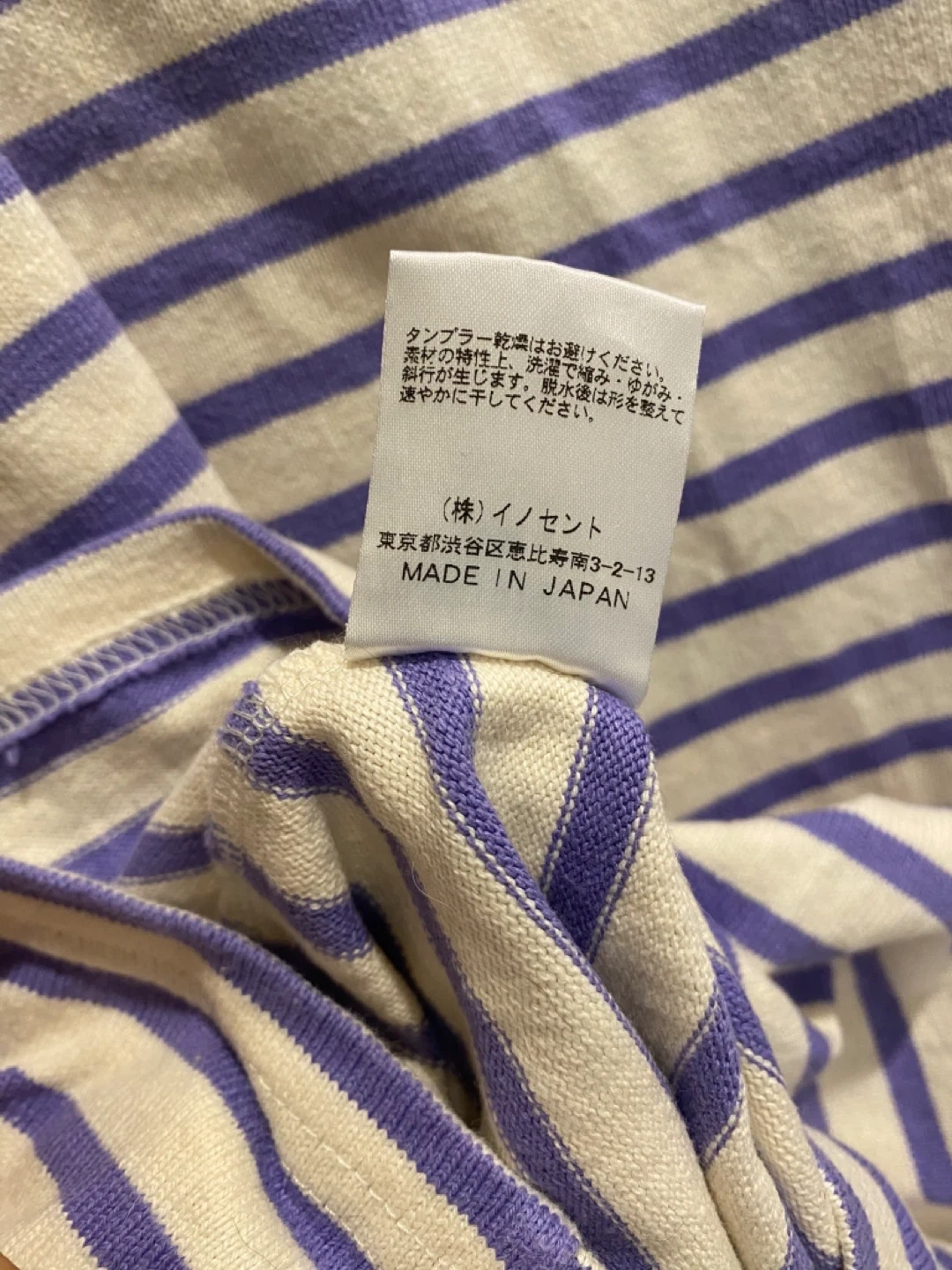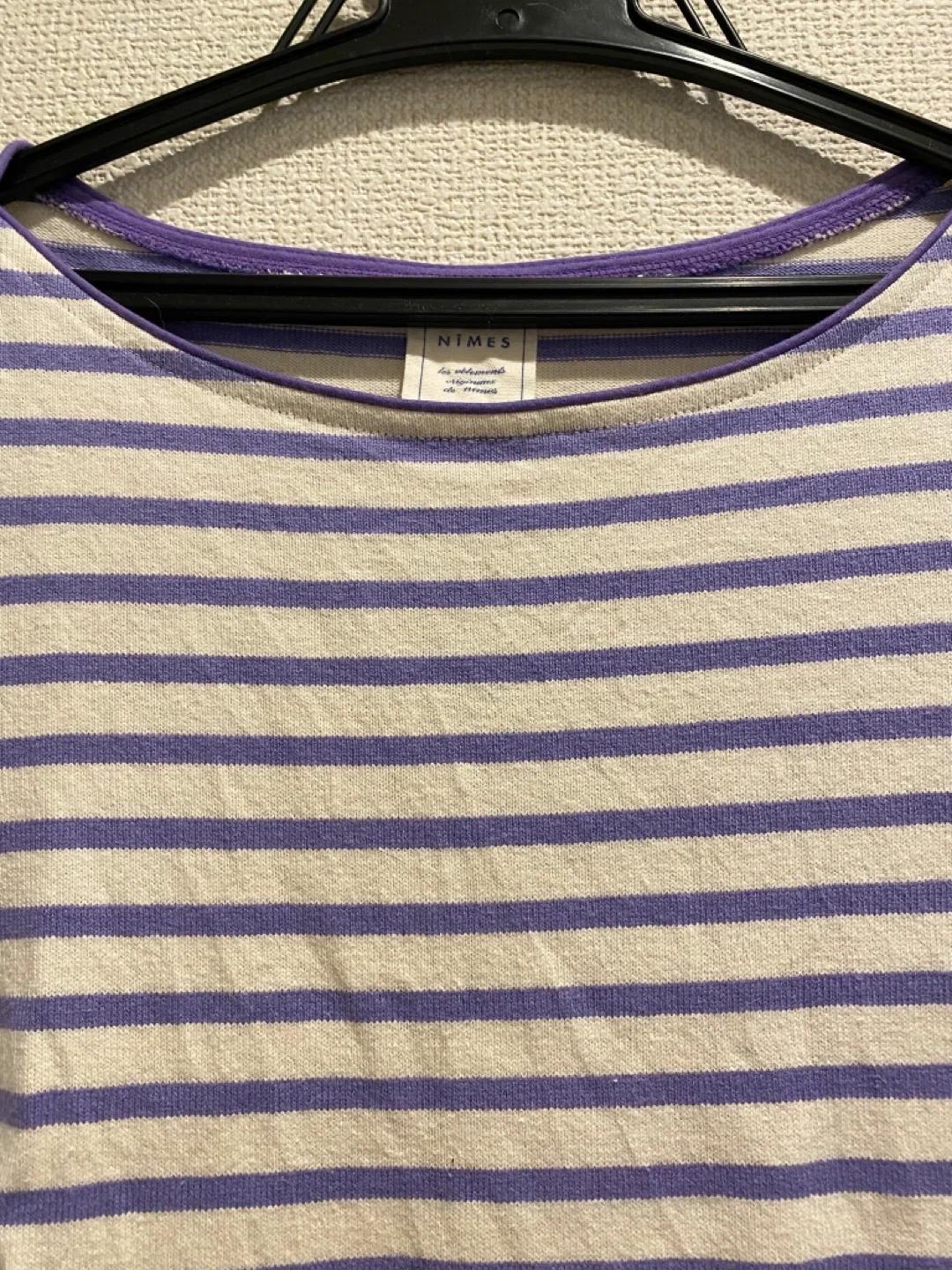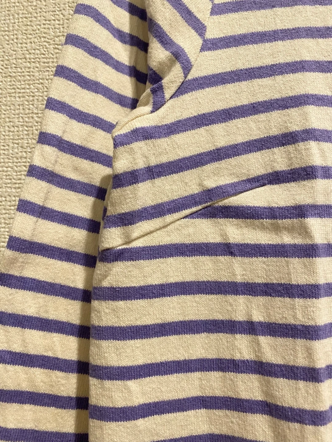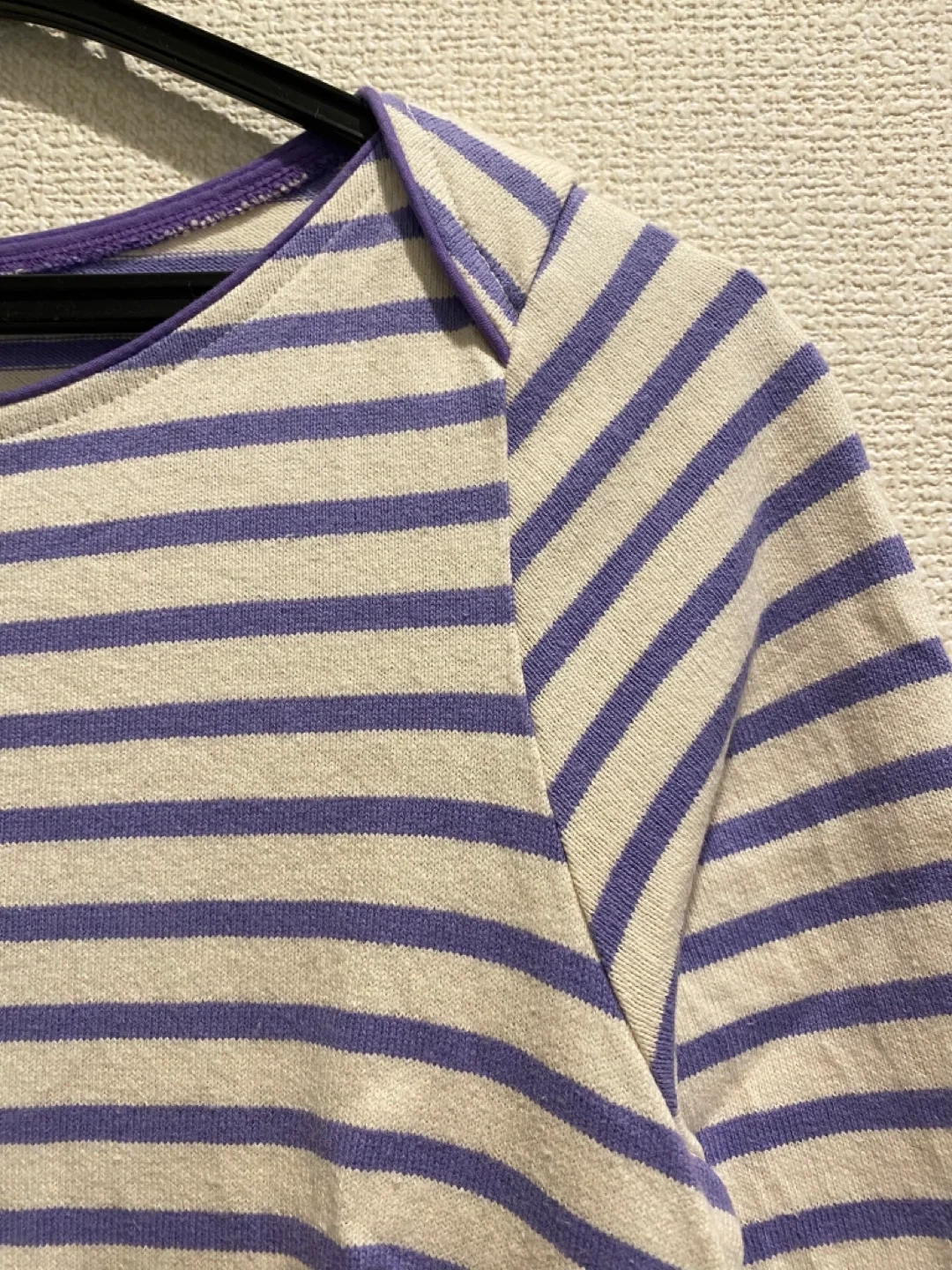 張りのある綿素材、薄いパープルとアイボリーのボーダー柄の膝丈ワンピースです。 購入後、数回部屋着として着用しました。型崩れなどなくシミ汚れも無いようです。 自宅でお洗濯済みです。柔軟剤は使用していません。 肩幅:36cm 身幅:45cm 着丈:86cm 袖丈:55cm 目黒駅でも引き渡し可能です。 柄···ボーダー 季節···春夏 季節···秋冬 汚れ・破れ・臭いなどなし