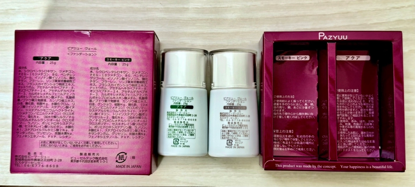 Pazyuu Veil+ リキッドファンデーション 25g x 2 撮影のため、箱は開封しましたが、完全未使用 新品の美品です。 2種類のリキッドファンデーション、 アクアとスモーキーピンクのセットです。 刺激の強い物は入っておらず、 ほぼ美容液成分で作られてます。 ご使用前に良く振ってからお顔全体に伸ばして ご使用下さい。 アクア→ スモーキーピンクの順に塗ると良いです。 詳しく使用方法は、お写真を参照下さい。 定価は、15000円+消費税です。 - ブランド: Pazyuu - 商品名: Veil+ - 内容量: 25g x 2 - タイプ: リキッドファンデーション - カラー: スモーキーピンク - カラー: ピアニストピンク ※注意……購入手続きまでに一度コメント下さい。宜しくお願いします。 ※他の出品物とのまとめ買い大歓迎です♪まとめ買い値引き致します。コメント下さい。 ※お客様の都合による返品は対応出来ませんので、ご了承下さい。素人管理ですので、神経質な方はご遠慮ください。ご理解頂けるかたにお願い致します。 お待ちしてます。 ~RAIN777~