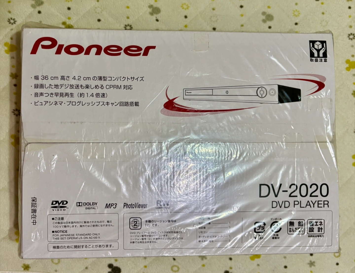 パイオニア DVDプレイヤー 【DV-2020】 【新品・未使用・未開封】 ●幅36cm高さ4.2cmの薄型のコンパクトサイズ ●録画した地デジ放送も楽しめるCPRM対応 ●音声つき早見再生(1.4倍速) ●ピュアシネマ・プログレッシブスキャン回路搭載 ●省エネ設計 付属品 ●取扱説明書 ●保証書 ●リモコン ●オーディオ・ビデオコード ●単4乾電池 ◆BIGカメラにて購入しましたが、購入していたことを忘れておりました。 DV-2020 ブランド:Pioneer