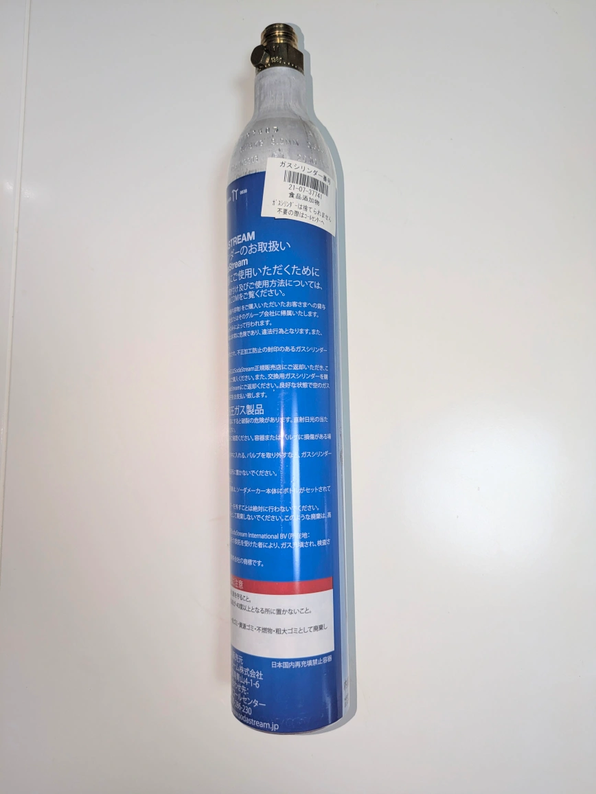 ソーダストリームの空シリンダーです。 こちらの容器を持っていくと、交換としてガスシリンダーが半額で購入できます。 新品を購入するよりも、こちらを購入して近くの取り扱い店舗に交換に行った方がお得です。 炭酸水を作るための60L用ガスボンベ。 - ブランド: sodastream - 容量: 60L - 用途: 炭酸水用ガスボンベ ご覧いただきありがとうございます。