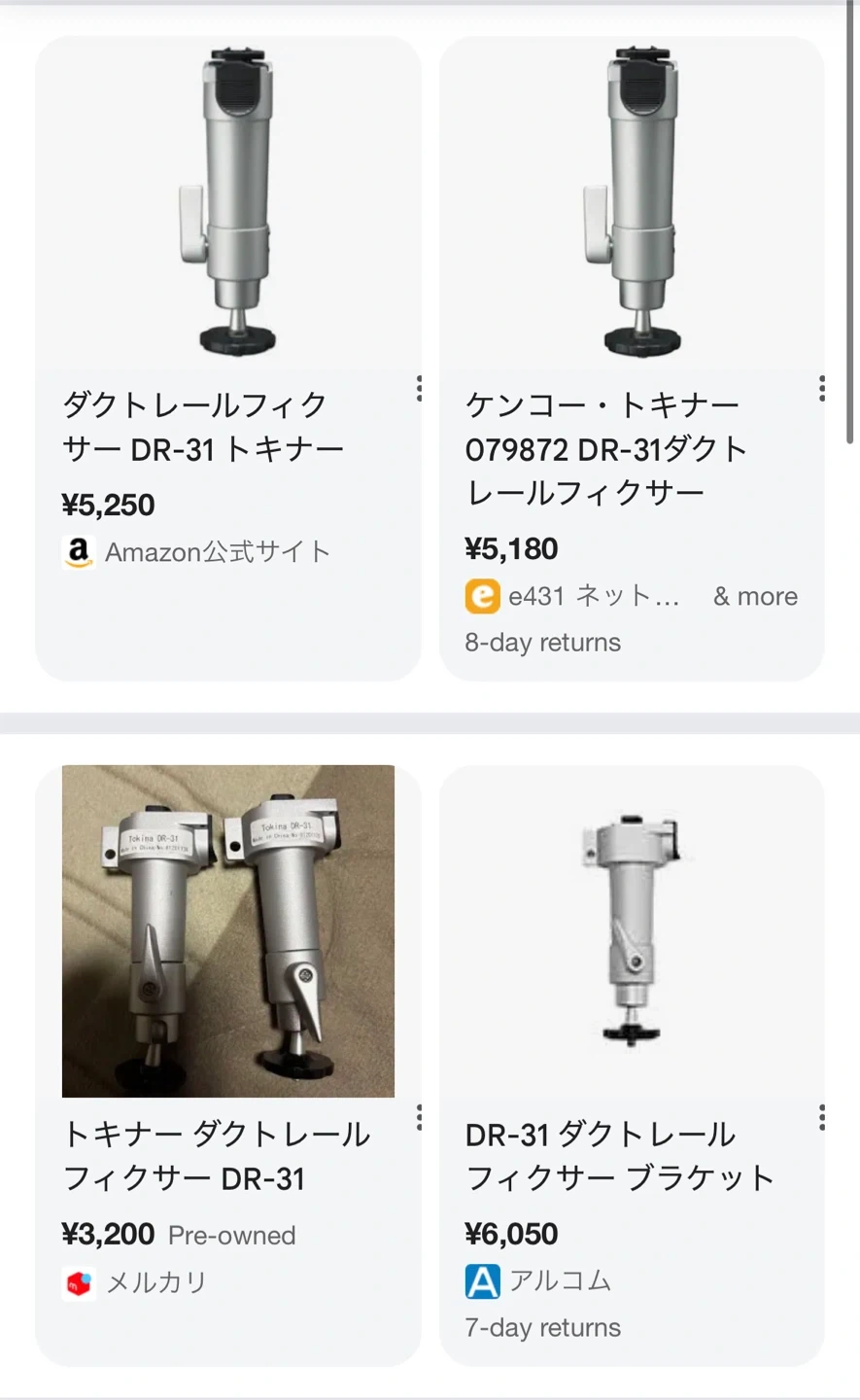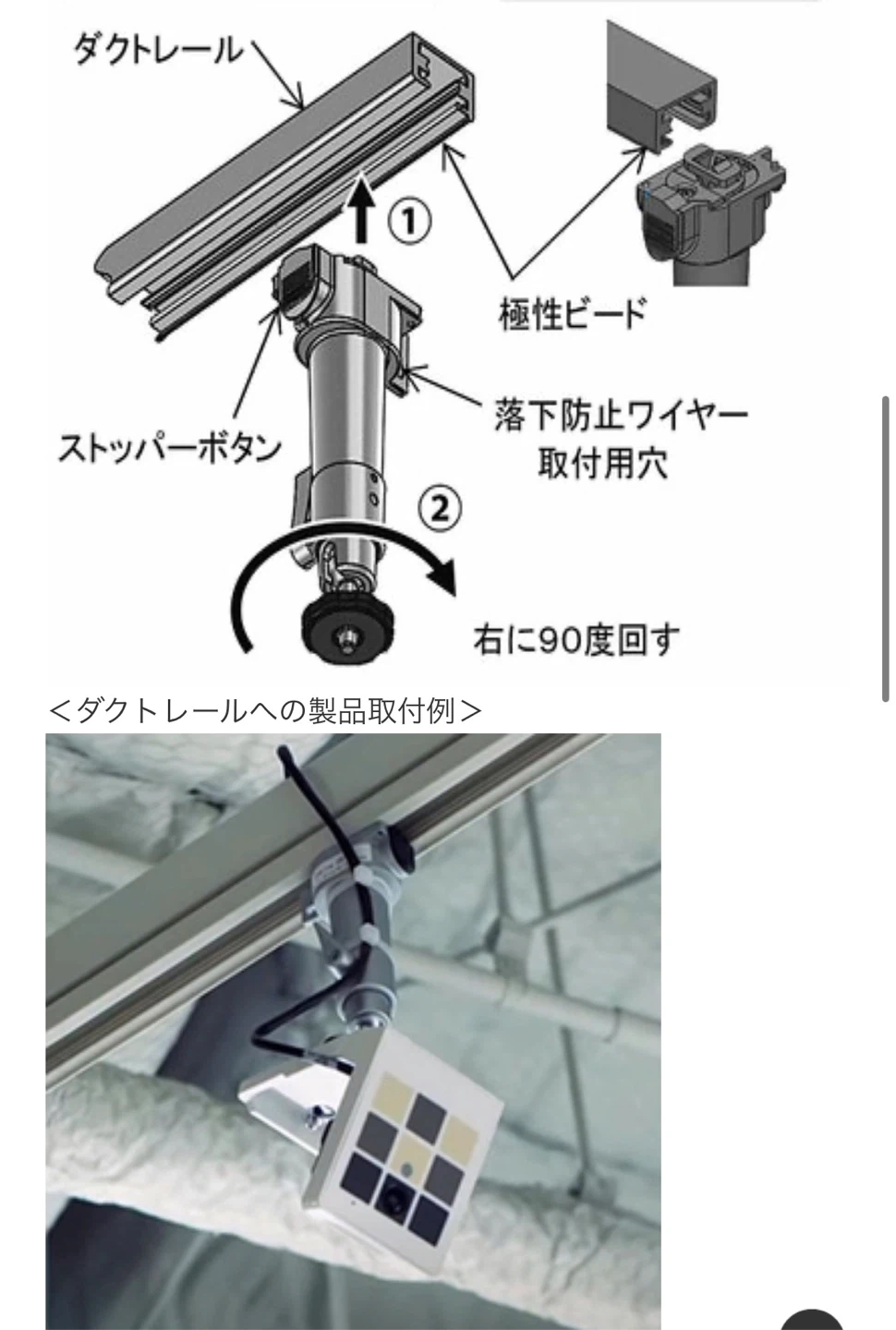 Amazonで5,000円 プロジェクターやカメラ、照明を吊り下げるための器具です。 電源アダプタとセットでの販売となります。 西新宿4丁目までお越しいただける日程をご連絡下さい。 よろしくお願いいたします。 -- ダクトレールフィクサー DR-31 ダクトレール用フィクサー 取付、移動がワンタッチで簡単 角度調整が可能な自由雲台を採用 【特 長】 ◇取付、移動が簡単に ダクトレール(ライティングレール)にワンタッチで簡単取付 工具を使わずCCTVカメラ等の取付が可能に。店舗内のレイアウト変更にも素早く対応 ◇信頼の自由雲台 どの向きにも自由に固定ができる自由雲台を採用。 レバーを締め付けることでワンタッチで簡単にカメラ機器等が固定できます。 一度固定すれば緩むことなく設定したカメラの姿勢を保持します。 ケンコー・トキナーグループ「SLIK」の三脚の技術と、高い品質管理のもと生産しています。 ◇落下防止ワイヤー取付可能 ダクトレール取付ベース部に落下防止ワイヤー取付穴部を設けています。 吊り下げるカメラの落下防止や、フィクサー本体のダクトレールからの落下防止用になどに、ご活用いただけます。
