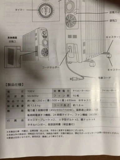 VERSOSオイルヒーター、10枚パネル。 ファン付きで効率的な暖房が可能です。 転居に伴い、出品します。 2016年製。 とくに目立った傷はありません。 熱すぎず、ホワン〜とした柔らかい暖かさです。 上部にあるハンガーに濡れたタオルなどを掛けておくと、加湿が出来ていい感じです。 阿佐ヶ谷北の自宅近くまで受取りに来ていただける方を優先させていただきます。 【希望取引日時】 平日は午前中、もしくは19時〜21時。 土日祝日はご相談です。 中古品のため状態などが目安であることをご了承いただける方のみお問い合わせください。 よろしくおねがいします。 - ブランド: VERSOS - モデル名: VS-3511PH - 機能: ファン付き - パネル数: 10枚