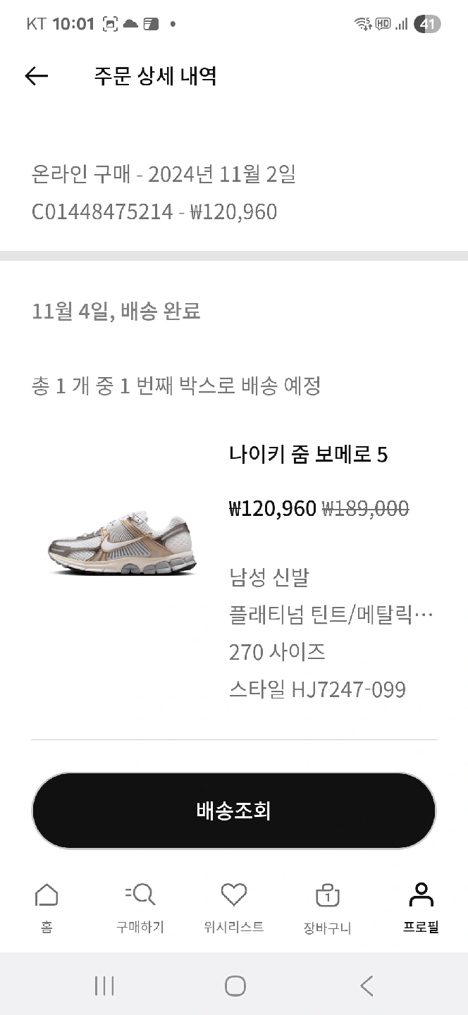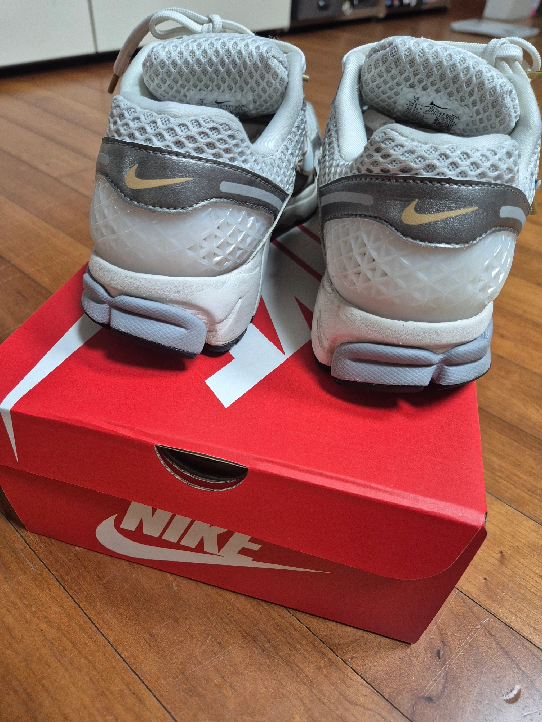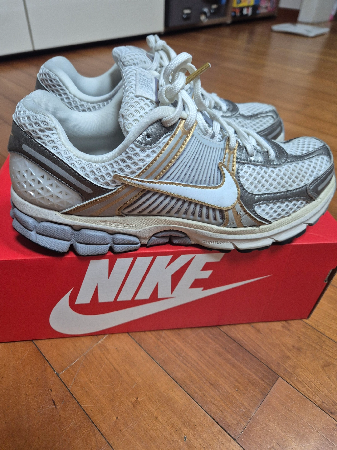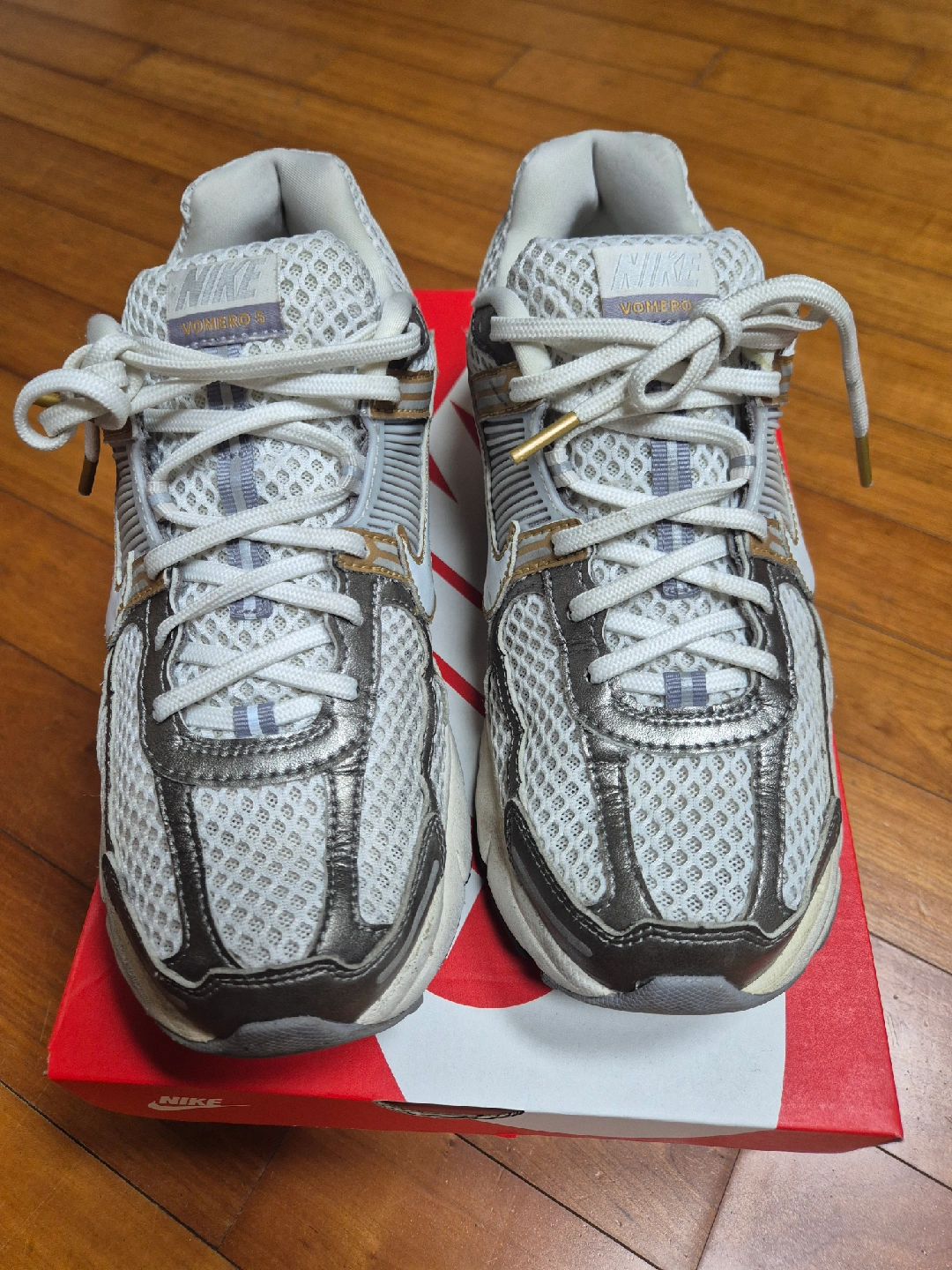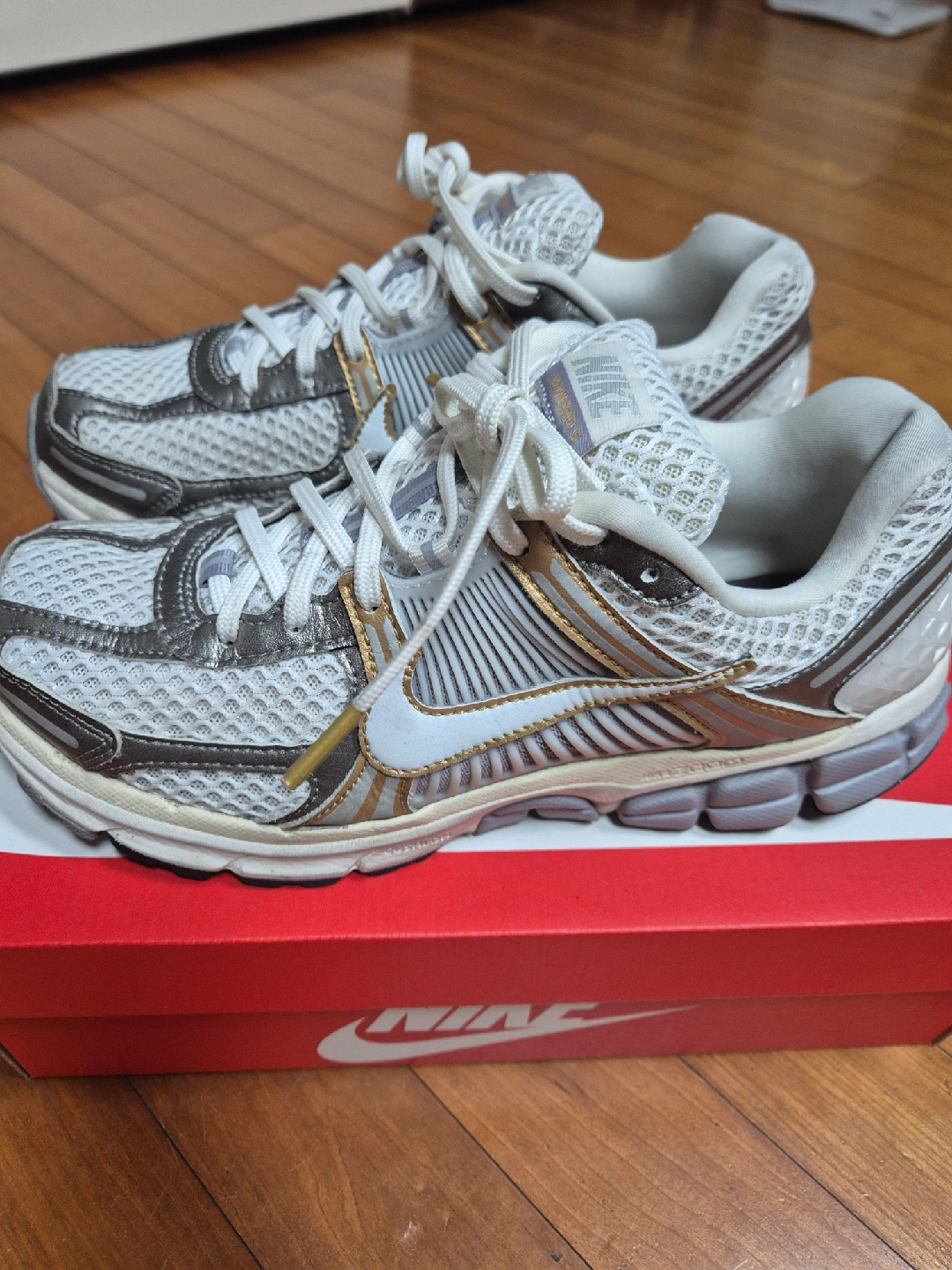 나이키 줌 보메로 5 남성 신발 판매합니다. 플래티넘 틴트/메탈릭 골드 색상이고, 사이즈는 270mm입니다. 구입한지 1년 안되었는데 조금(2개월) 사용하고 발이 커져서 내놓습니다. 공홈에서 구입한 내역이 첫번째 사진입니다. 일반택배(택배비포함)로만 거래합니다.