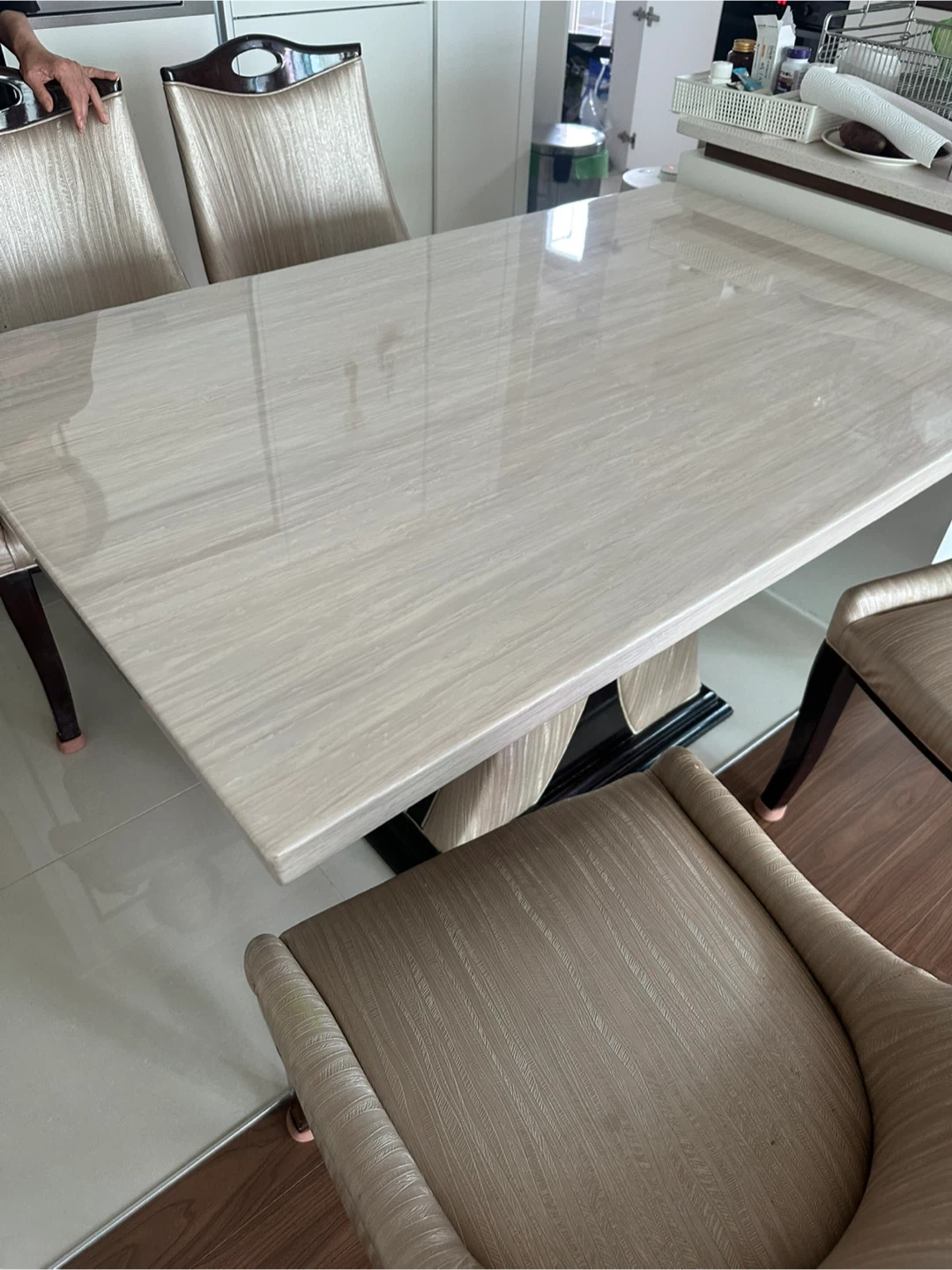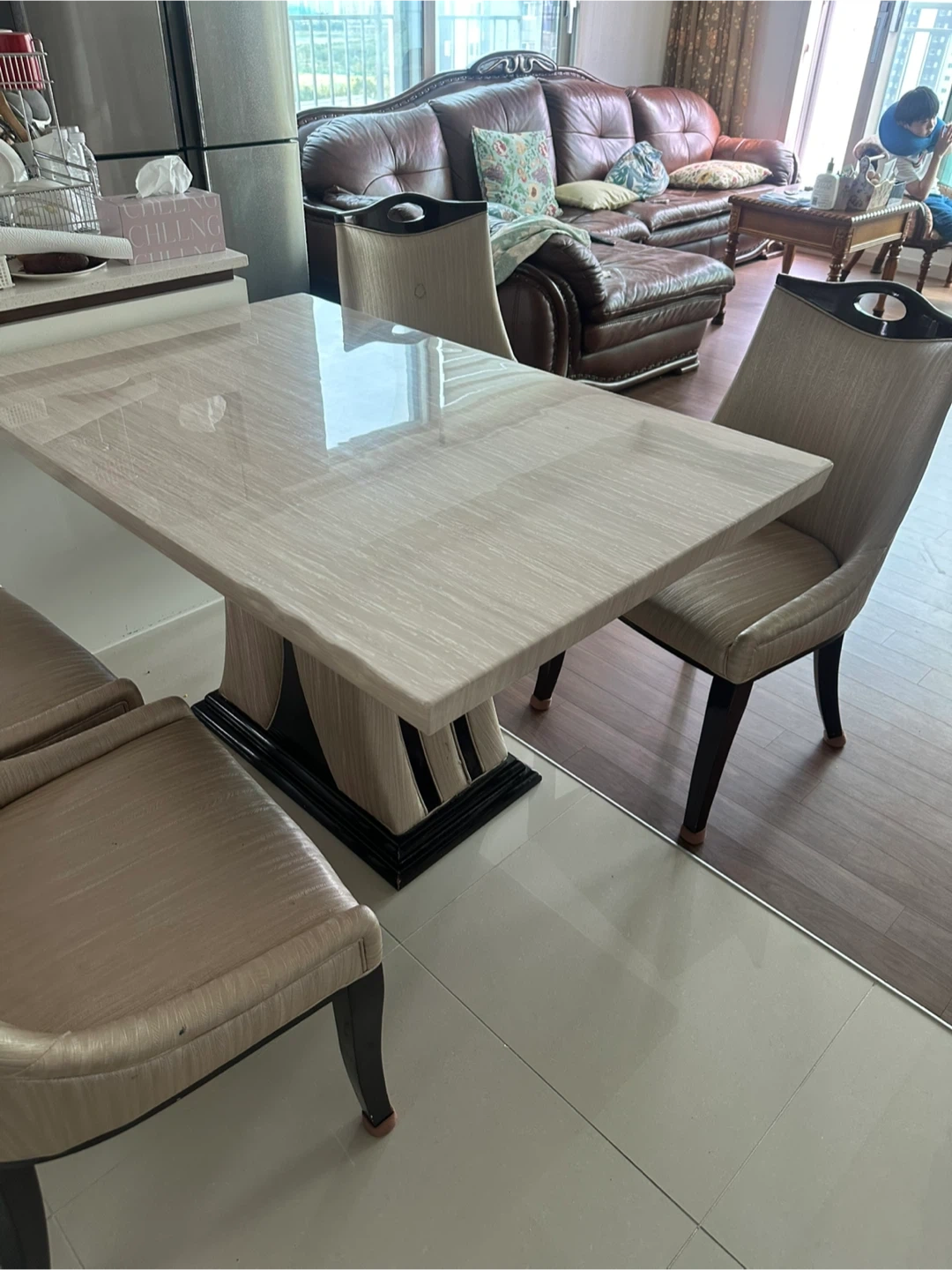 고급스러운 대리석 식탁과 의자 세트 나눔합니다! 식탁 상판은 은은한 무늬가 있는 대리석 또는 유사한 소재로 보입니다. 의자는 편안한 쿠션감과 고급스러운 디자인이 돋보입니다. 전체적으로 상태는 양호합니다.