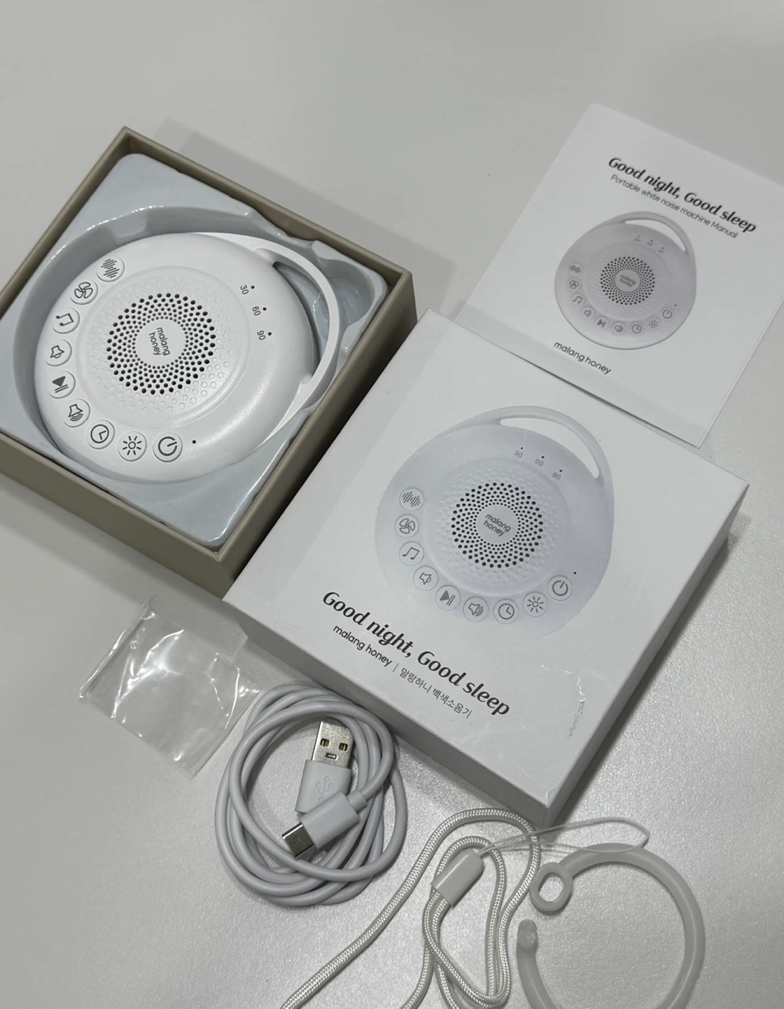 말랑하니 휴대용 백색소음기입니다 - Good night, Good sleep - 화이트 색상 - 박스, USB 케이블, 설명서 포함 아기가 잠들 때나 집중이 필요할 때 사용하기 좋아요 상품에 포함된 Usb케이블은 처음 사용할때부터 간혹 접지 불량이 생기던데 다른 usb케이블로는 충전 잘돼요! 몇번 사용안한 새상품급 컨디션입니다. 제품 불량 감안한 금액입니다. 예민맘,찔러보기, 가격네고요청은 정중히 사양합니다 🙏🏻