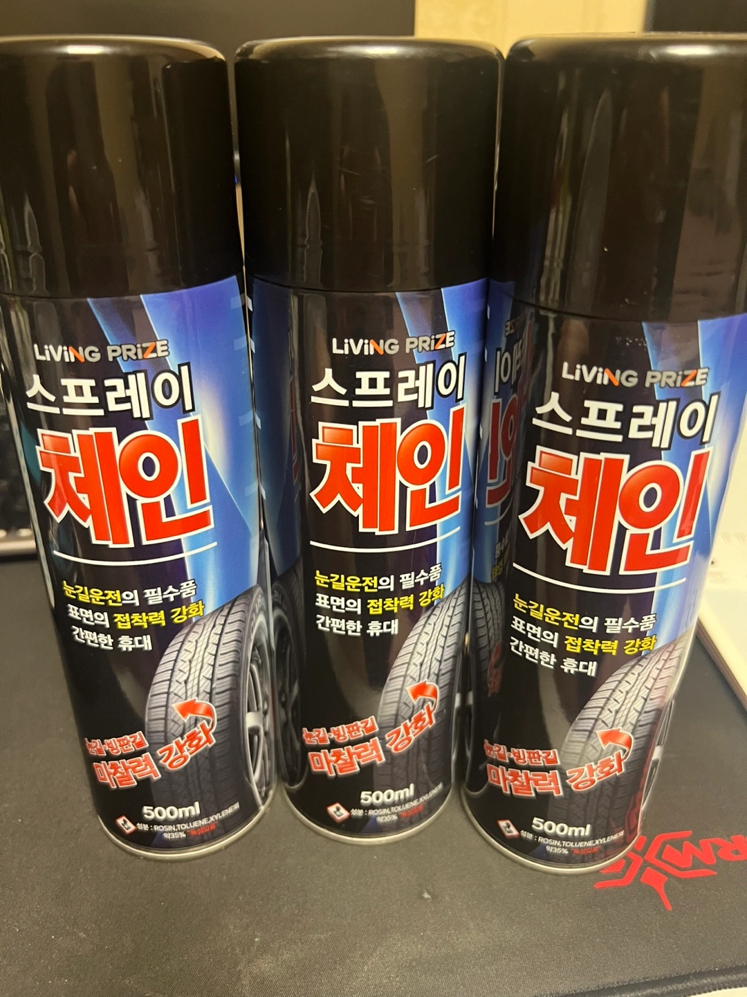 스프레이 체인 3개 팝니다. 개당 3500원 3개전부 사시면 10000원 입니다. 공중에 1초 뿌려본게 끝이라 거의 새제품이고 구매한지 1년정도 된거같습니다. 사용방법은 언덕같은 곳에서 타이어에 뿌리고 올라가면 됩니다. 초보운전때 샀다가 쓰질않아서 팝니다.
