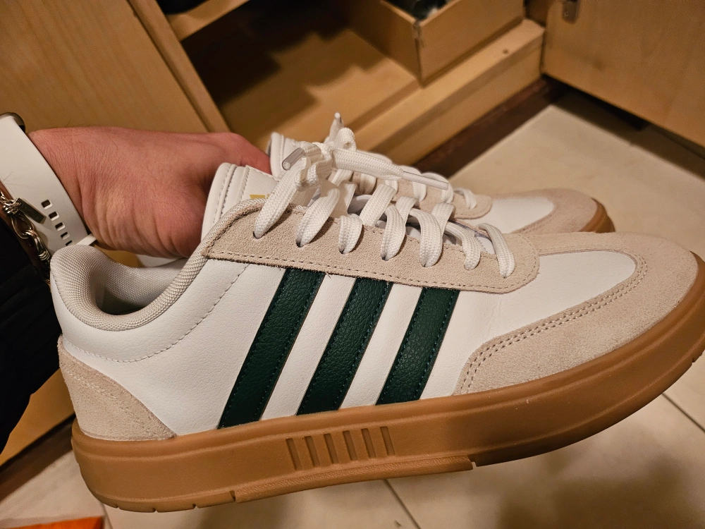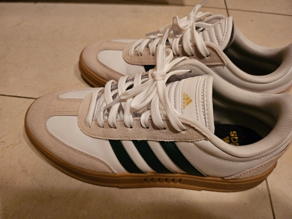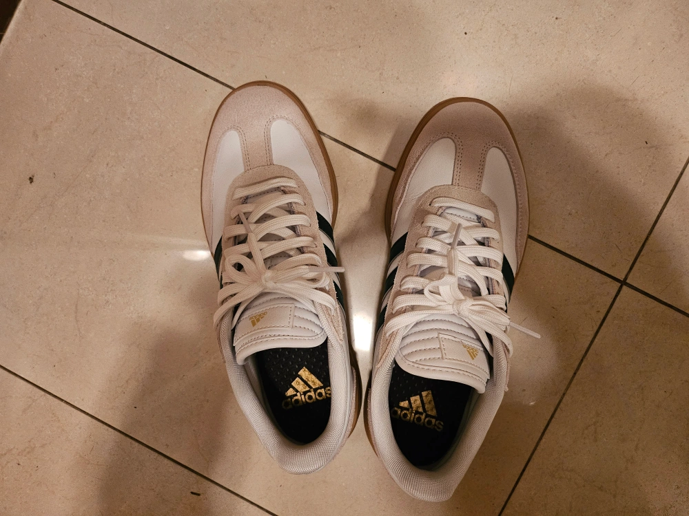 아디다스 운동화(265mm) 그라다스 모델입니다 흰색 바탕에 녹색 삼선이 포인트이며, 밑창은 갈색입니다 스웨이드 재질로 되어있고, 캐주얼하게 코디하기 좋습니다. 2번 신었습니다. 오염된곳 없이 깨끗합니다.