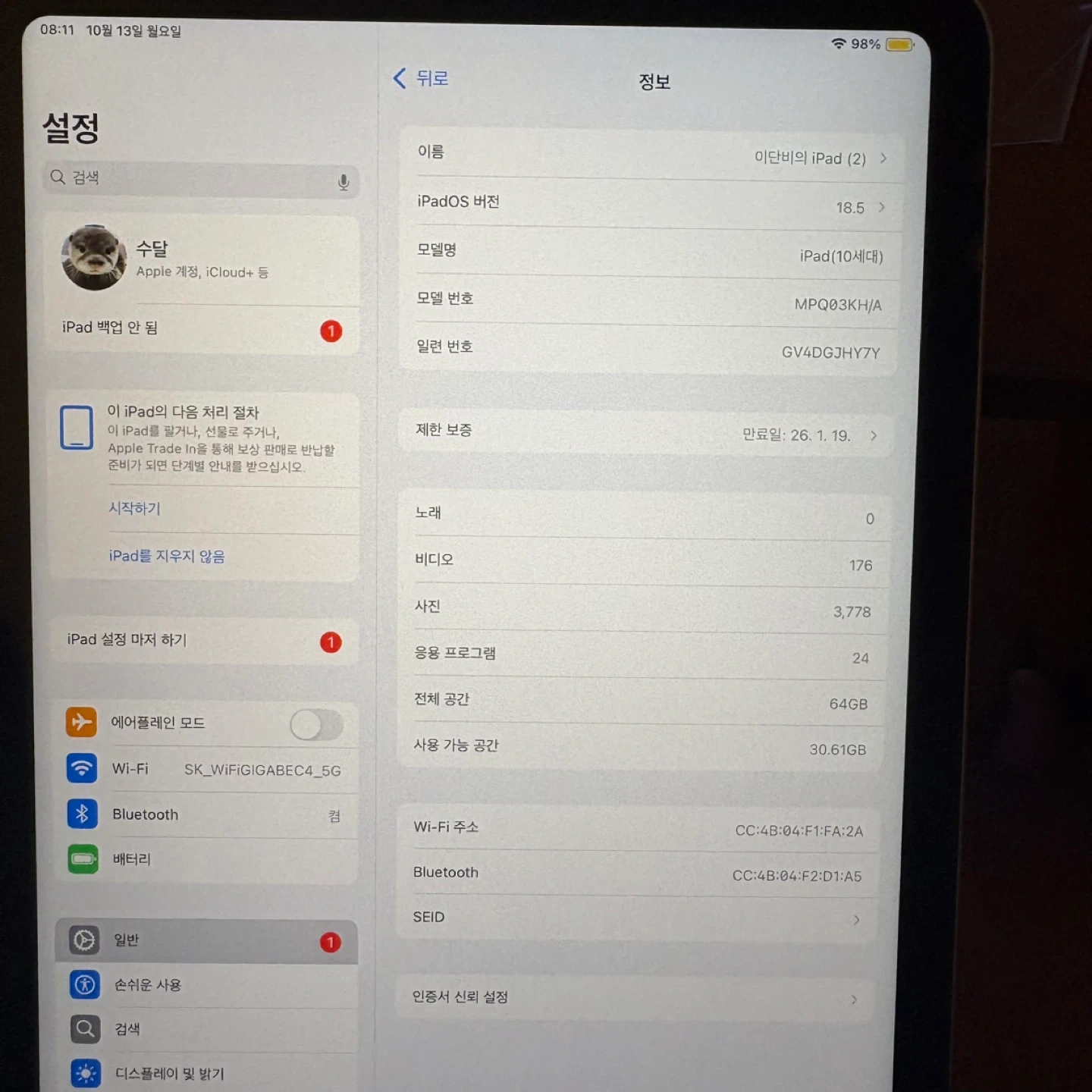 아이패드 10세대 64GB 실버 색상 판매합니다 iPadOS 18.5 버전이며, 제한 보증은 26년 1월 19일까지입니다 애플 펜슬과 키보드 케이스가 포함된 풀구성으로 바로 사용 가능해요 64GB 저장 공간으로 기본적인 작업이나 학습용으로 충분합니다 전반적으로 깨끗하게 사용해서 상태 좋습니다