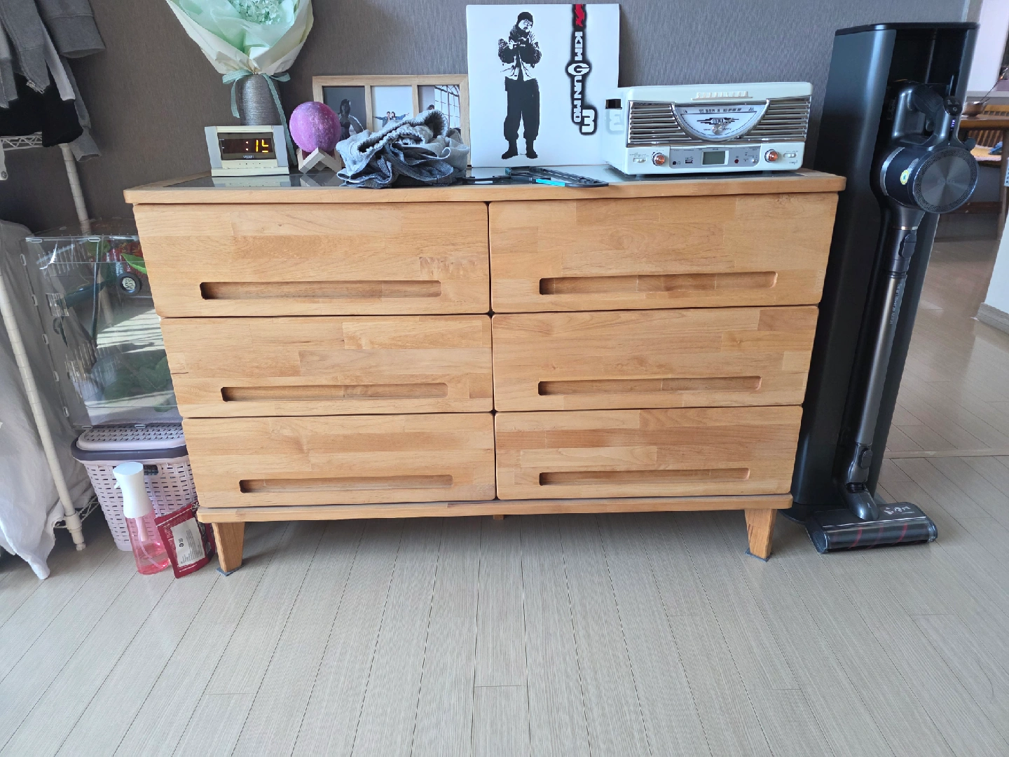 원목 6칸 서랍장입니다 튼튼하고 디자인이 예뻐서 인테리어 효과도 있어요 수납공간이 넉넉해서 옷이나 물건 정리하기에 좋습니다