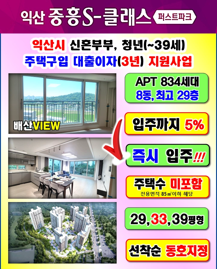 ✔️익산시 신혼부부, 청년(~39세) 주택구입 대출이자(3년) 지원사업 💢APT 834세대 8동. ✔️즉시 입주가능!! 주택수 미포함 전용면적 85m²이하 해당 29,평형 마감임박  33,평형 C타입 무지인가좋아요 39평형 👍선착순 동호지정 ☎️ 상담문의 1660-2364 https://naver.me/FFalWotN ✍️터치시 방문접수(예약)🍓 https://m.blog.naver.com/saepy0909/223907541979