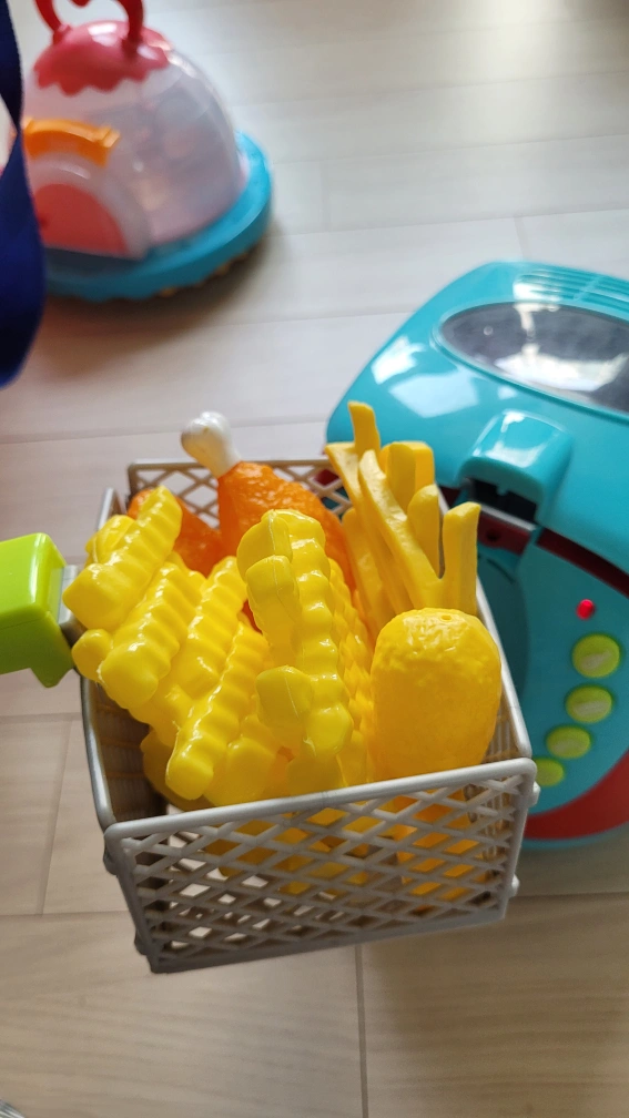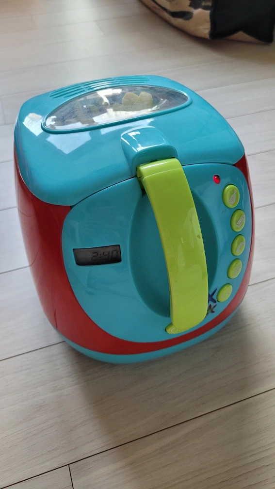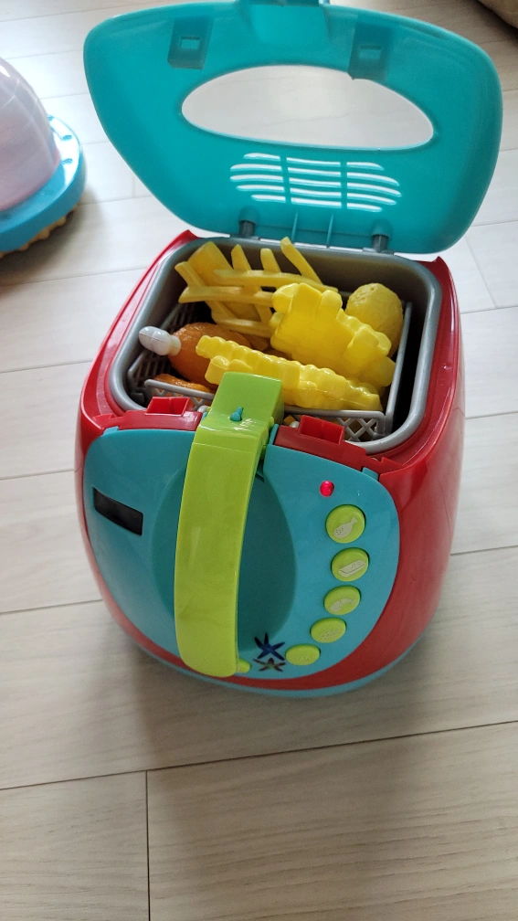 주방놀이 좋아하는 아이들에게 너무 좋은 선물입니다! 상태는 좋은 편이에요~ 안에 튀김은 감자튀김. 닭다리. 치즈튀김.새우튀김 등이 있어요! 버튼 네개중에 아무거나 누른 후, 제일 아래(다섯번째 버튼) 버튼 누르면 튀김소리가 나면서 요리가 시작돼요. 전광판에 남은 시간도 카운트다운 되고, 시간이 다되면 요리가 끝나요. 그럼 오픈버튼 눌러서 열면됩니다.