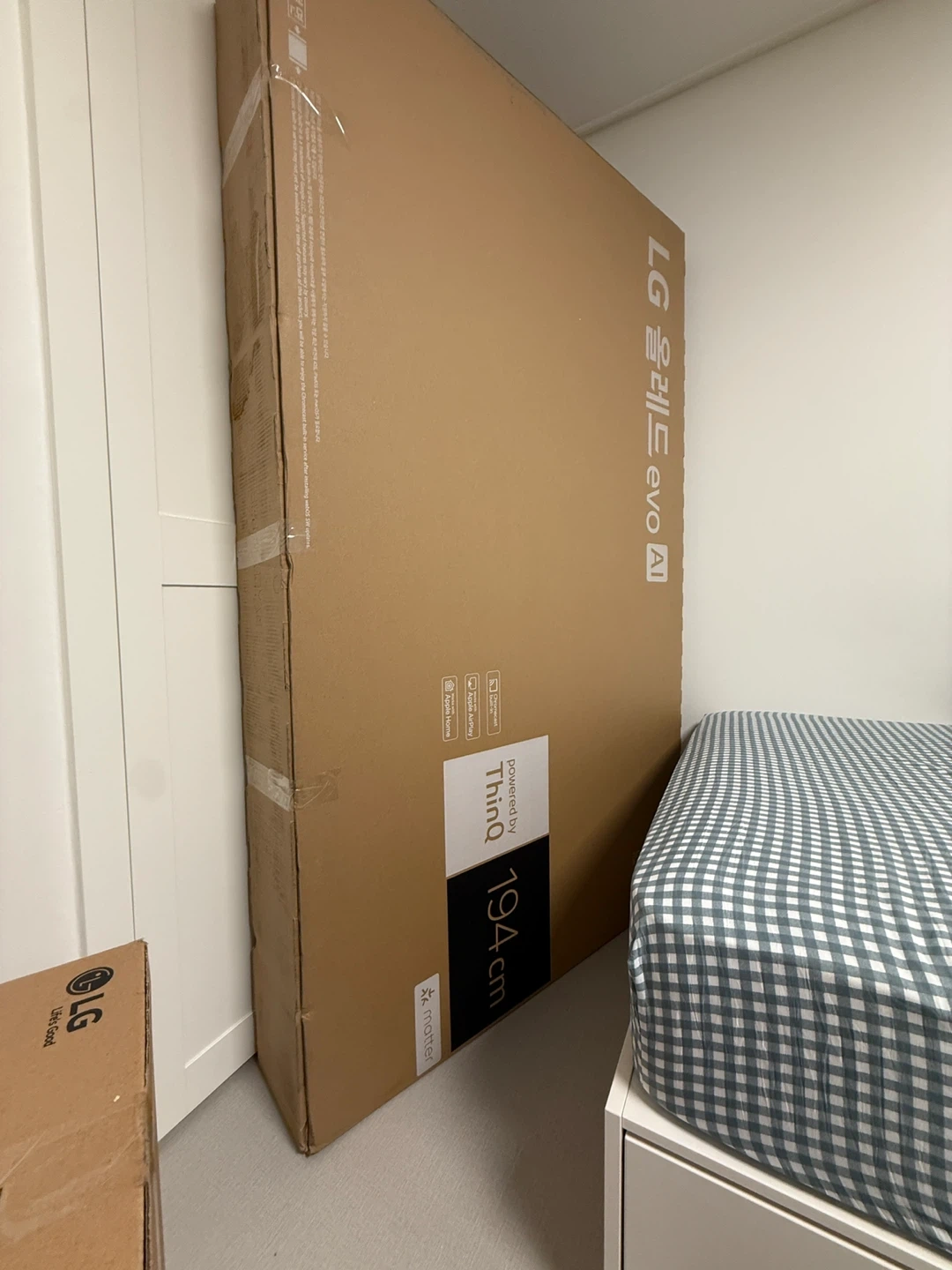 LG 올레드 evo 4K TV 박스째 새 제품입니다. 모델명 OLED77C4SNA입니다. 스탠드형이고 부품은 다른 박스에 있습니다. 기사님들이 배송오셔서 정상작동 하는거만 확인하고 바로 박스에 넣어놨어요. 크기 때문에 직접 오셔서 픽업하셔야해요 위치는 잠실파크리오아파트입니다.