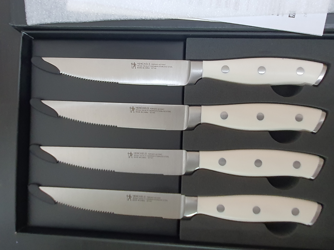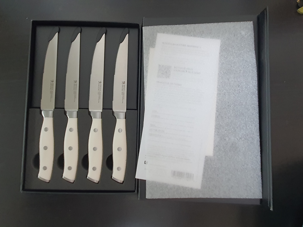 Hello ~ I am selling "new in box" 4-piece white Henckels steak knife set ~ Bought for business but never used ~ 2 sets available ~ Pick up in Junggok-Dong (중곡동190-29) Shipping available ~~ If you have any questions, just let me know ~ Regards ~~