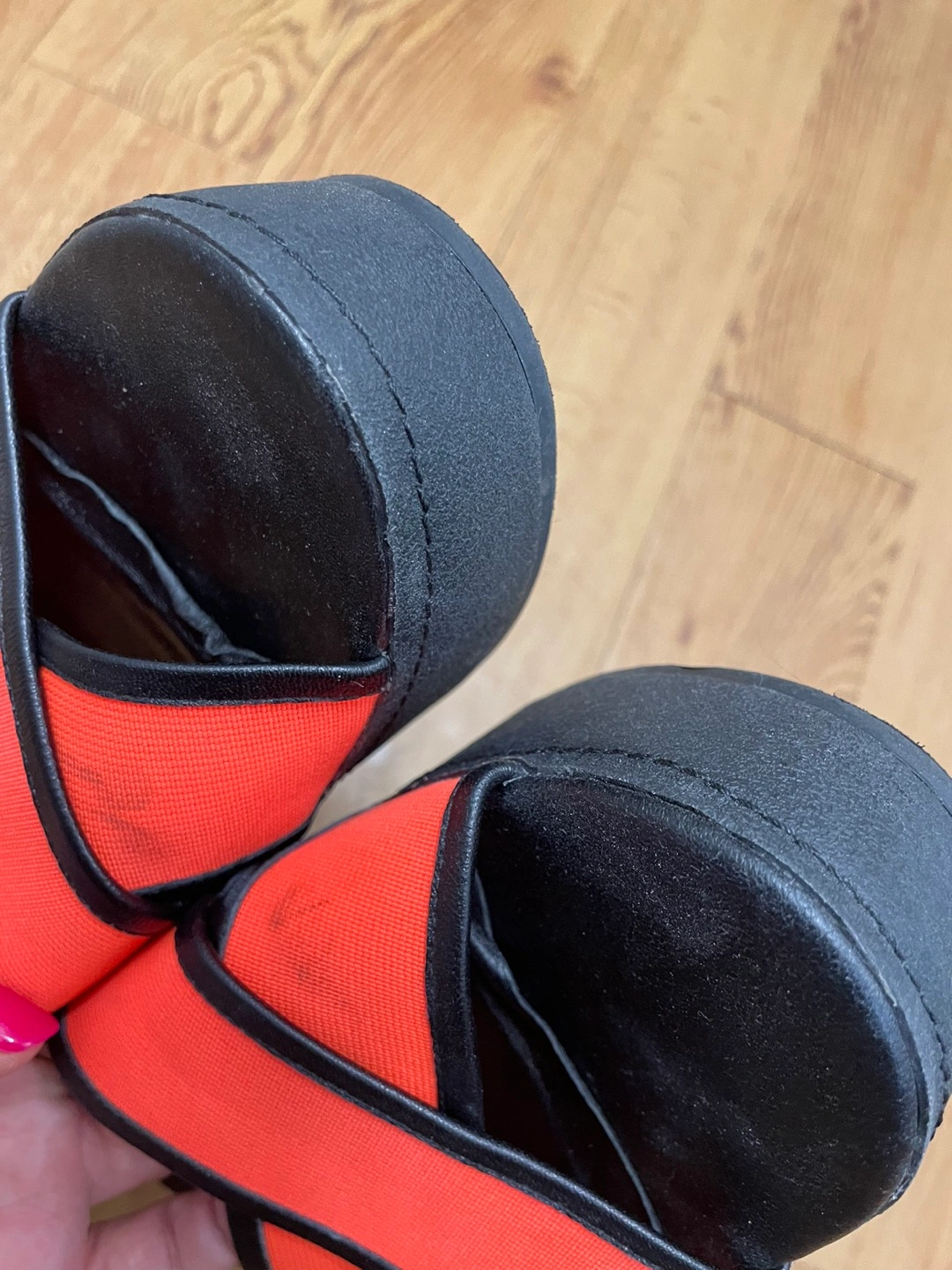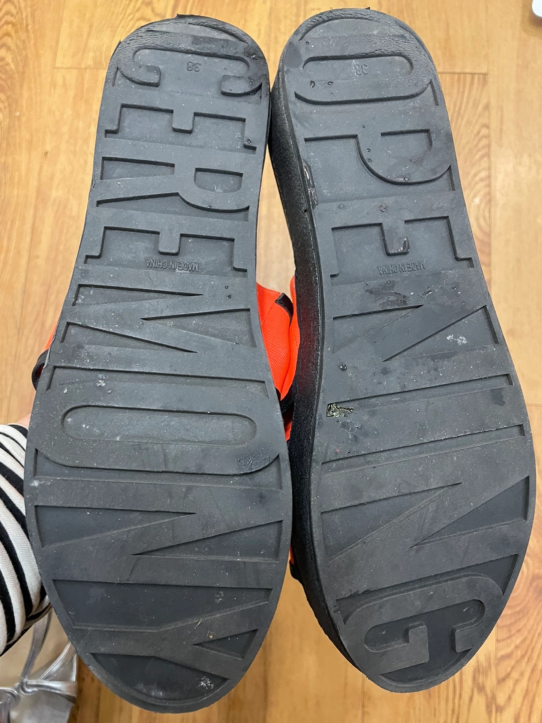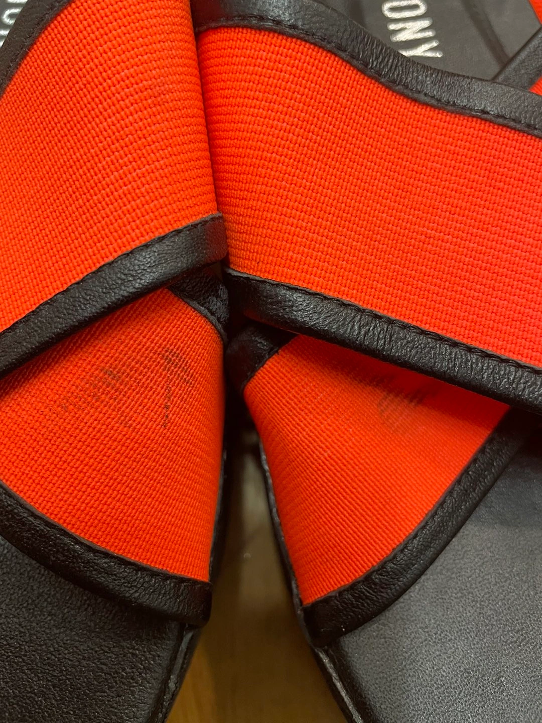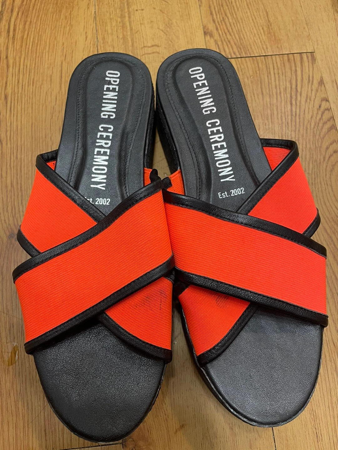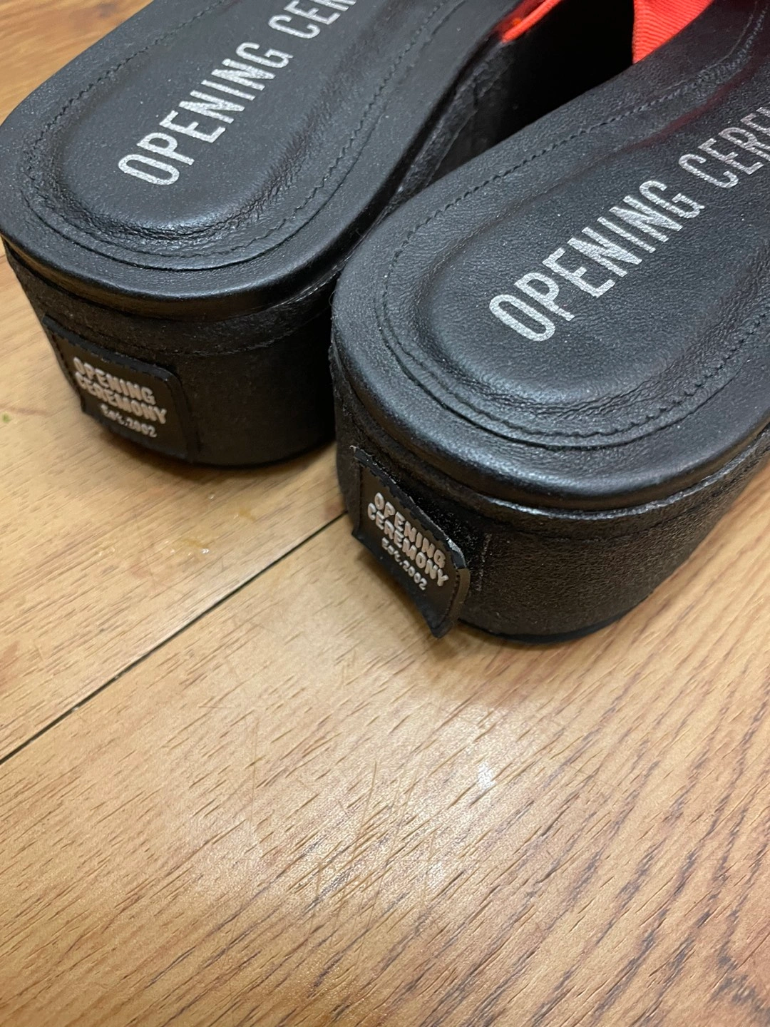 정품 오프닝세레모니 슬리퍼(38)예요 1번 신었는데 보관할 때 오염이랑 뒤에 택이 살짝 떴네요 사진 꼼꼼히 확인 부탁드려요 굽이 5센티정도 되는데 크로스 부분 밴드로 발등도 편하게 맞고 신으면 편해요 쨍한색이라 여름에 이뻐요 판매 안되면 이번 여름에 그냥 제가 신으려구요 예민하신 분들은 마음에 안 드실 수 있으니 중고 감안하시고 사진 자세히 보시고 관심 있으시면 문의주세요 착용횟수가 1회라 에눌은 힘들것 같아요 ㅜㅜ 교환 반품 환불 불가해요!!