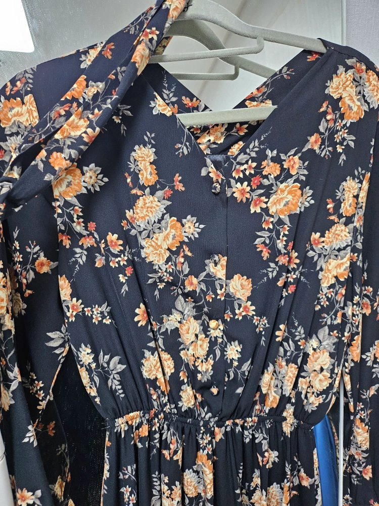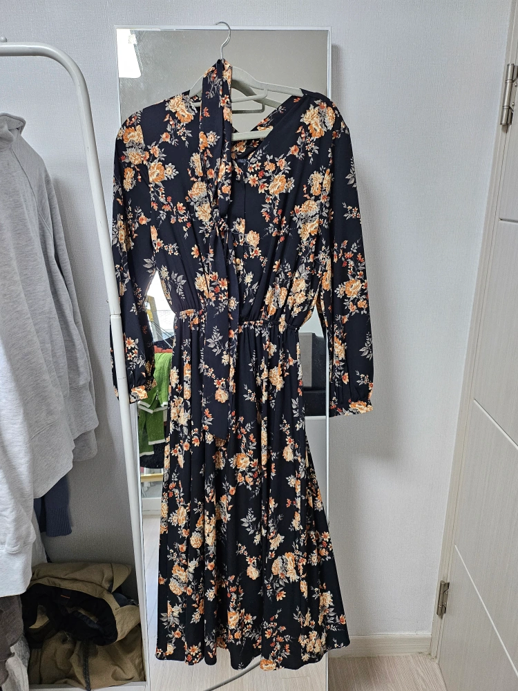 플라워 패턴이 예쁜 롱 원피스입니다! 161/46~7기준 종아리 절반 정도의 길이이고 품은 살짝 넉넉해요. 스카프까지 세트입니다. 사진보다 패턴 색이 아주 조금 따뜻한 색이에요 깨끗 한 상태이지만 입었던 옷이니 예민한 분은 피해주세요 찔러보기/네고 사절 문고리 거래 합니다.