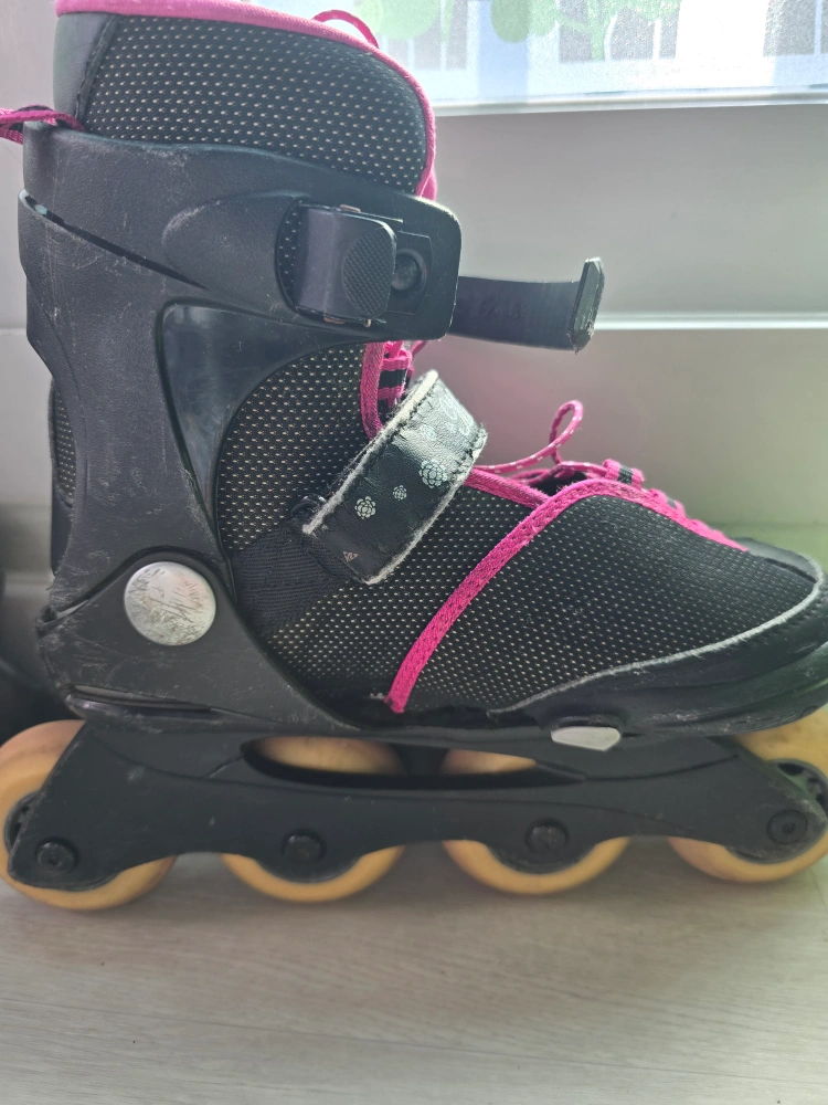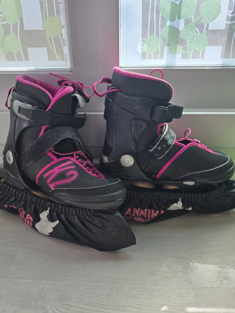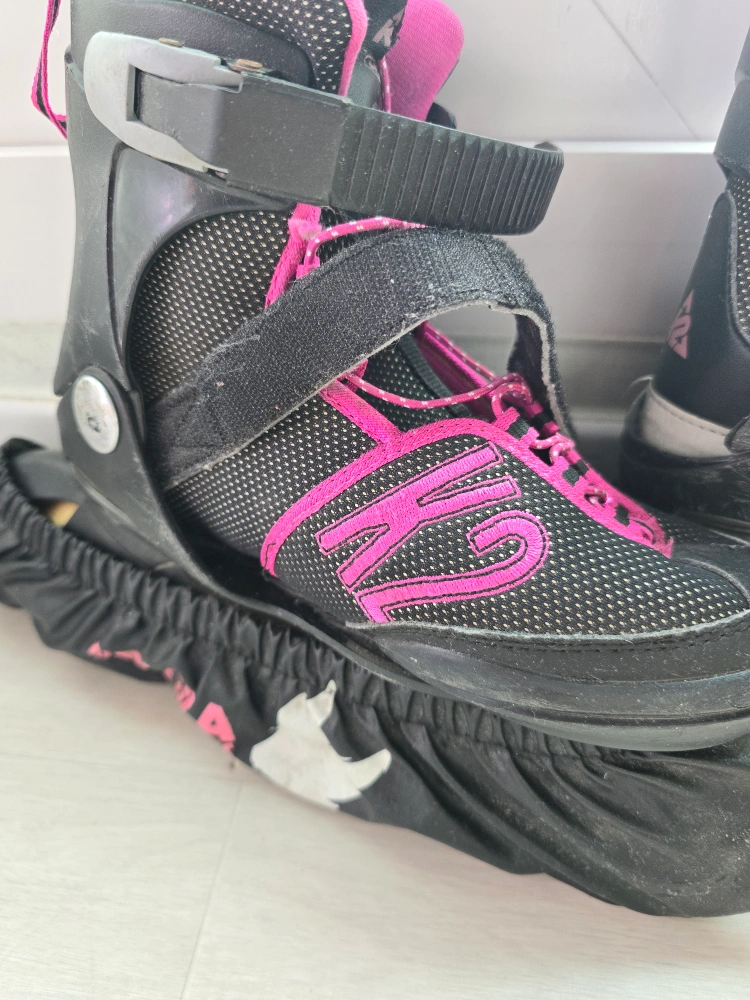 K2 인라인스케이트화입니다. 195~230까지 조절됩니다. 사용감 적당히 있고 발주머니와 가방 있습니다.